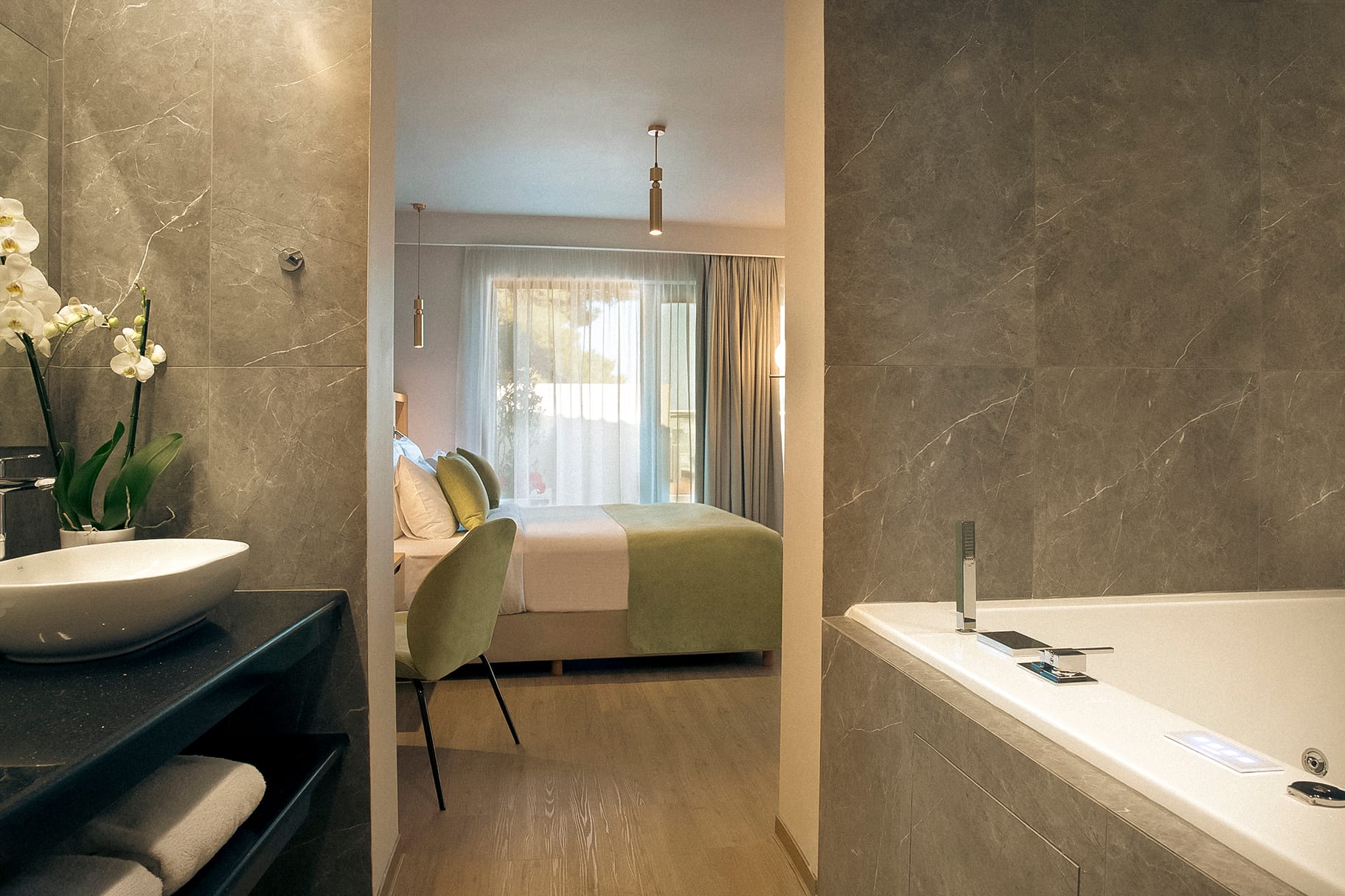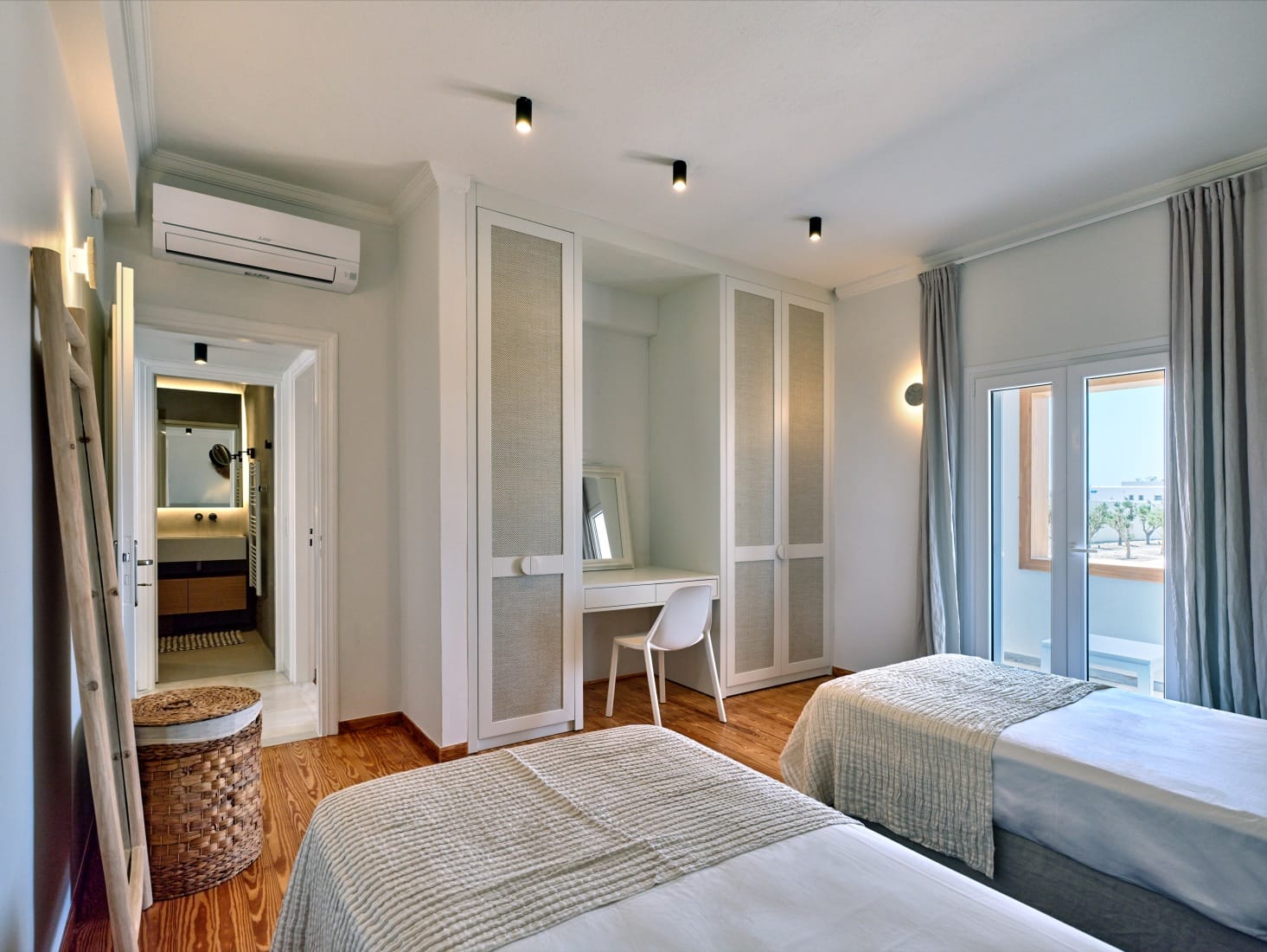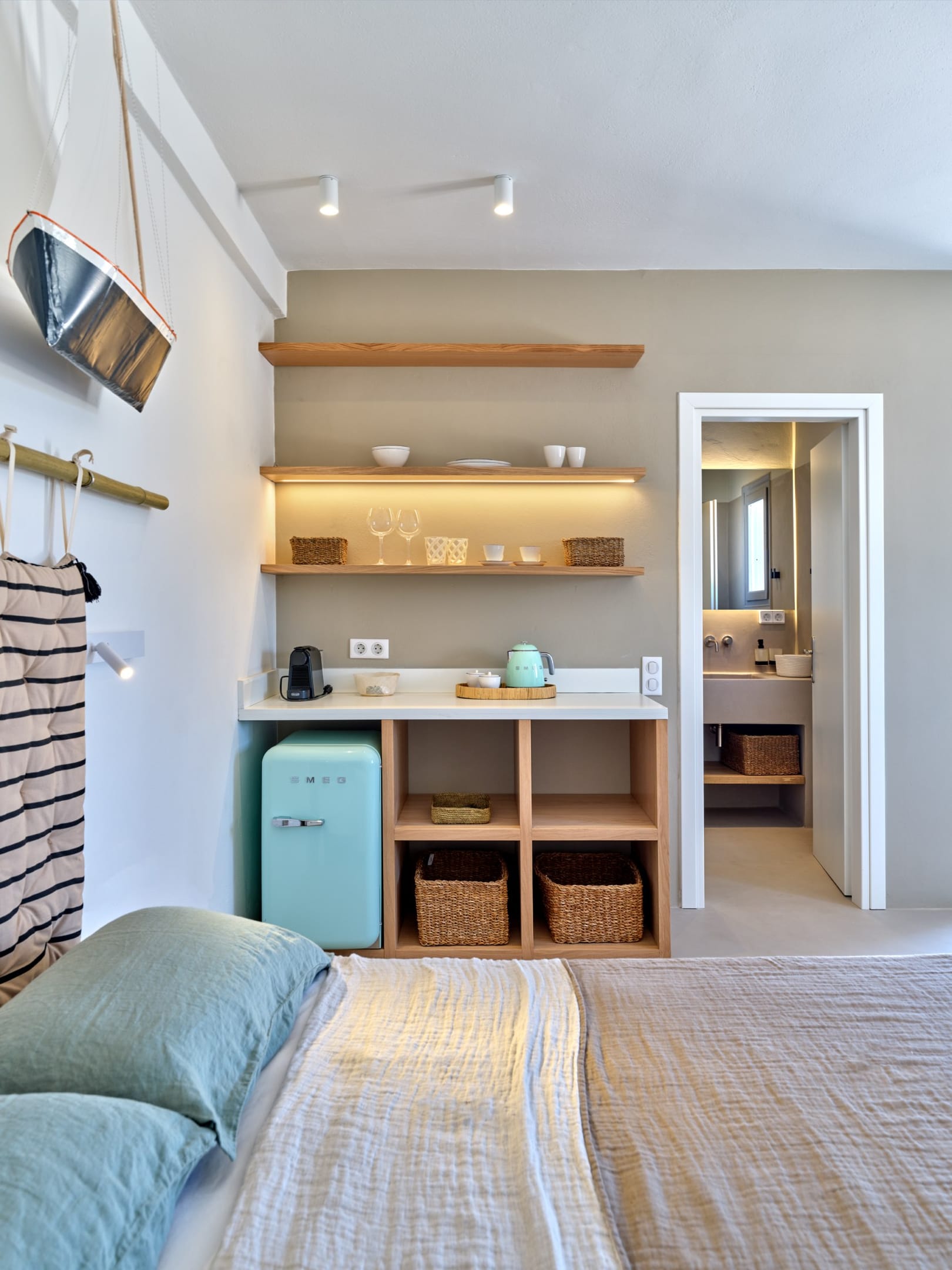 All guest rooms are inspired by Paros’ cycladic architecture with modern, sleek lines and minimalist elements. Each room has a Nespresso machine, a set of plates, cups, glasses, and utensils, a Smeg fridge and kettle, pool towels, beach towels, a hair dryer, and heated towel rack. The rooms are equipped with reading lights, Wifi, USB power outlets, and air conditioning.