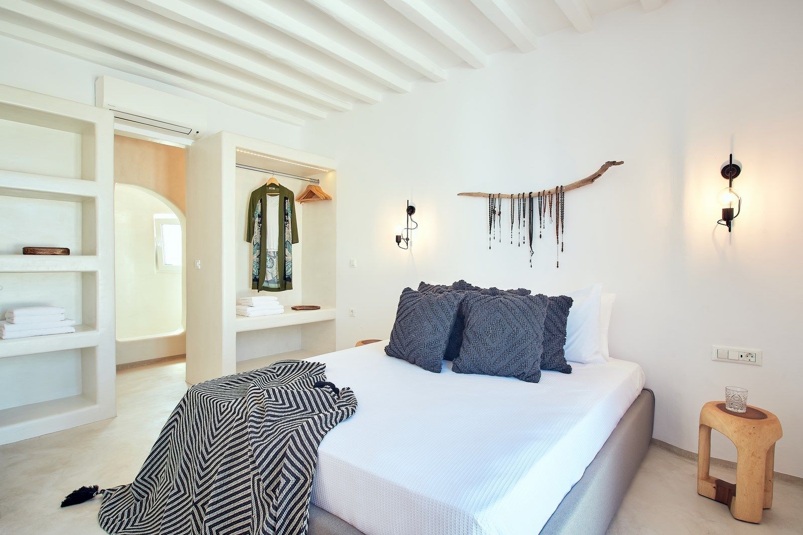 On the upper floor, there is a double bedroom with a queen bed, a bathroom with shower and a balcony with overlooking the Aegean Sea and Paroikia Bay.