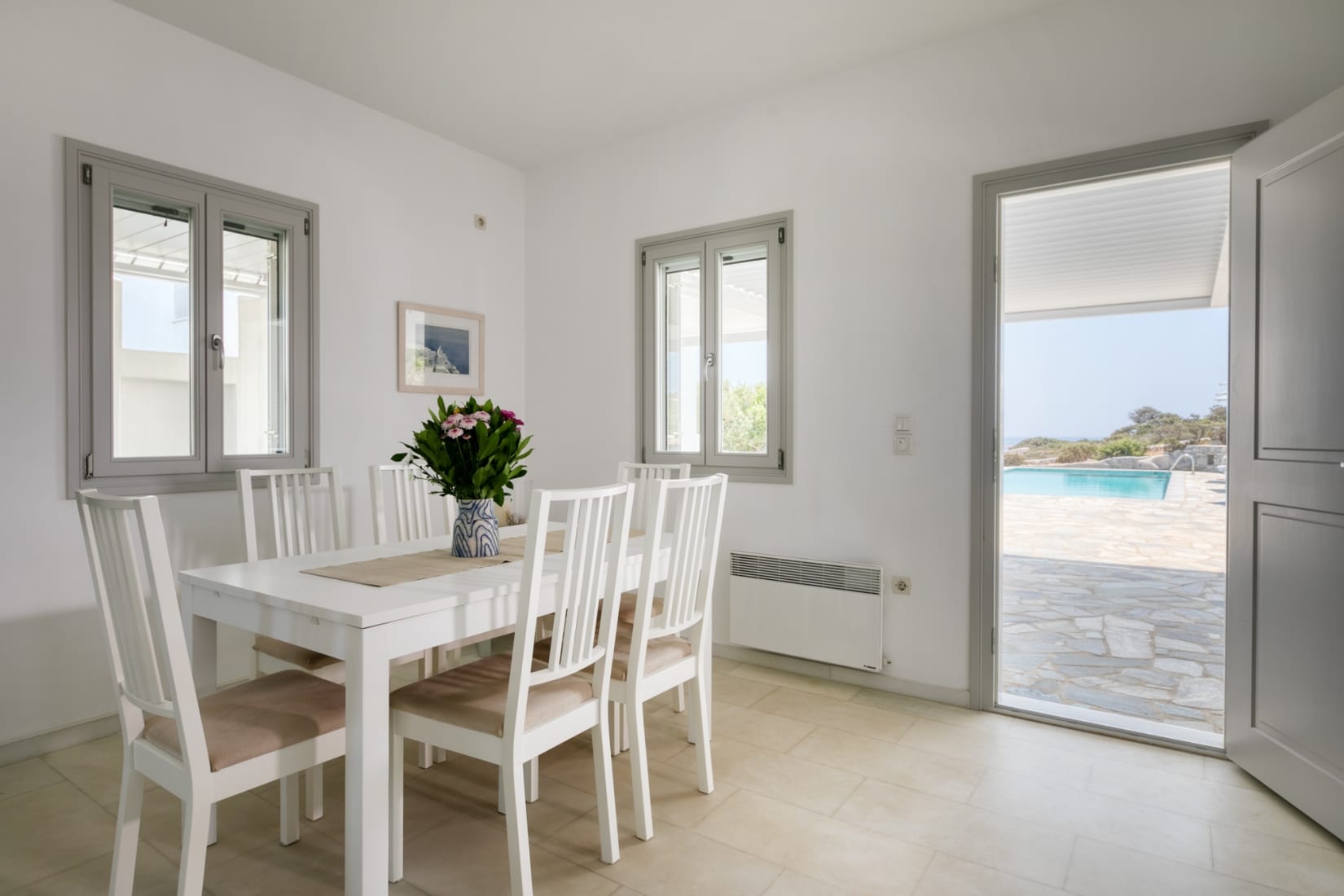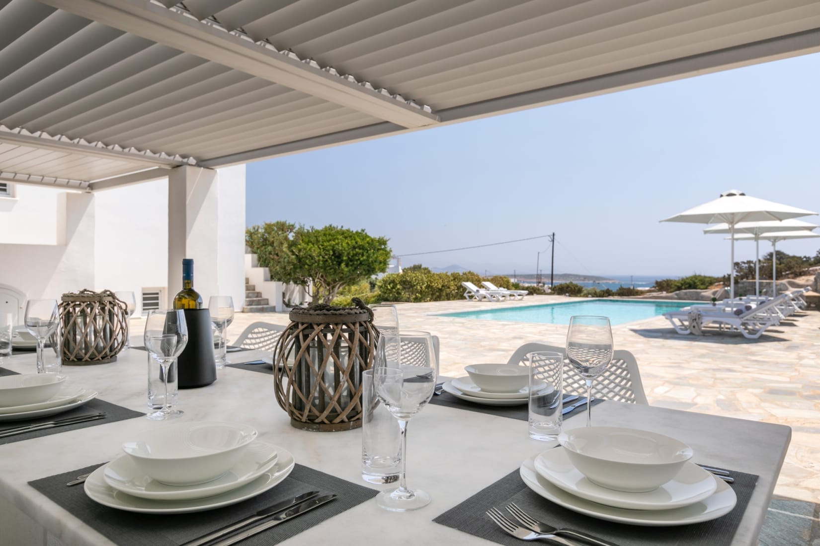 The outdoor area with the private large swimming pool and sunbeds is perfectly harmonized with the environment and creates a peaceful experience through the accommodation. A dining area completes the perfect setup for gatherings or dinner alfresco with your loved ones.