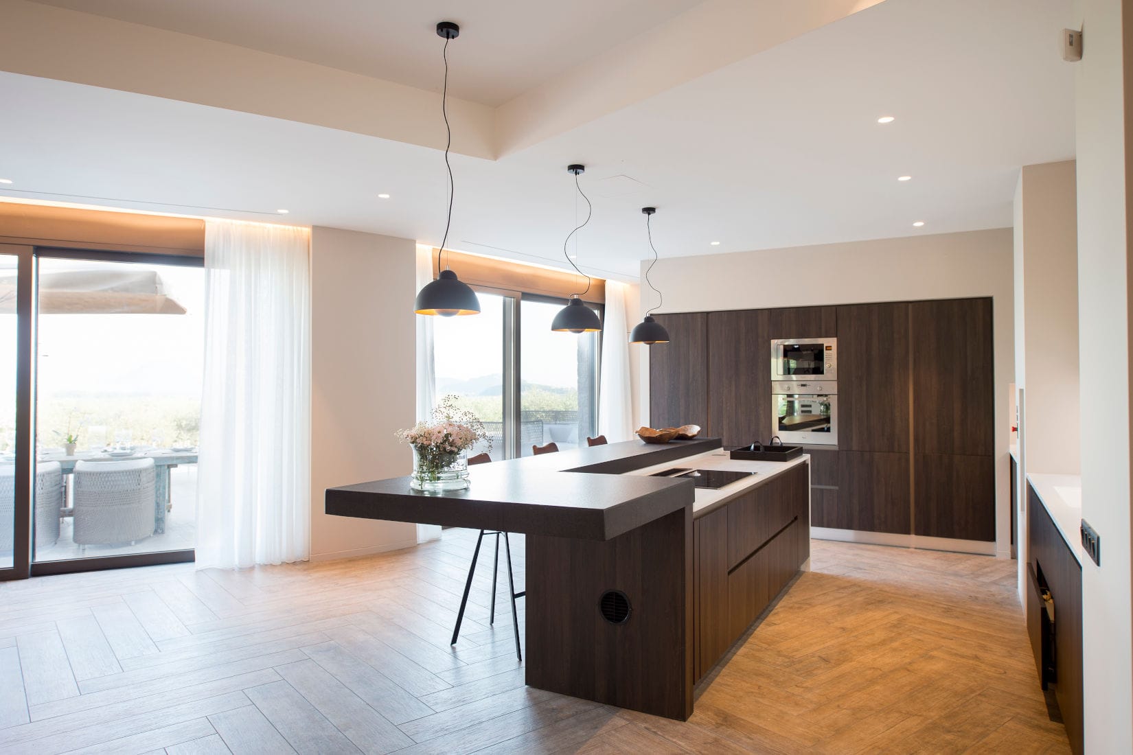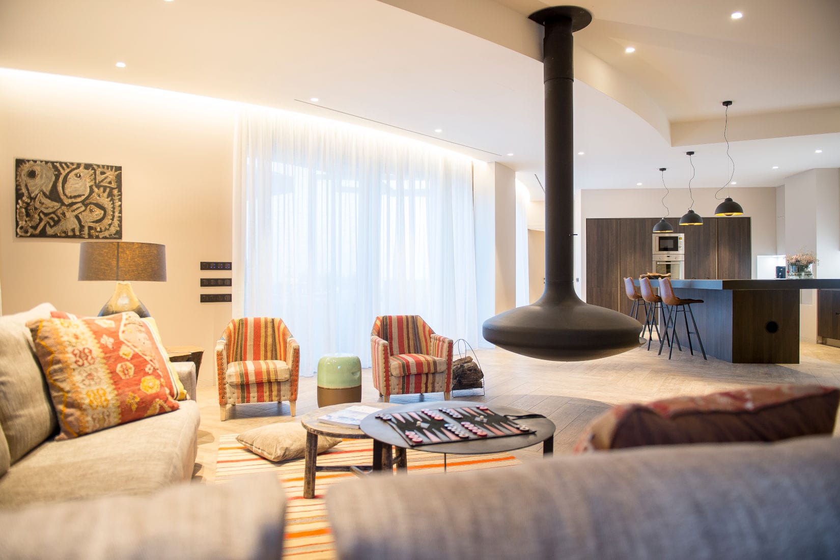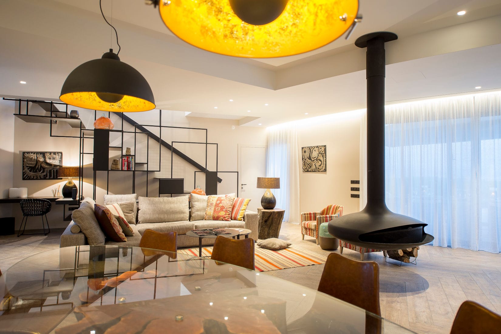 On the ground floor, there is a spacious living room with a self-turning central fireplace with sliding doors leading directly to the pool area, a dining area, a fully equipped kitchen and two bedrooms with King size beds, transformable to 2 single beds instead with ensuite bathrooms with shower, separate walk-in dressings, a large private terrace with access to the pool and view to the sea in dressing, large private terrace, access to the pool and view to the sea.