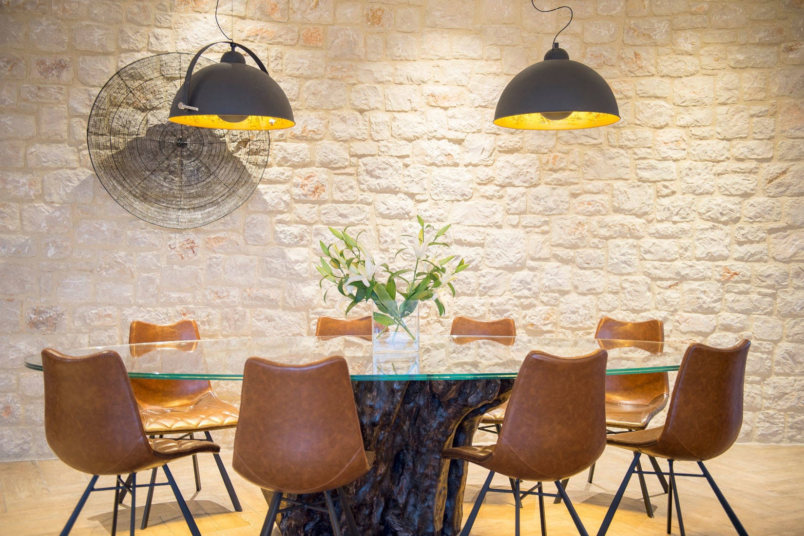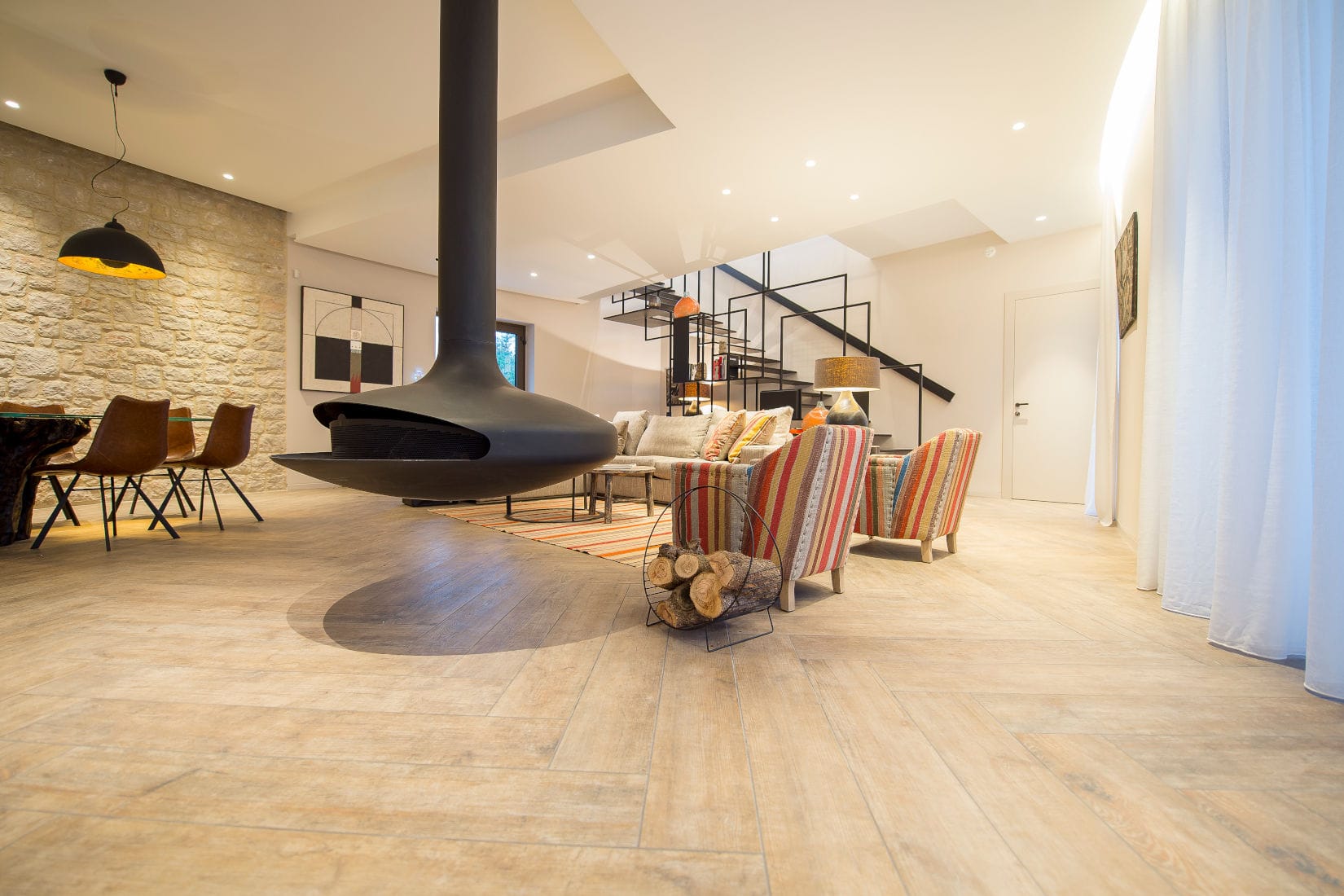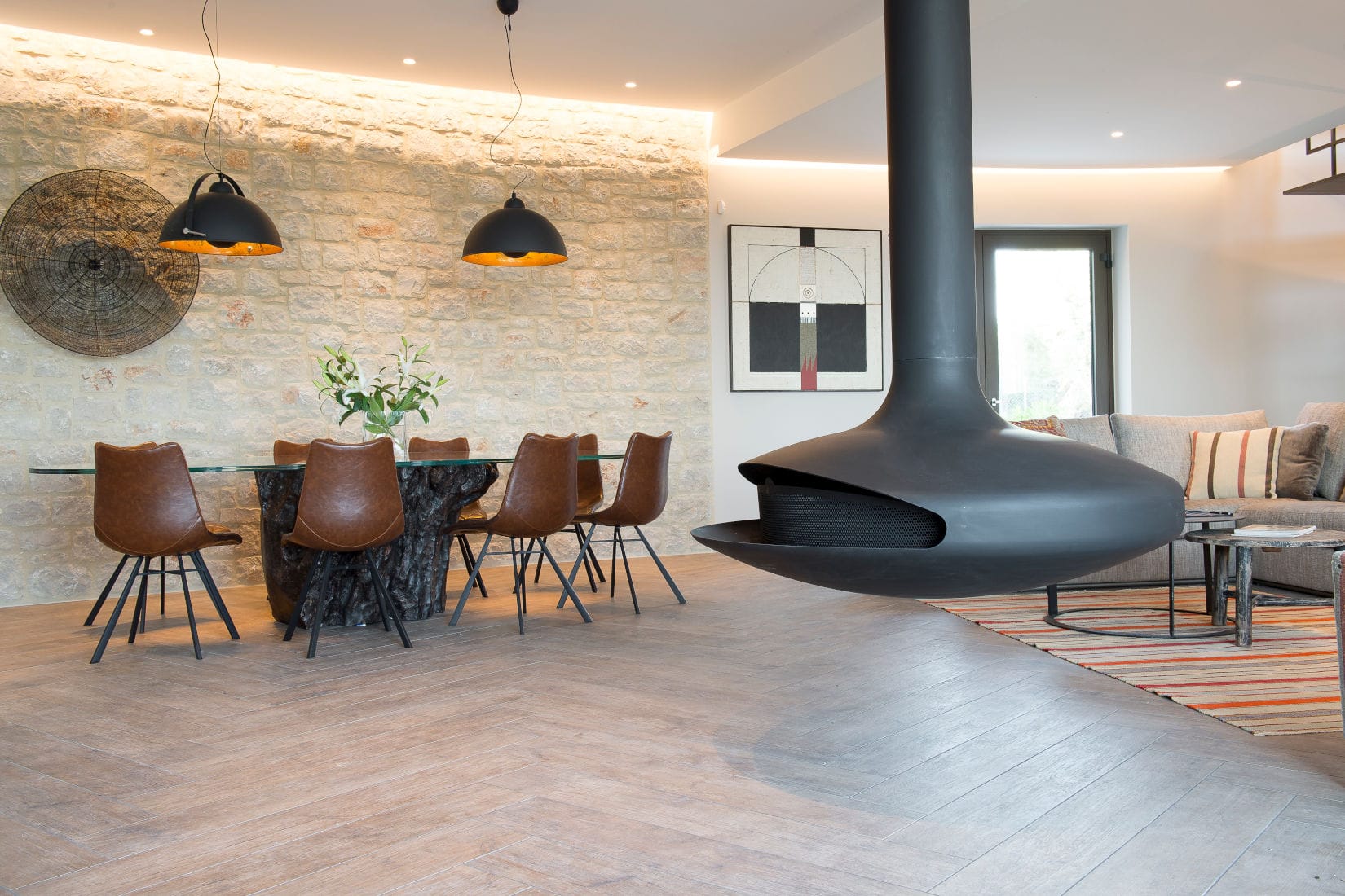 The outdoor area will offer you relaxation and calm moments. With a large infinity Heated/Cooled Private Pool 12 x 5m, a jacuzzi for 5 people, an external covered lounge with fireplace, a dining area for 10 persons and sun beds, a large Playground for your Children, a Yoga area, a BBQ area and huge garden areas with flowers, herbs, and 250 olive trees.