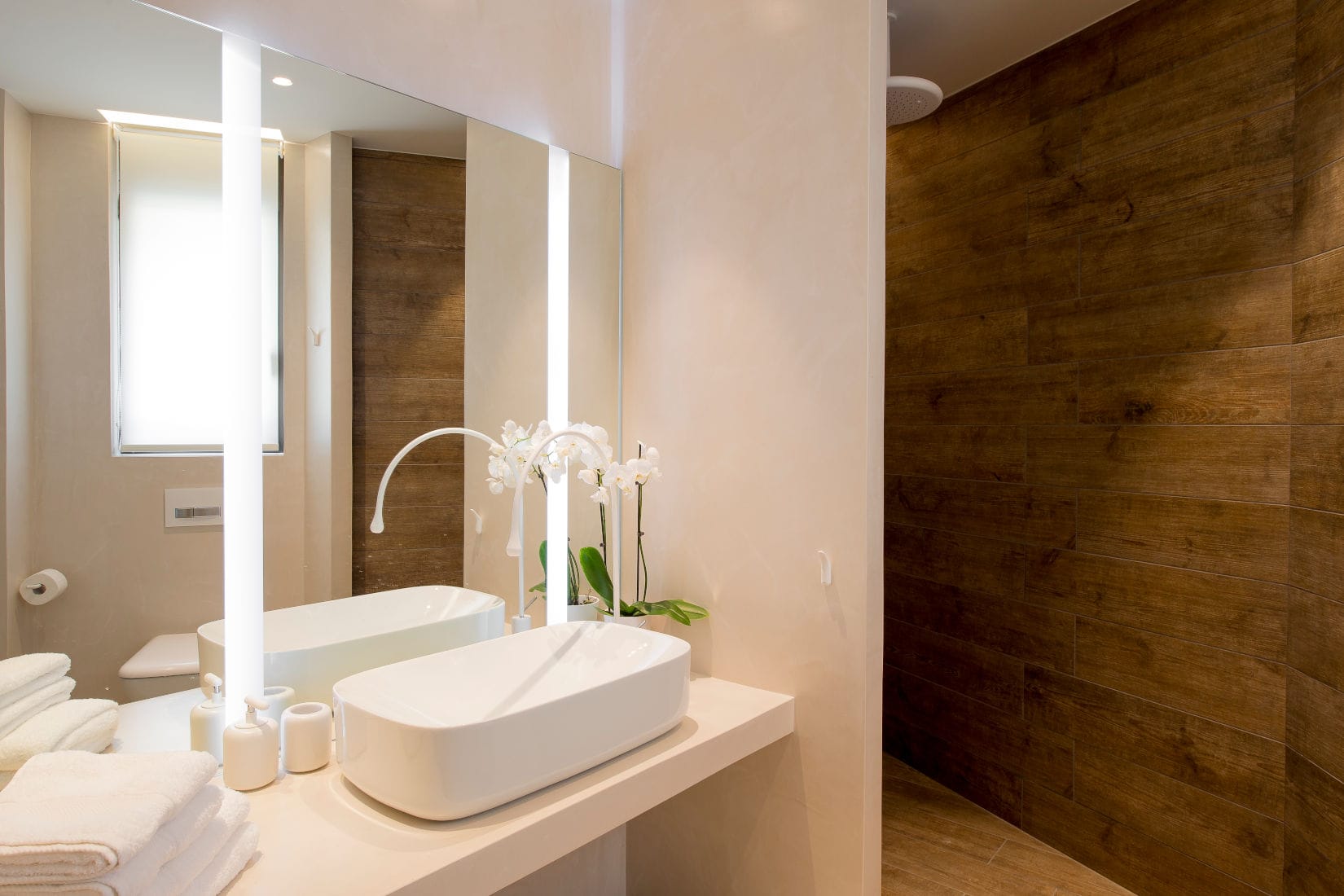 On the upper floor, there is an open playroom/ TV room with a convertible sofa with 2 twin beds and 2 bedrooms: a Master bedroom, with 2 single beds, transformable to 1 king bed instead with ensuite bathroom, a single bathtub in the bedroom, separate walk in dressing, and a large bedroom with a King size bed, transformable to 2 single beds instead with ensuite bathroom with shower. Both rooms have access to a large private Seaview terrace.