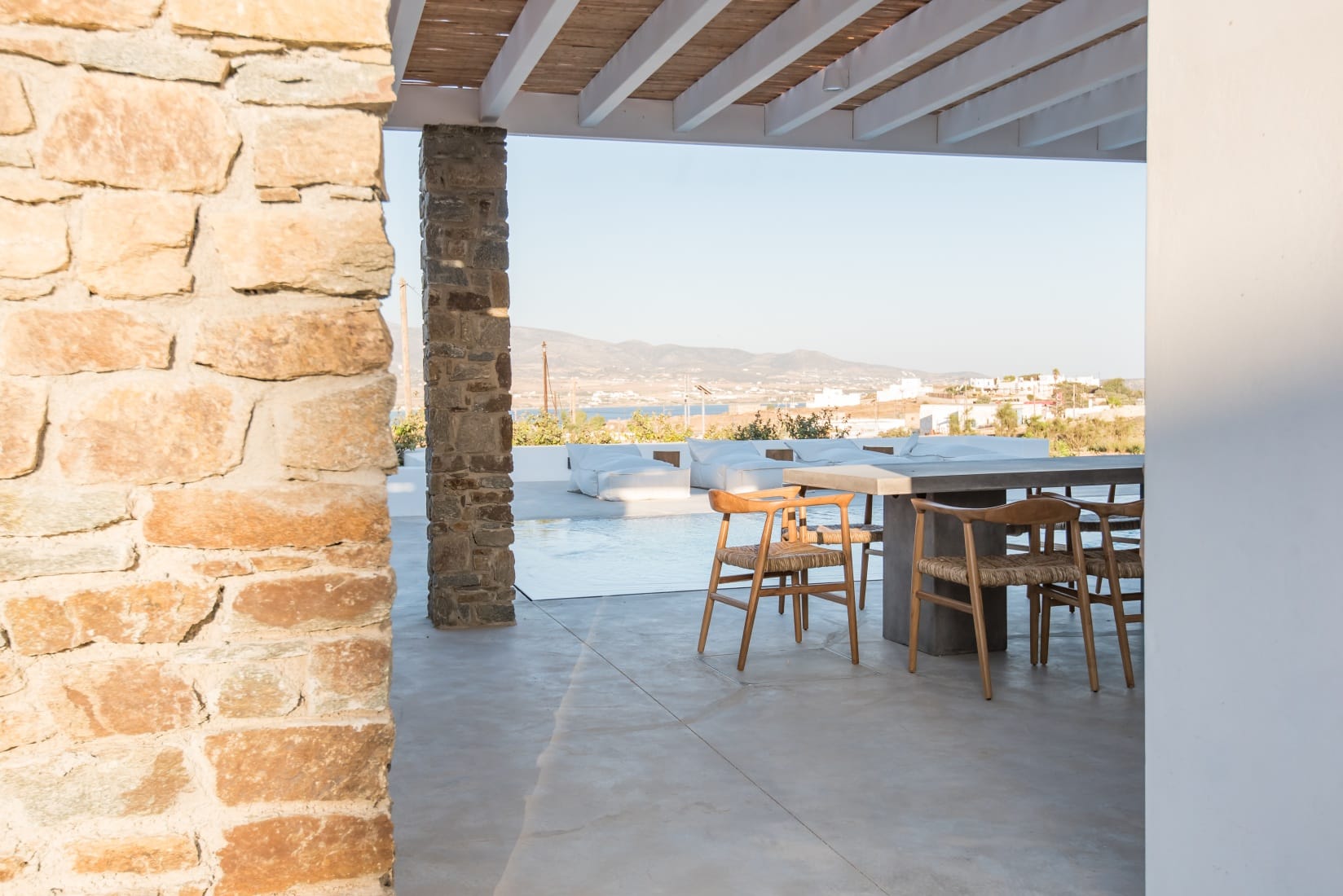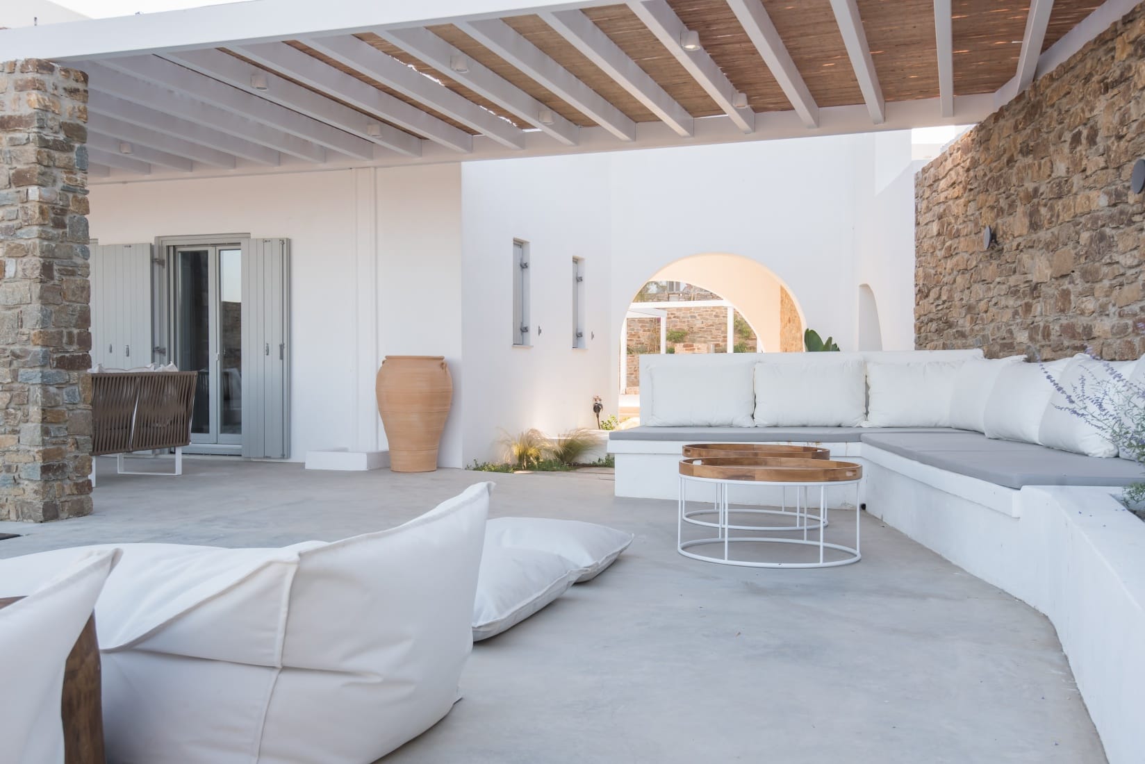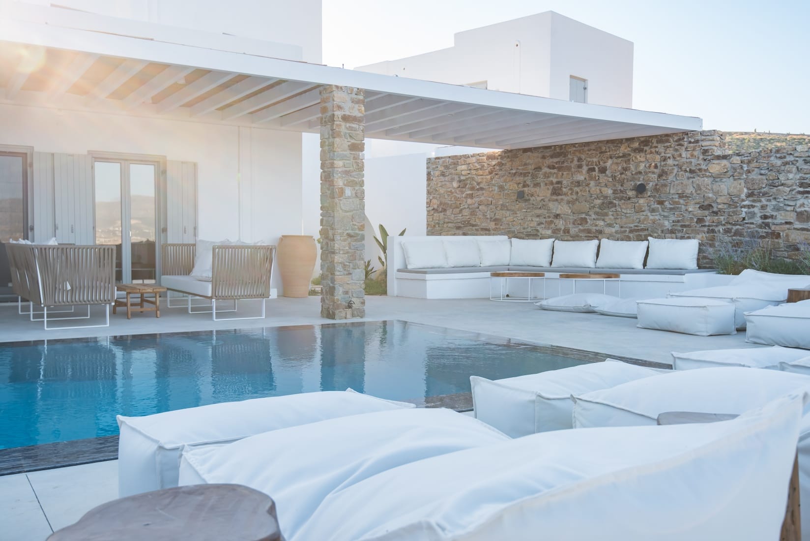 Villa Cybele is part of a 4,000 sq. m. complex consisting of two independent pool villas Villa Cybele (130sq.m.) and (Villa Selene – 70sq.m.). The basic material which was used for the construction of the villa is local stone. Oak floors are used for the interior spaces, while for bathrooms and kitchens a cement- based mortar is used- occasionally colored- using once again old traditional techniques. All interior and exterior spaces are fully furnished, and it is worth noticing that most of the furniture is once again hand made by local carpenters