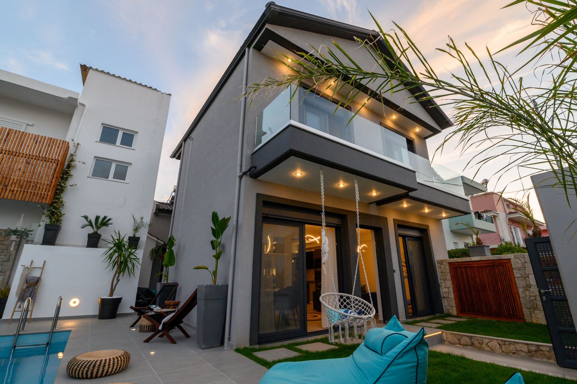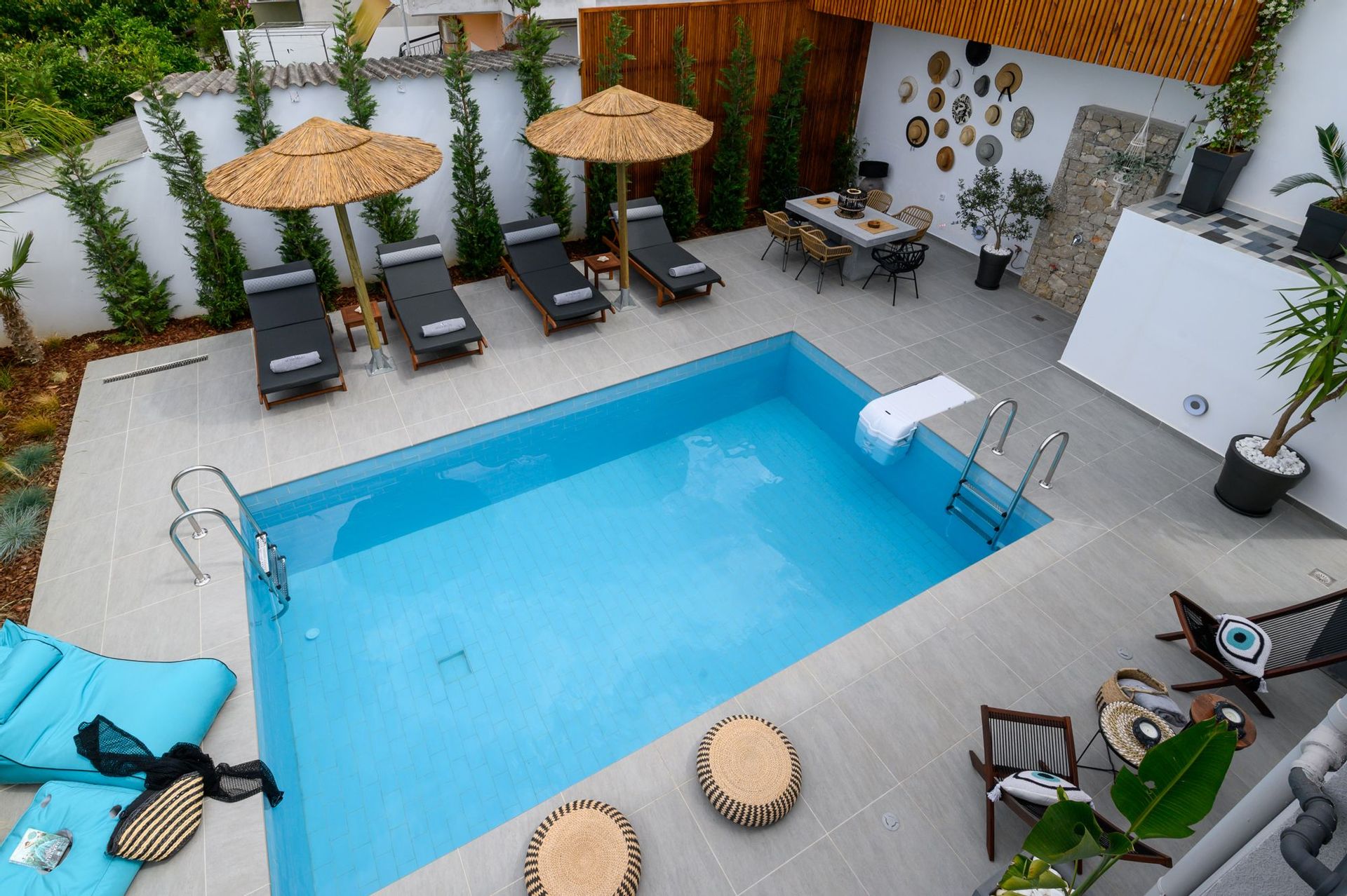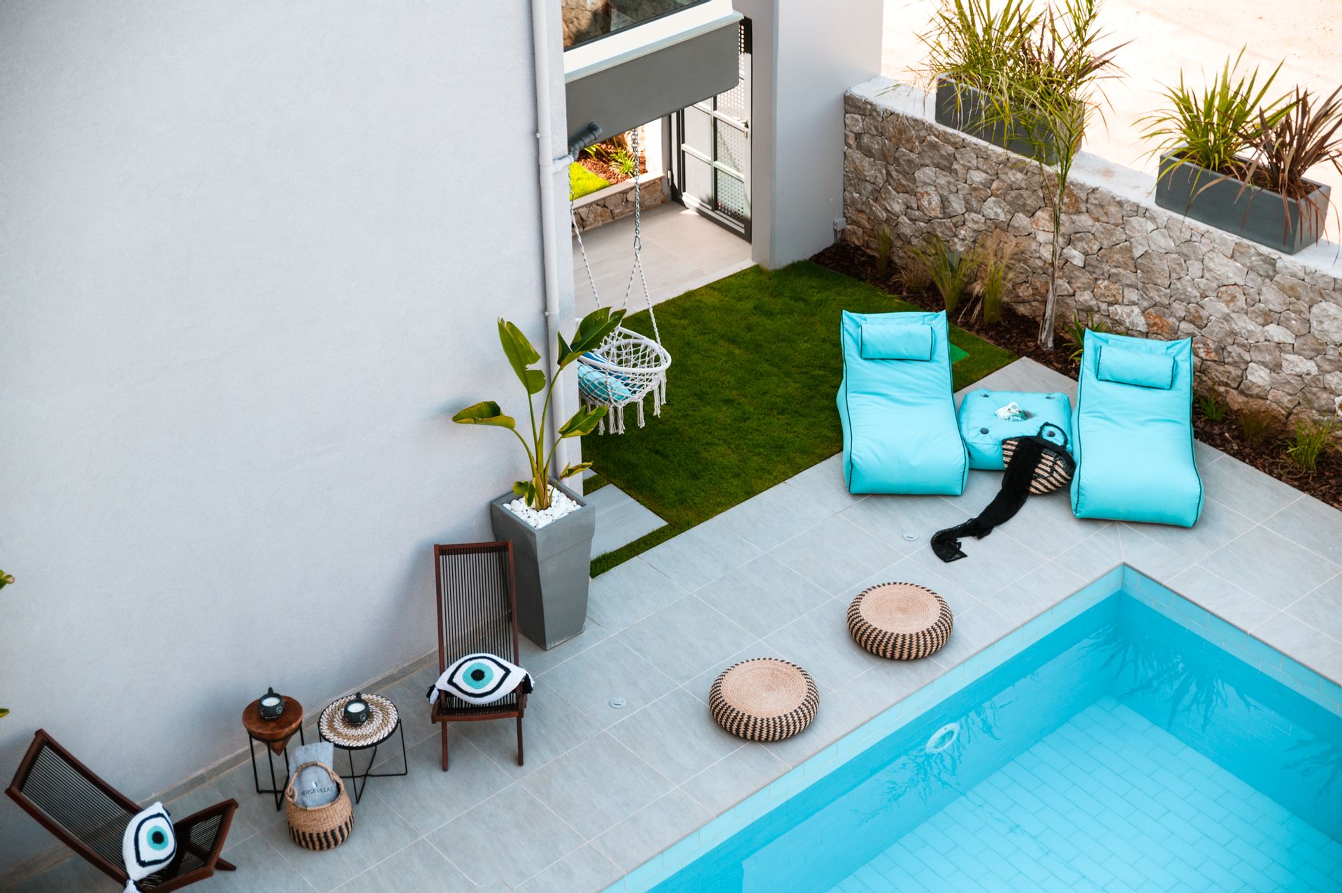 The generous outdoor space is designed with care and regard for privacy, offering a large private swimming pool with loungers, a shaded relaxation area with a hammock and cushions, and multiple chill spots.