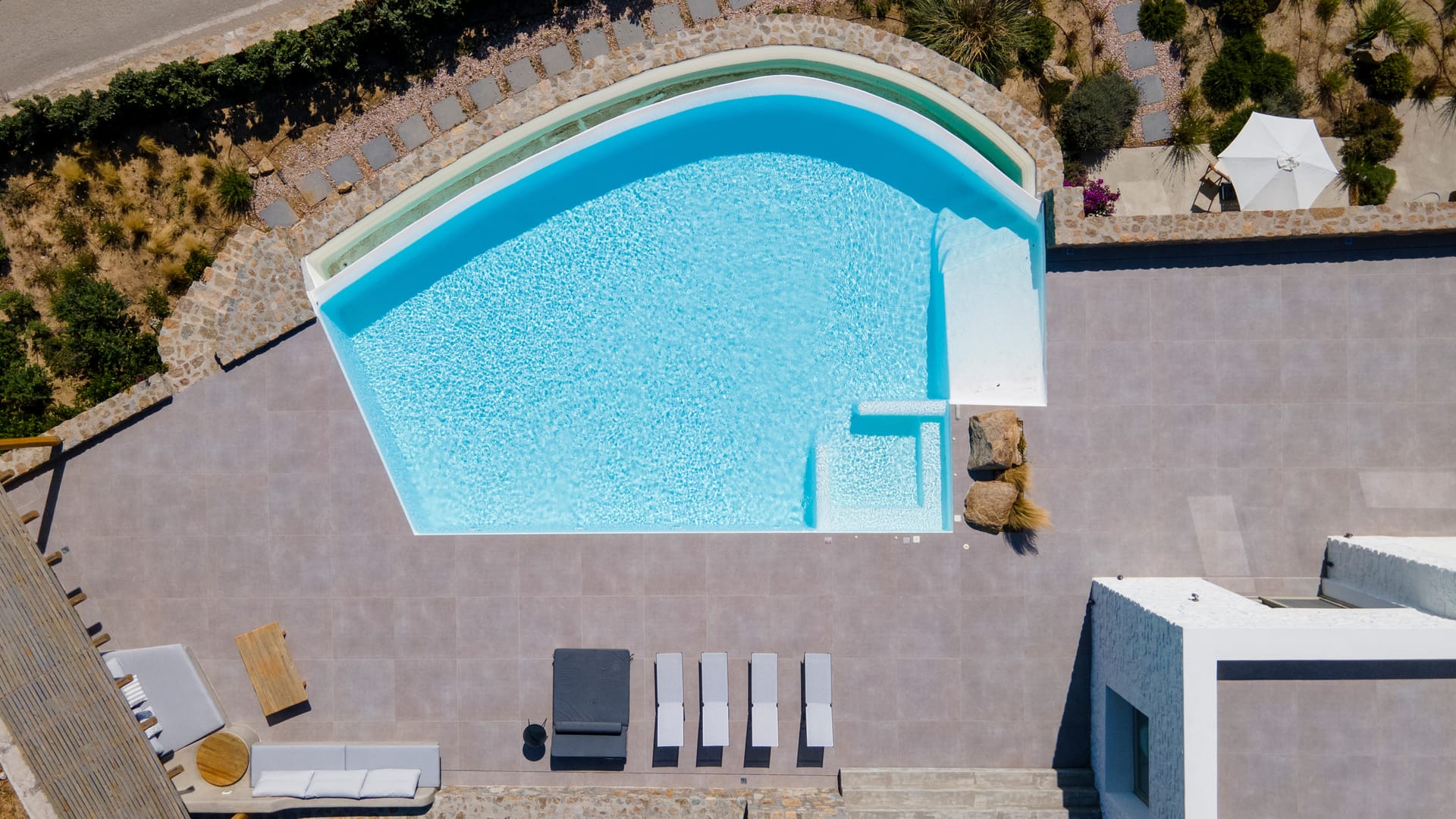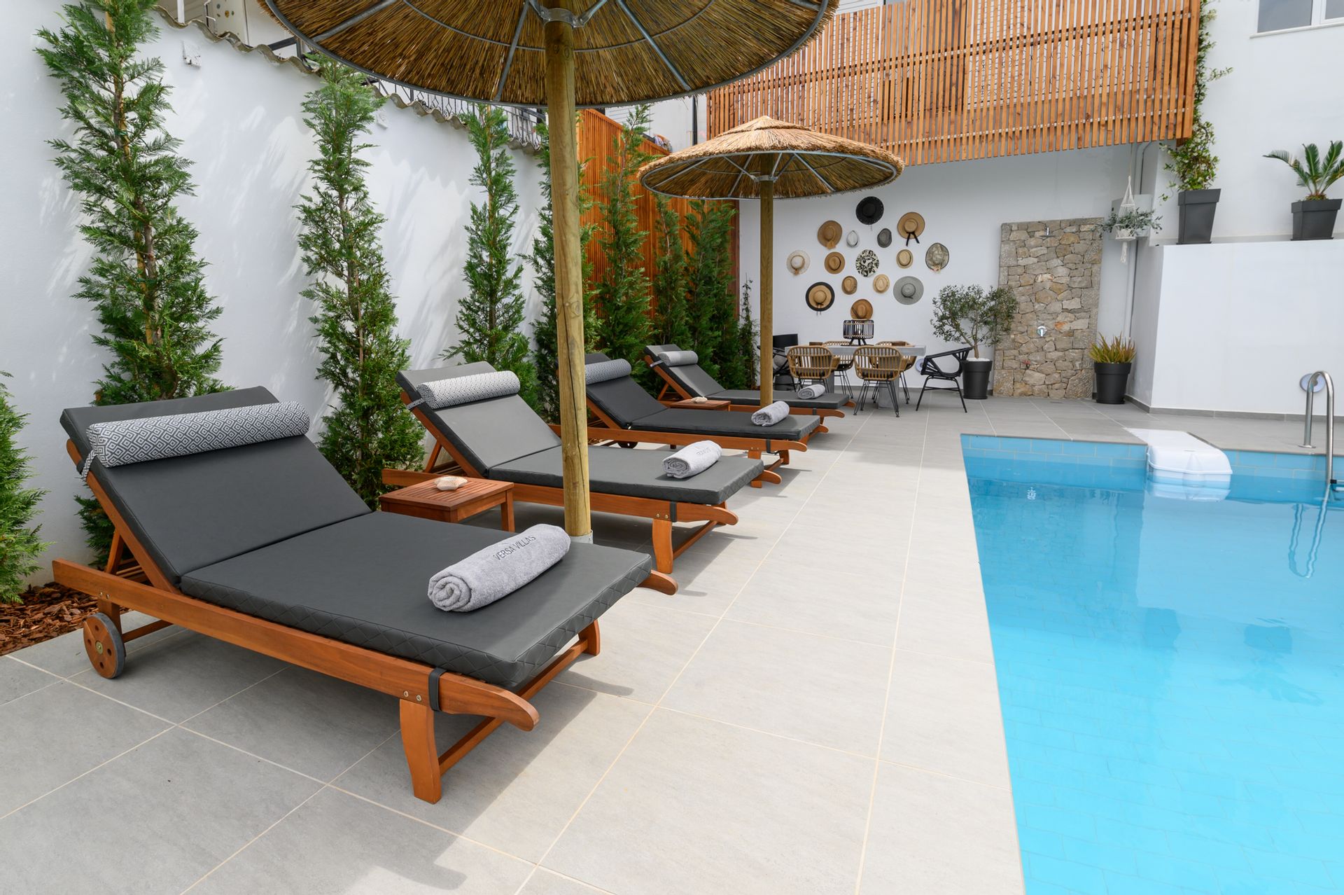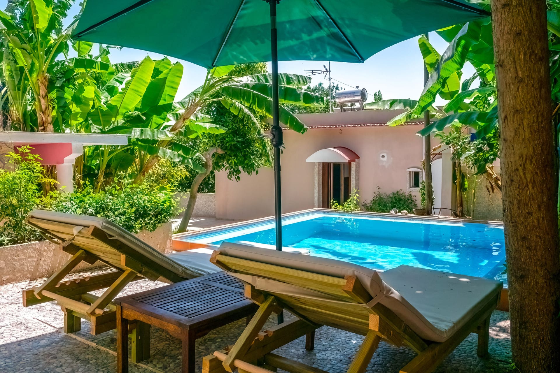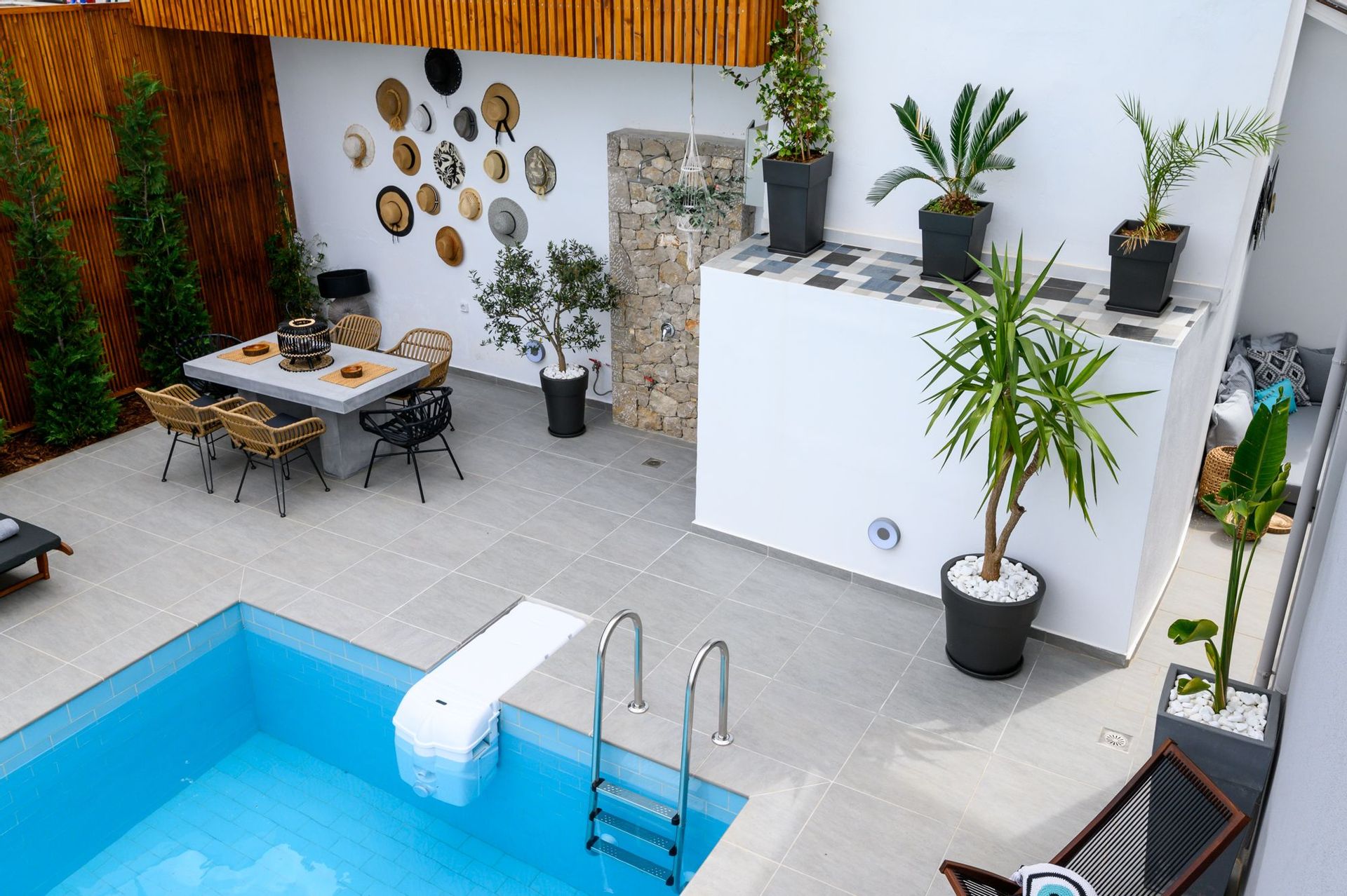 The generous outdoor space is designed with care and regard for privacy, offering a large private swimming pool with loungers, a shaded relaxation area with a hammock and cushions, and multiple chill spots.