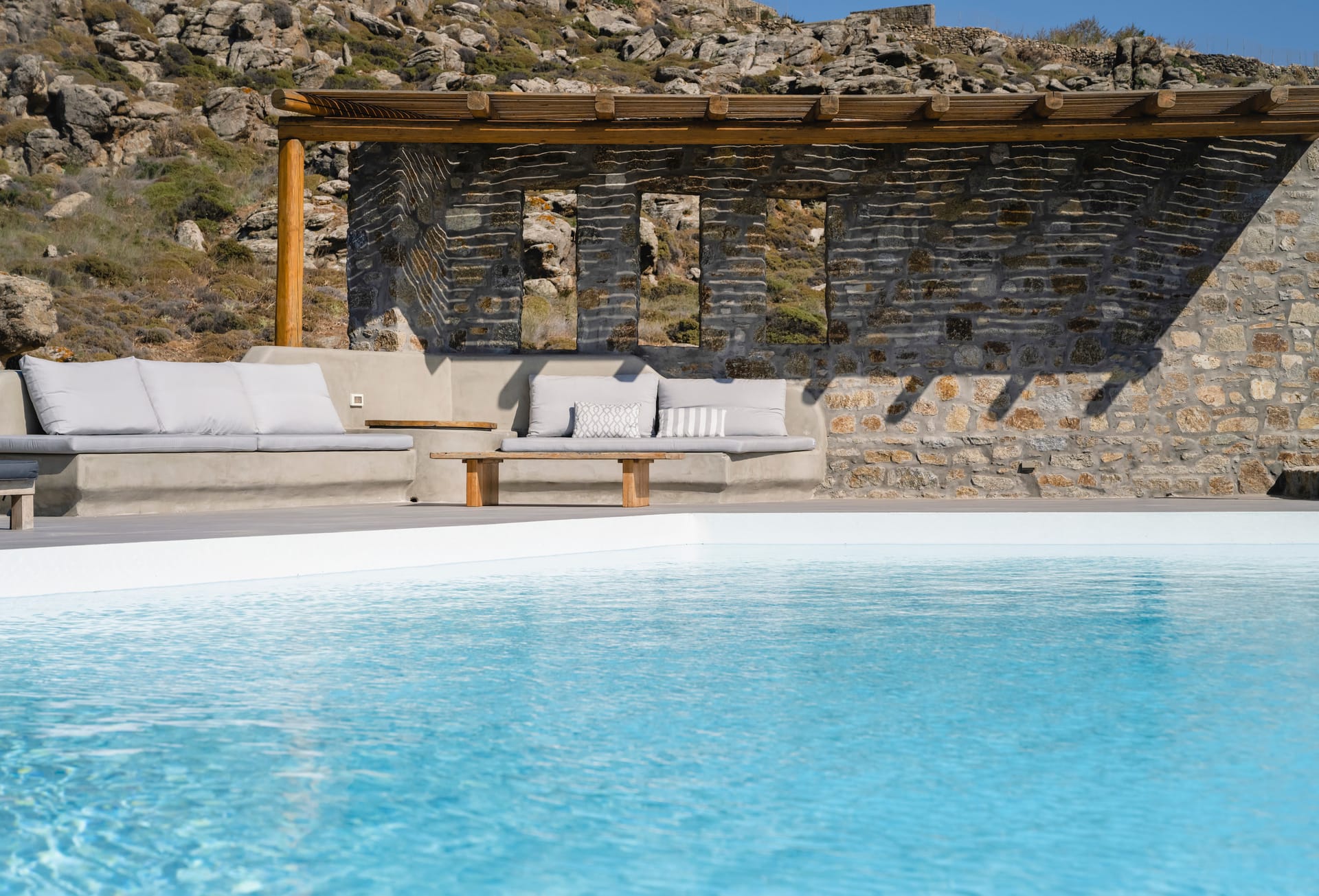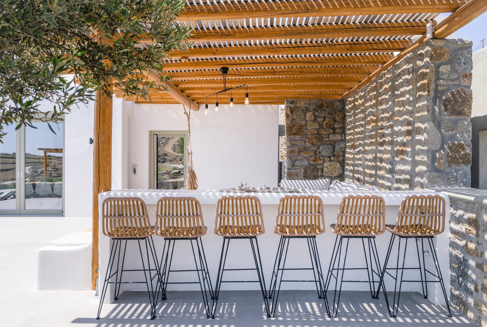 Most decorative elements, such as stones, driftwood, grass, and branches, were collected locally on the island to add an element of warmth to the relaxed, inviting, and modern space.