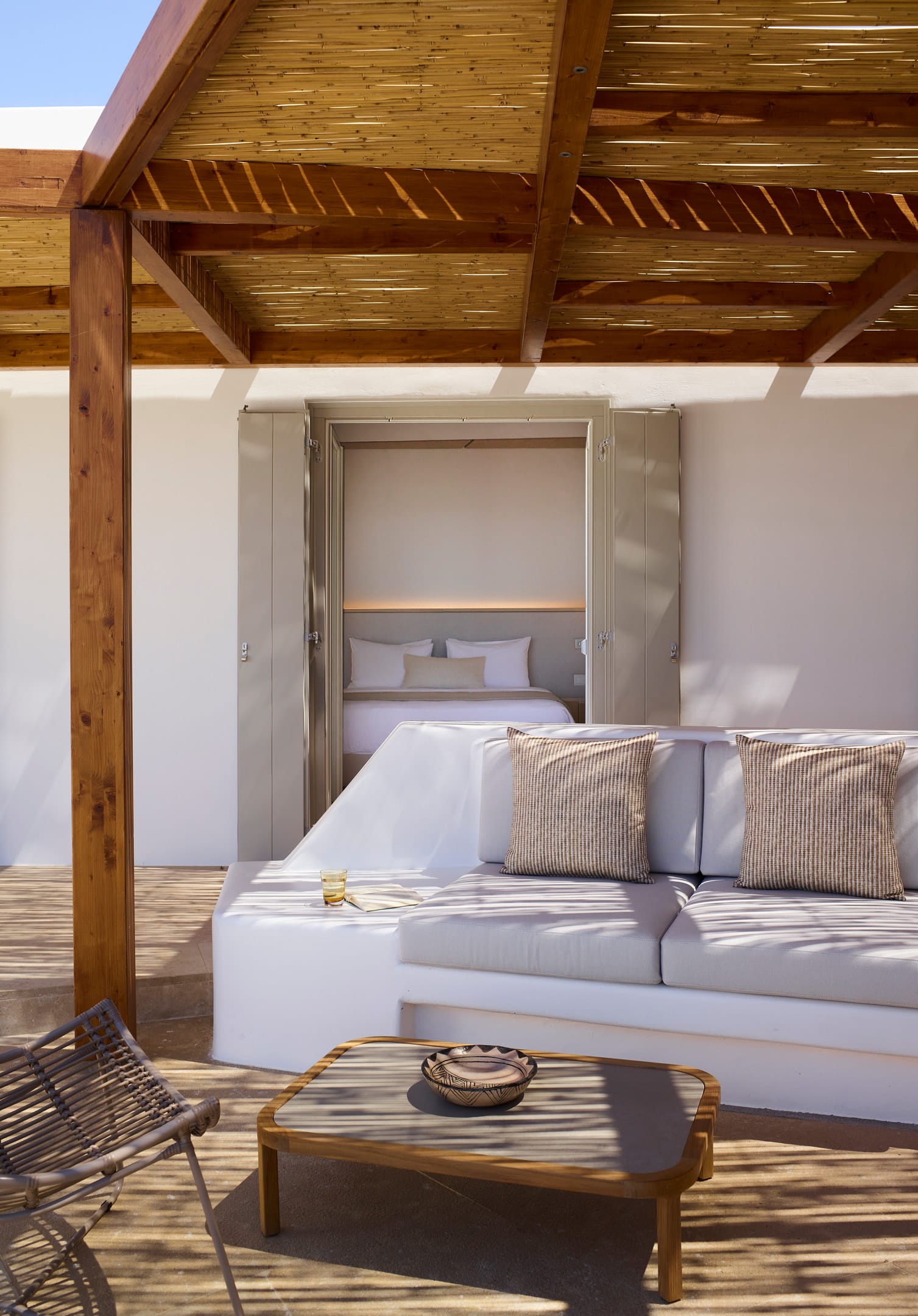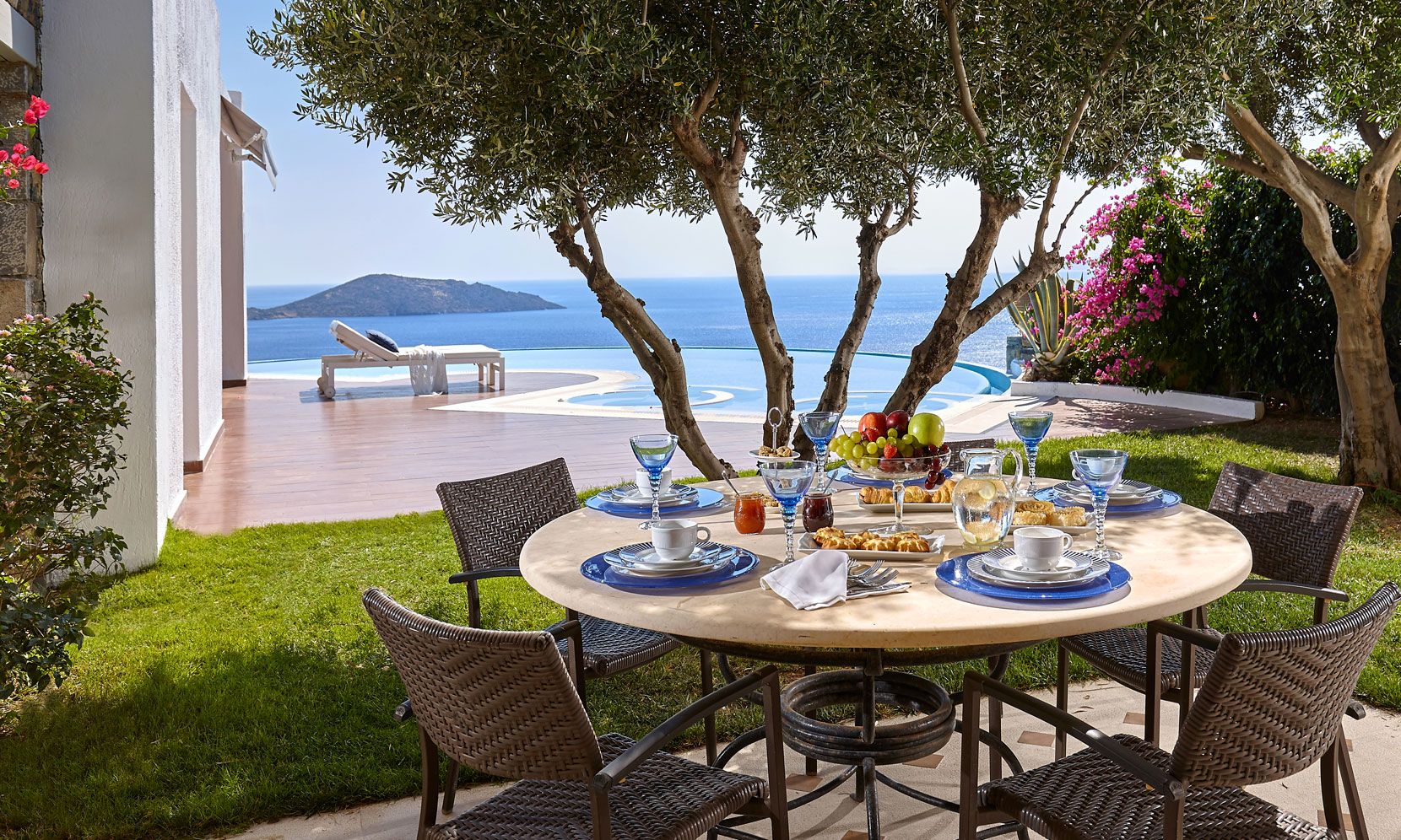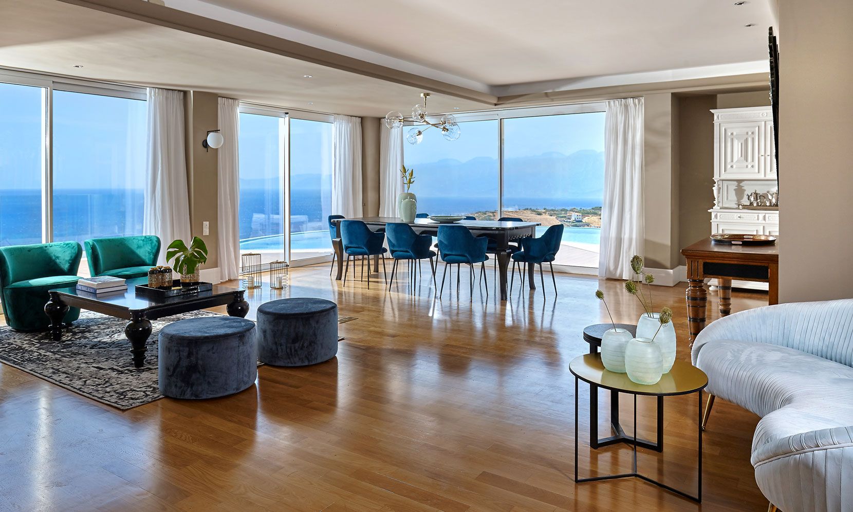 Making the most of the space and the view, as you enter the villa, the open living room invites you to relax in style. The specially designed sofa can be transformed into a king-size or two single beds. The modern kitchen is fully equipped with a Nespresso coffee machine, kettle, toaster, oven with stovetop, dishwasher, and all kitchen accessories. A washing machine, iron, and ironing board, along with a large LCD TV and A/C, complete the amenities.