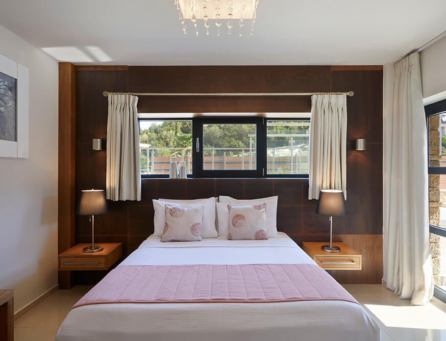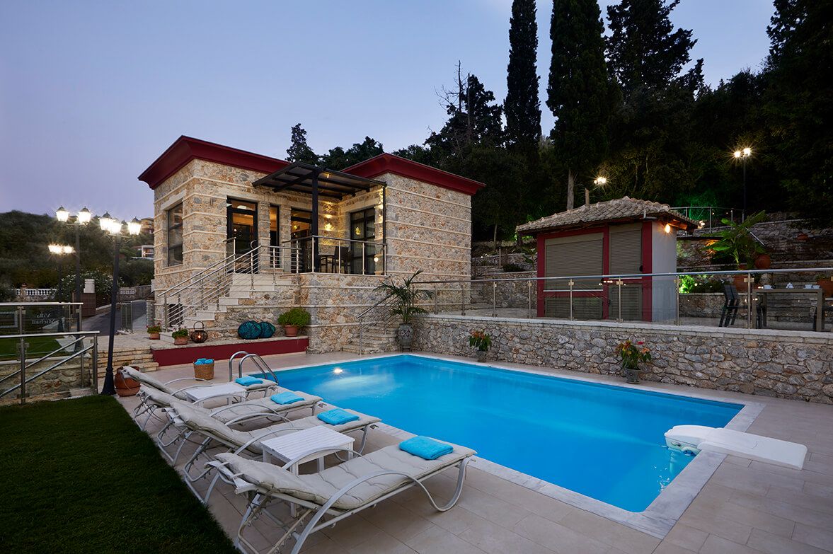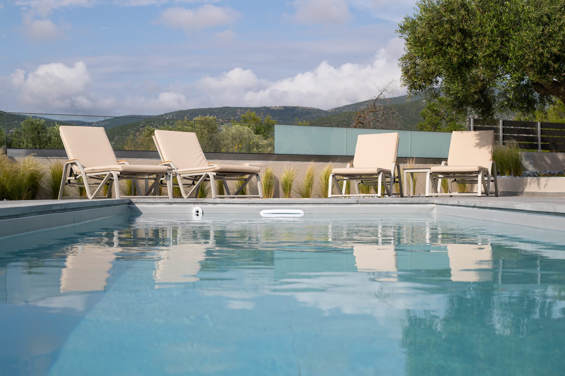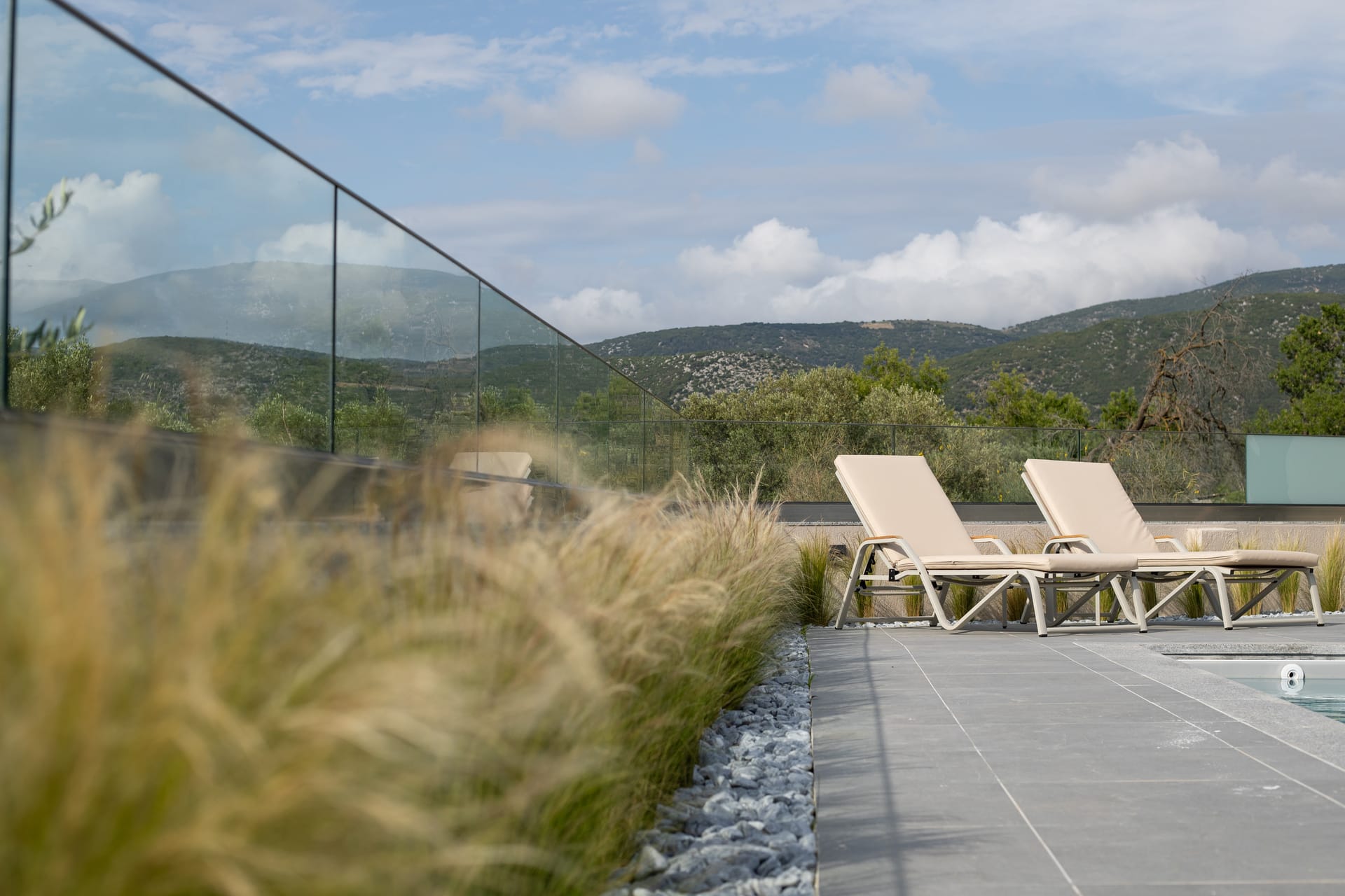 The large balcony door leads to the patio with a lovely pergola-shaded dining area and the pool with views of the surrounding landscapes. The fully equipped kitchen and the modern barbecue allow for the preparation of delicious meals. One of the main attractions of this villa is the private pool with comfortable sun loungers, pool towels, and a sea view. Surrounded by mature gardens, the pool area is the perfect spot under the Greek sun for refreshing swims and relaxation, enjoying the breathtaking views and tranquility that the villa offers every hour of the day and night."