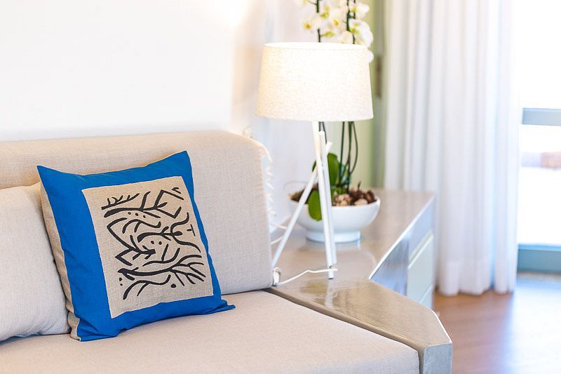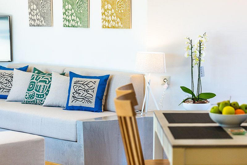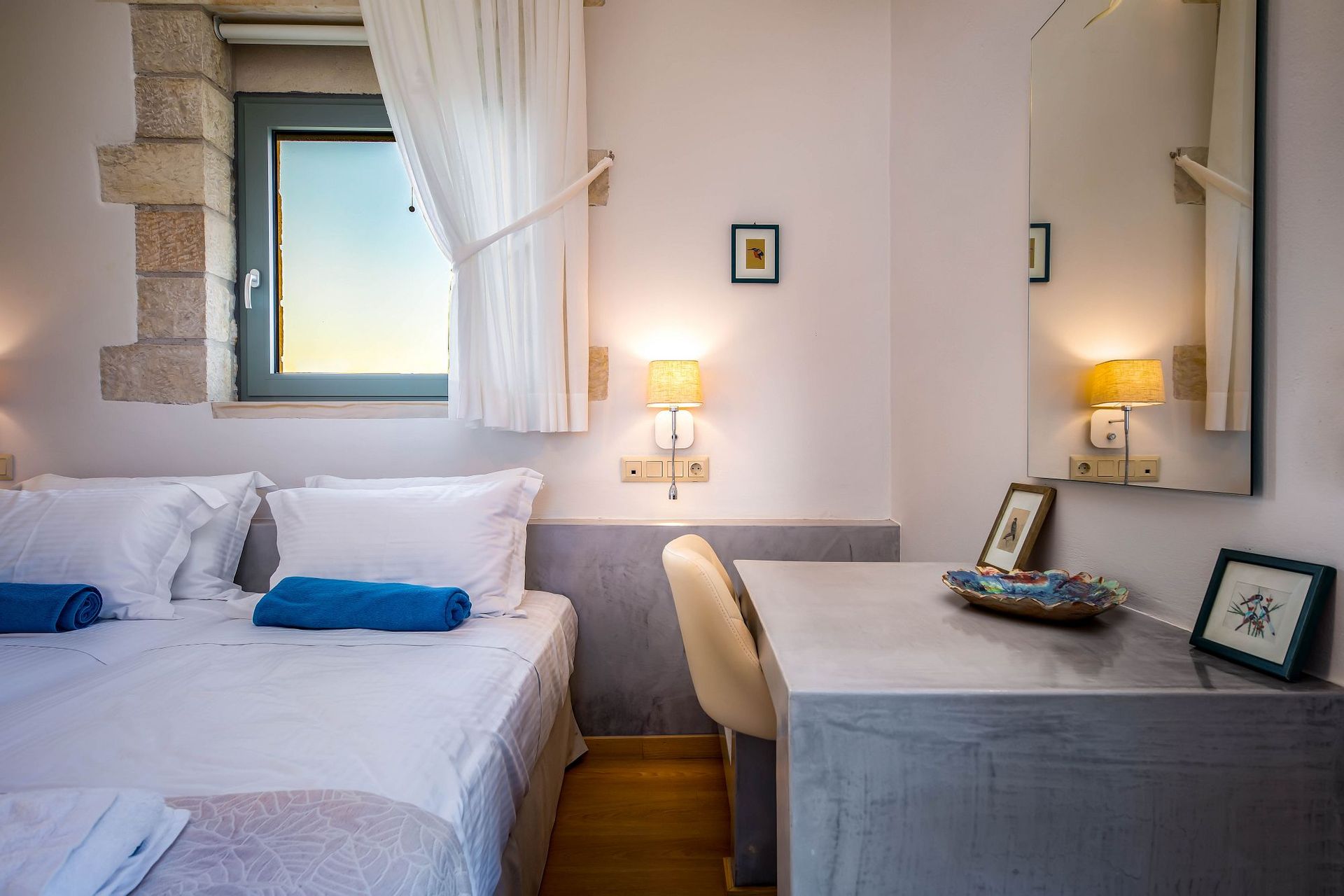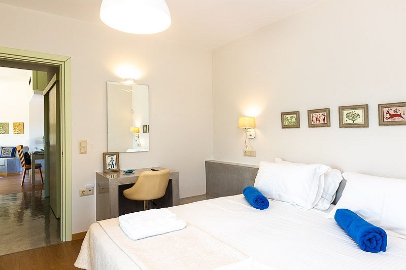 Iasion Villa can easily accommodate 5 guests and 2 more if required, and all its rooms are carefully decorated to fit its luxurious character. The villa’s main entrance on the ground level leads to the open-plan living room which is combined with the fully equipped kitchen. The living area features two comfortable sofas, a 42” satellite HDTV and a furnished veranda with access to the swimming pool and the tended garden. The kitchen has everything one may need to prepare the tastiest meals, along with a dining table, a washing machine and a tumble dryer. Additionally, the ground floor features a bedroom with two single beds (which can be combined into a king-sized one, if you wish), a 32’’ HDTV and direct exit to pool area. There is also a bathroom, specifically designed for guests with mobility limitations, equipped with a whirlpool.
