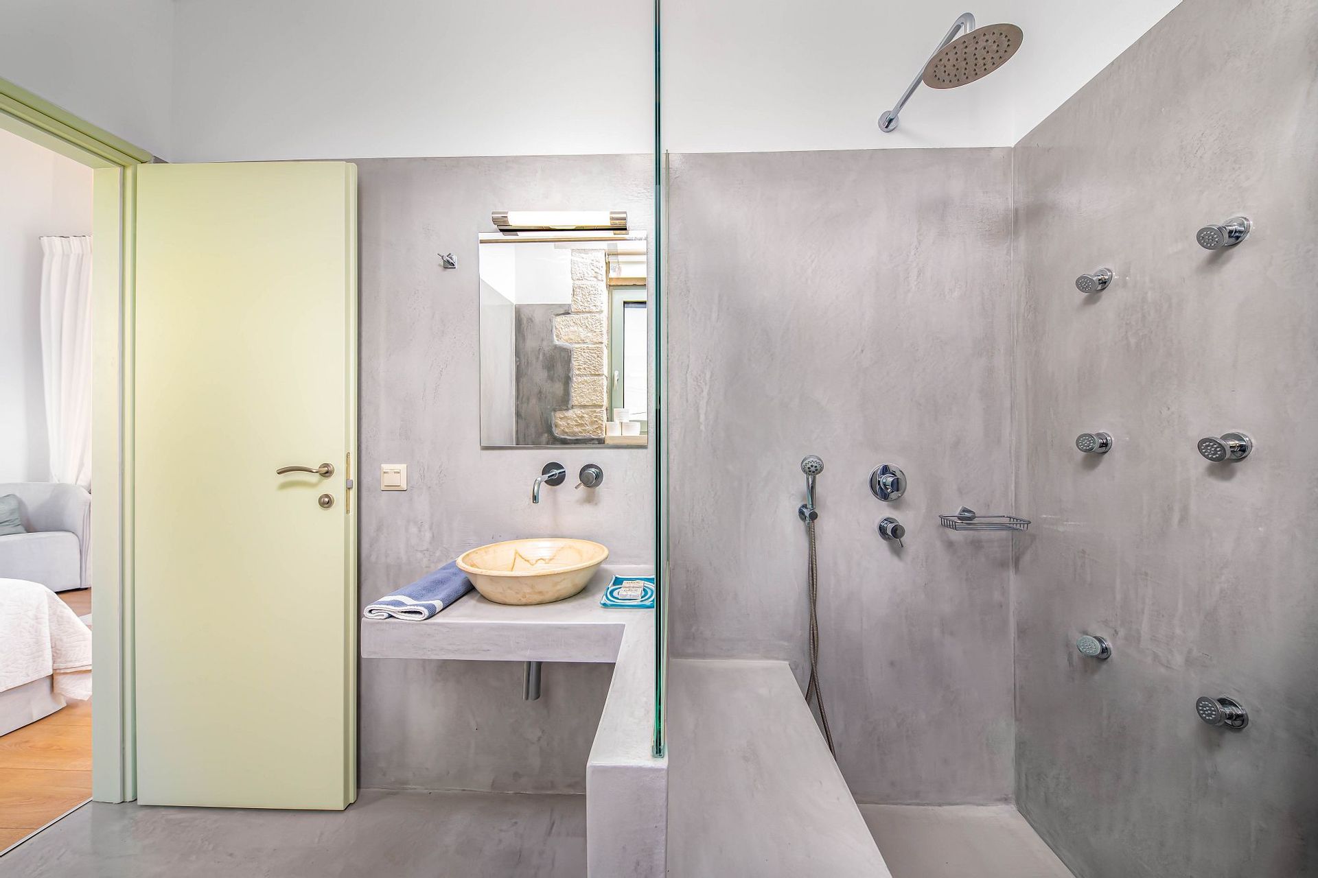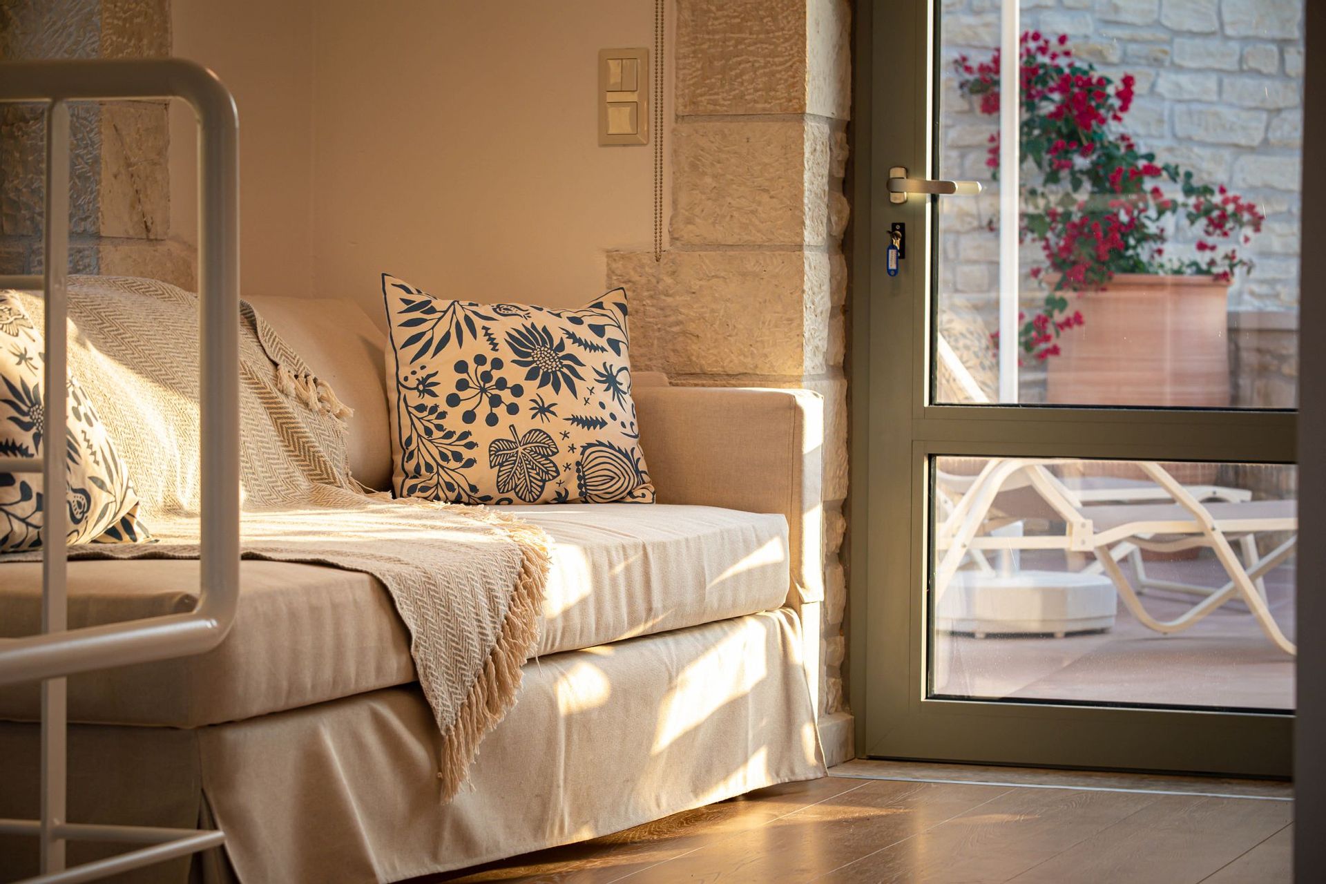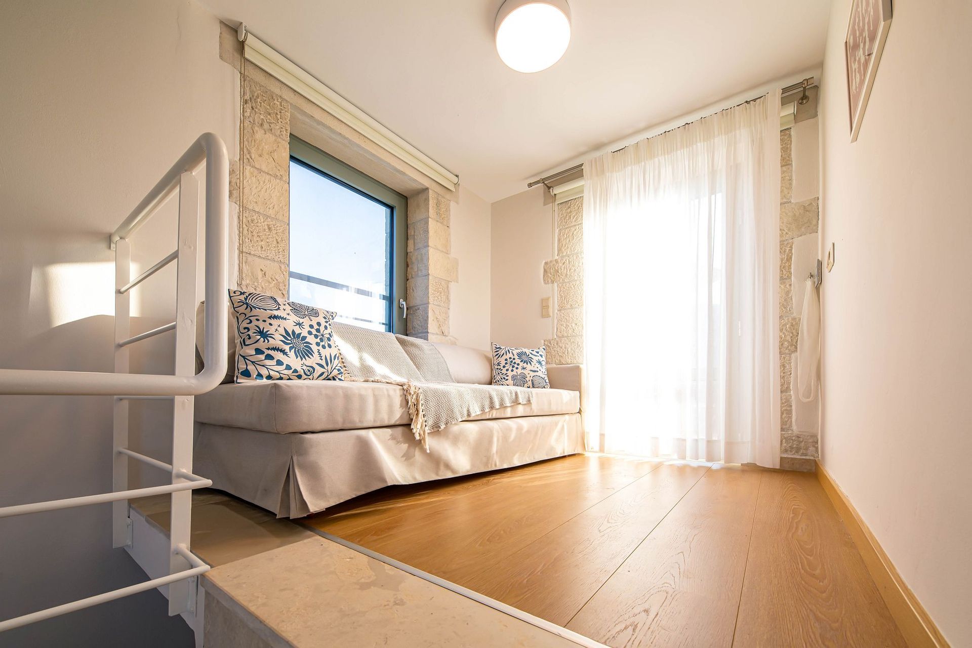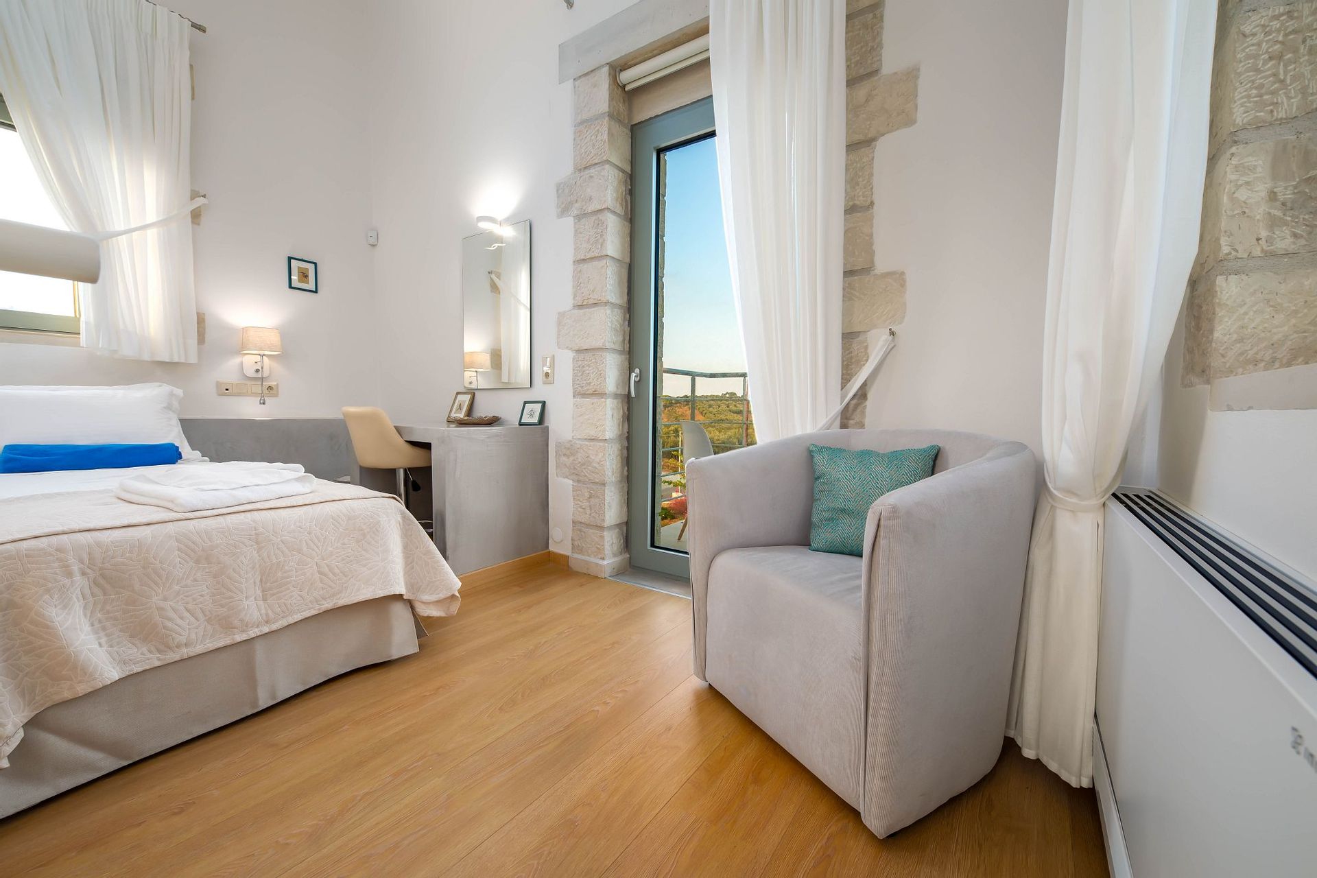 Walking up the staircase to the first floor, the guests will find a master bedroom with a private en-suite bathroom, a king-sized bed (divisible to two single ones if you wish), a 32’’ HDTV and a private furnished veranda.