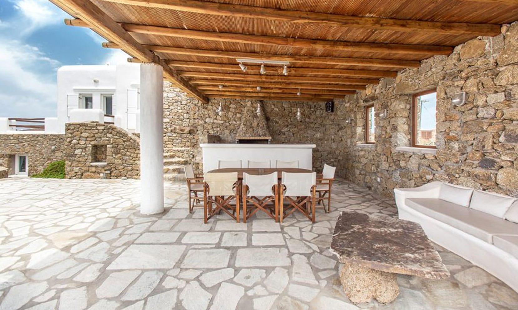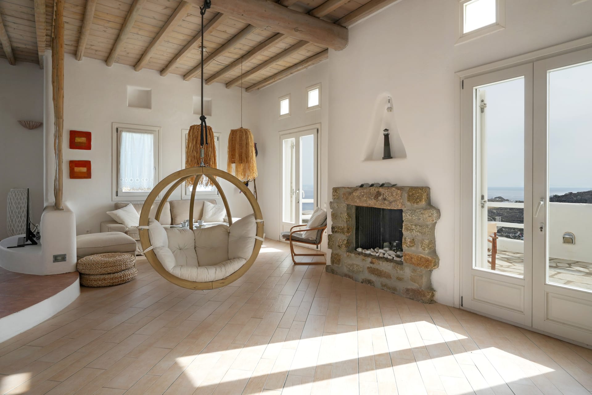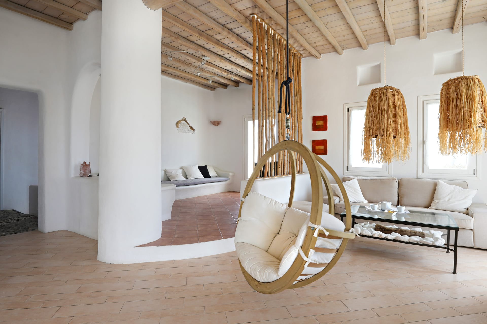 Mykonos Villa Super Three bedrooms are situated on the lower floor and feature en-suite bathrooms and modern furnishing combined with all the necessary comforts. The entrance level consists of the living room, the lounge and dining area, decorated with a combination of minimal and traditional Cycladic style, with stone built sitting areas and wooden elements. All the living areas of the entrance level have access to the terrace.