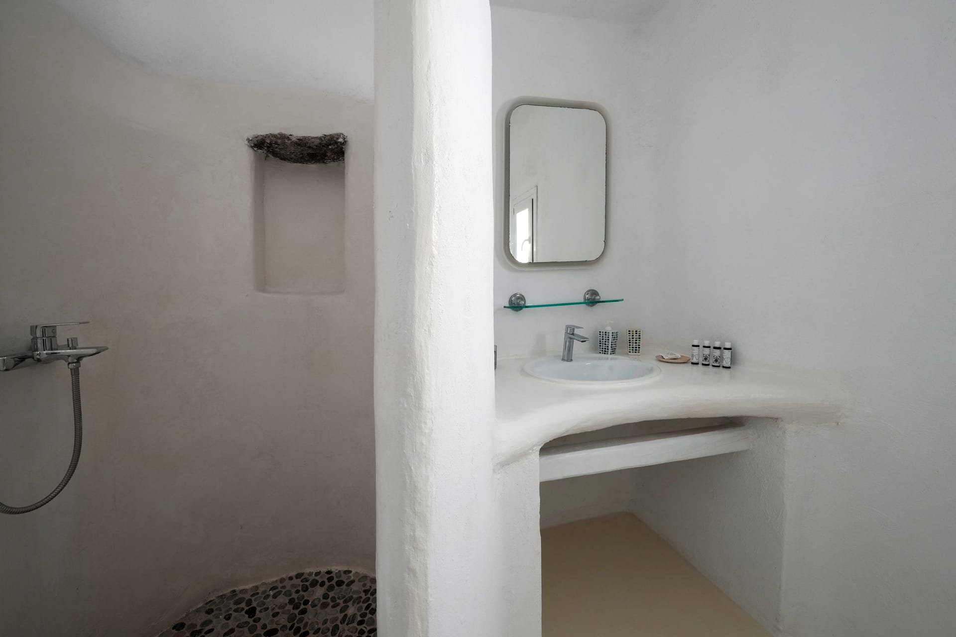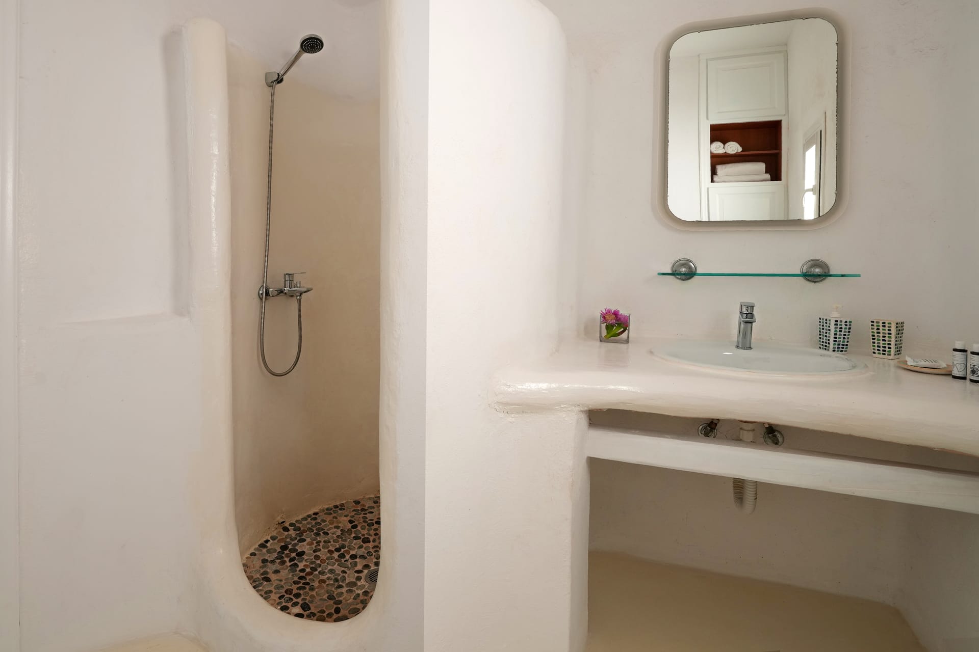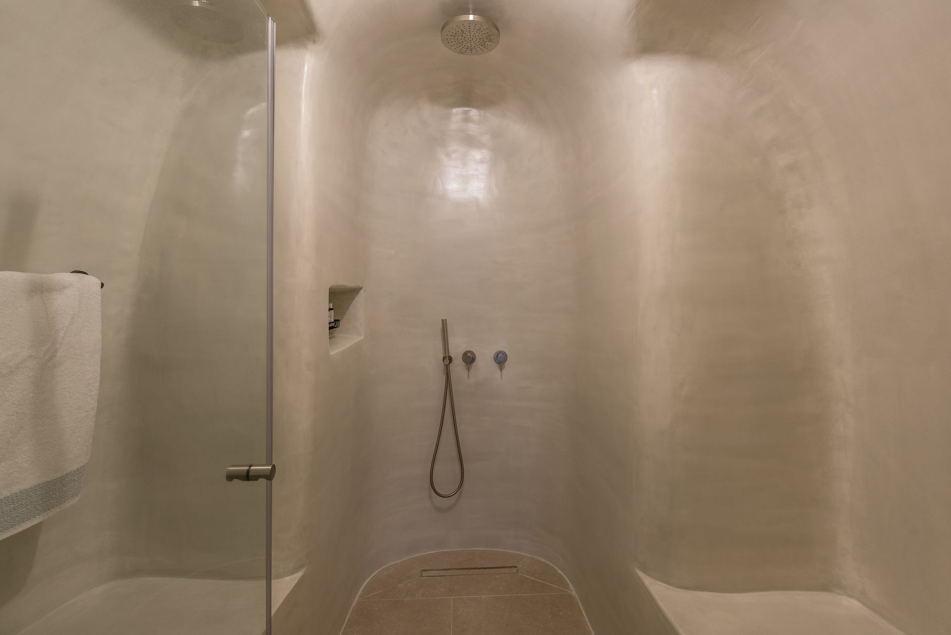 Mykonos Villa Super Three bedrooms are situated on the lower floor and feature en-suite bathrooms and modern furnishing combined with all the necessary comforts. The entrance level consists of the living room, the lounge and dining area, decorated with a combination of minimal and traditional Cycladic style, with stone built sitting areas and wooden elements. All the living areas of the entrance level have access to the terrace.