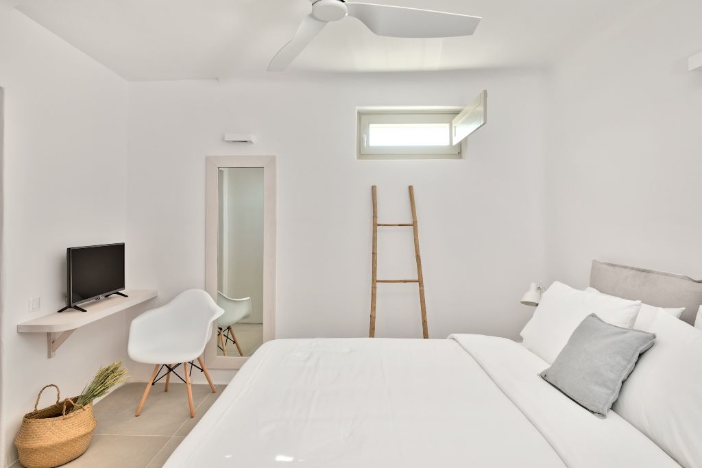 The outdoor common areas consist mainly of a spacious, relaxing and romantic environment, designed to contribute to your rejuvenation during your vacation in Mykonos Island. Swim in the communal swimming pool of the complex and enjoy the Mediterranean sun in one of the cosy sun lounges around the pool or view the sun setting over the island of Delos.