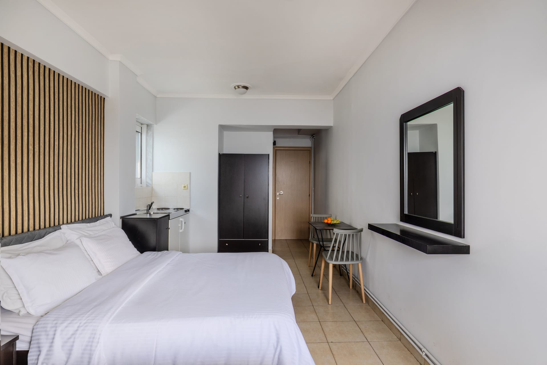 These airy studios are designed to provide both comfort and functionality for up to three guests. With a cozy double bed and a single bed, they are ideal for families or small groups. Guests can savor breathtaking sea views from the private balcony while enjoying meals prepared in the fully equipped kitchenette, complete with a refrigerator, stovetop, and cookware. Spacious and serene, these studios are a perfect choice for those seeking a peaceful coastal retreat without compromising convenience.