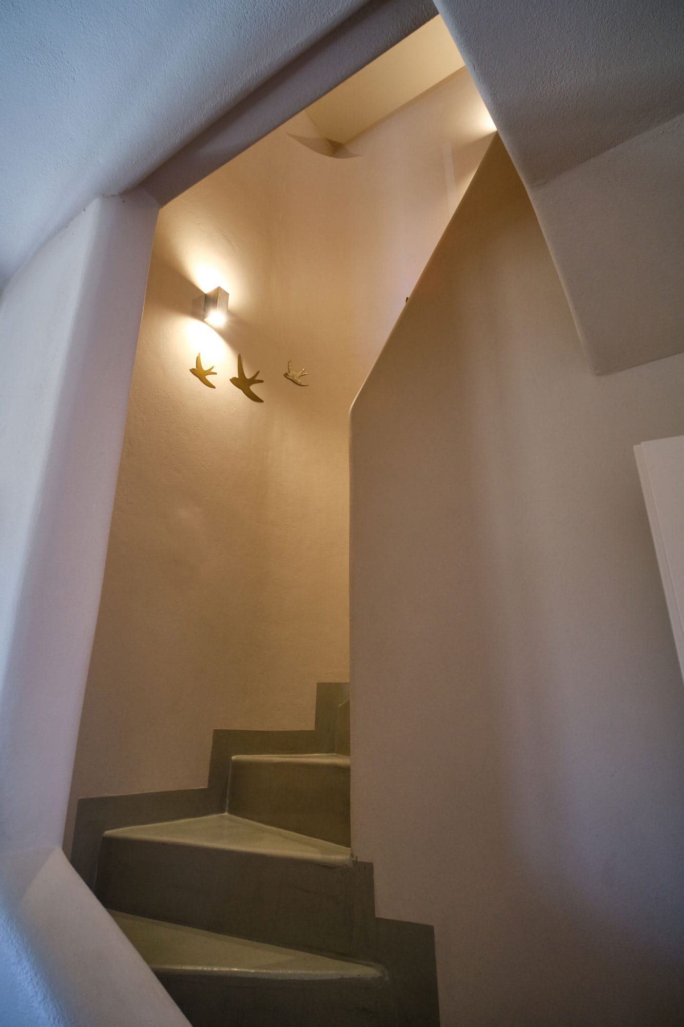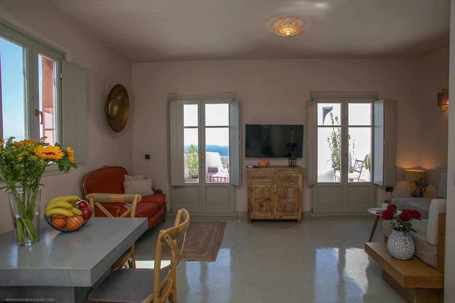 The villa spans three levels and is accessible via a private entrance. The ground floor welcomes you with a porch adorned with a table and four chairs. Upon entering, you'll discover a spacious area featuring a large living room equipped with a flat-screen smart TV, two sofas, an open-plan fully equipped kitchen, a dining table, and a bathroom. From the window, you can admire the breathtaking Santorini sunset. Directly in front of the living room lies a terrace with a plunge jetted swimming pool, outdoor furniture, and commanding views of the sea and sunset.