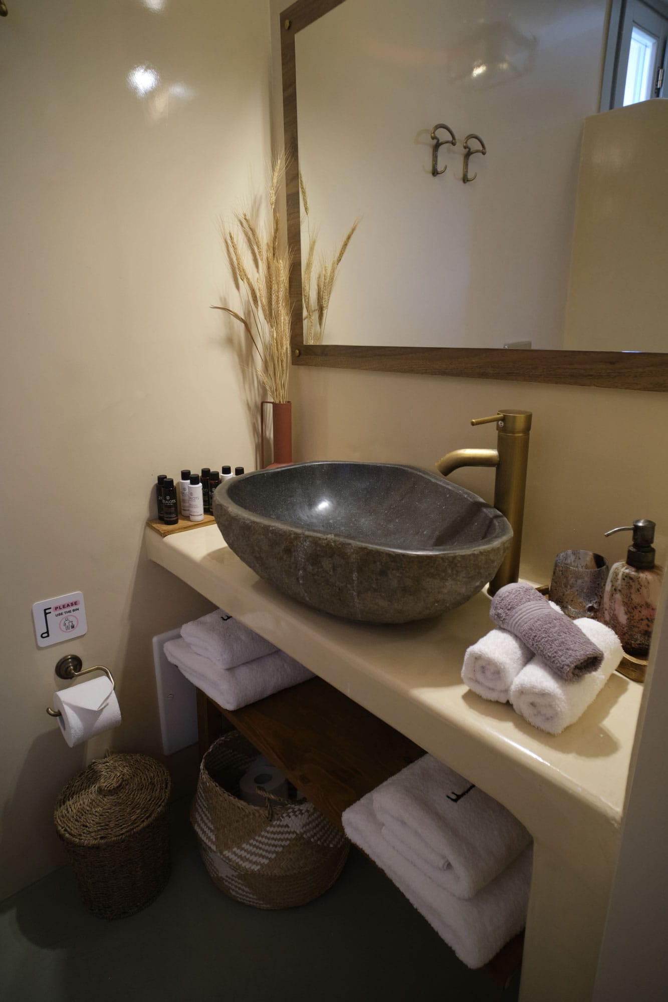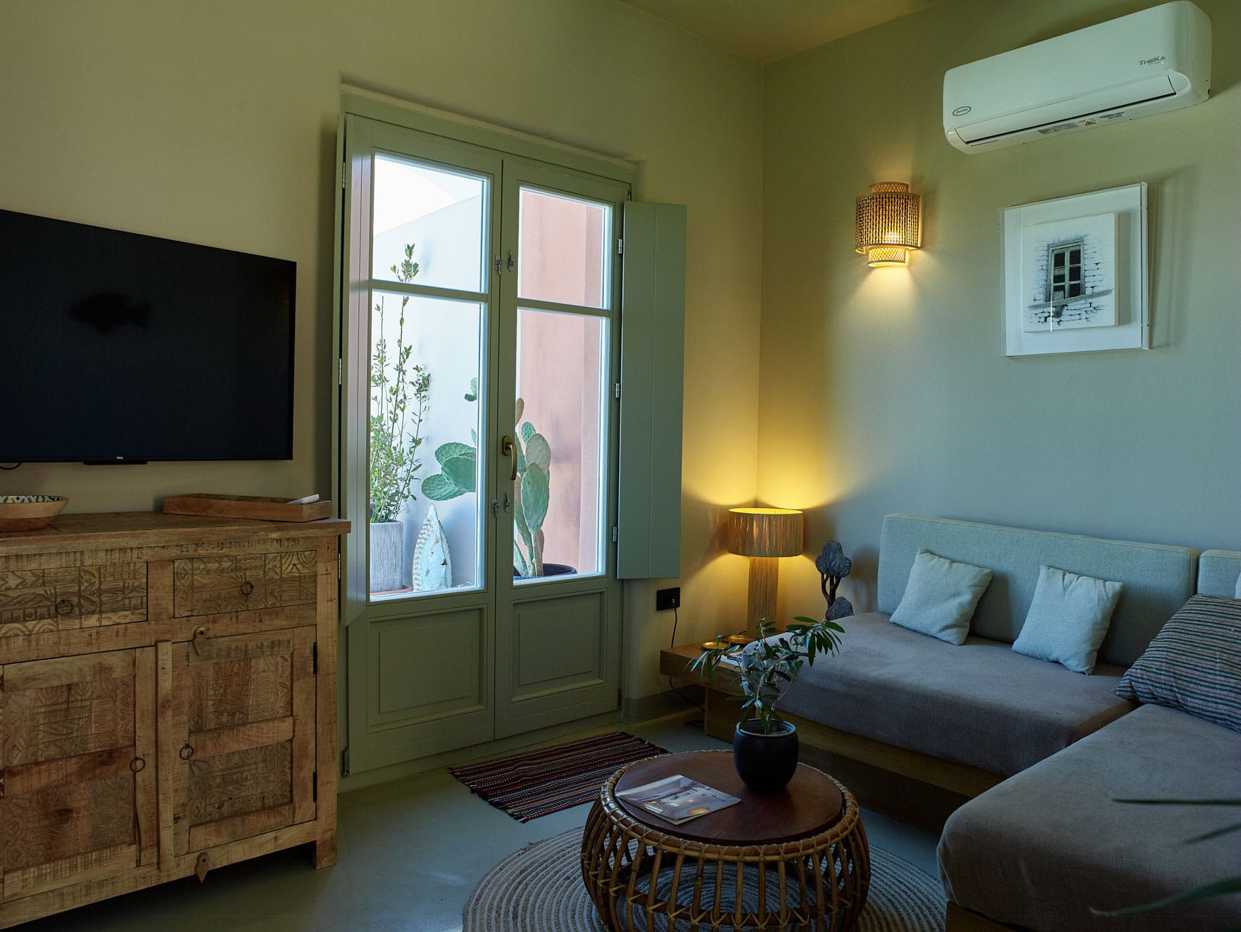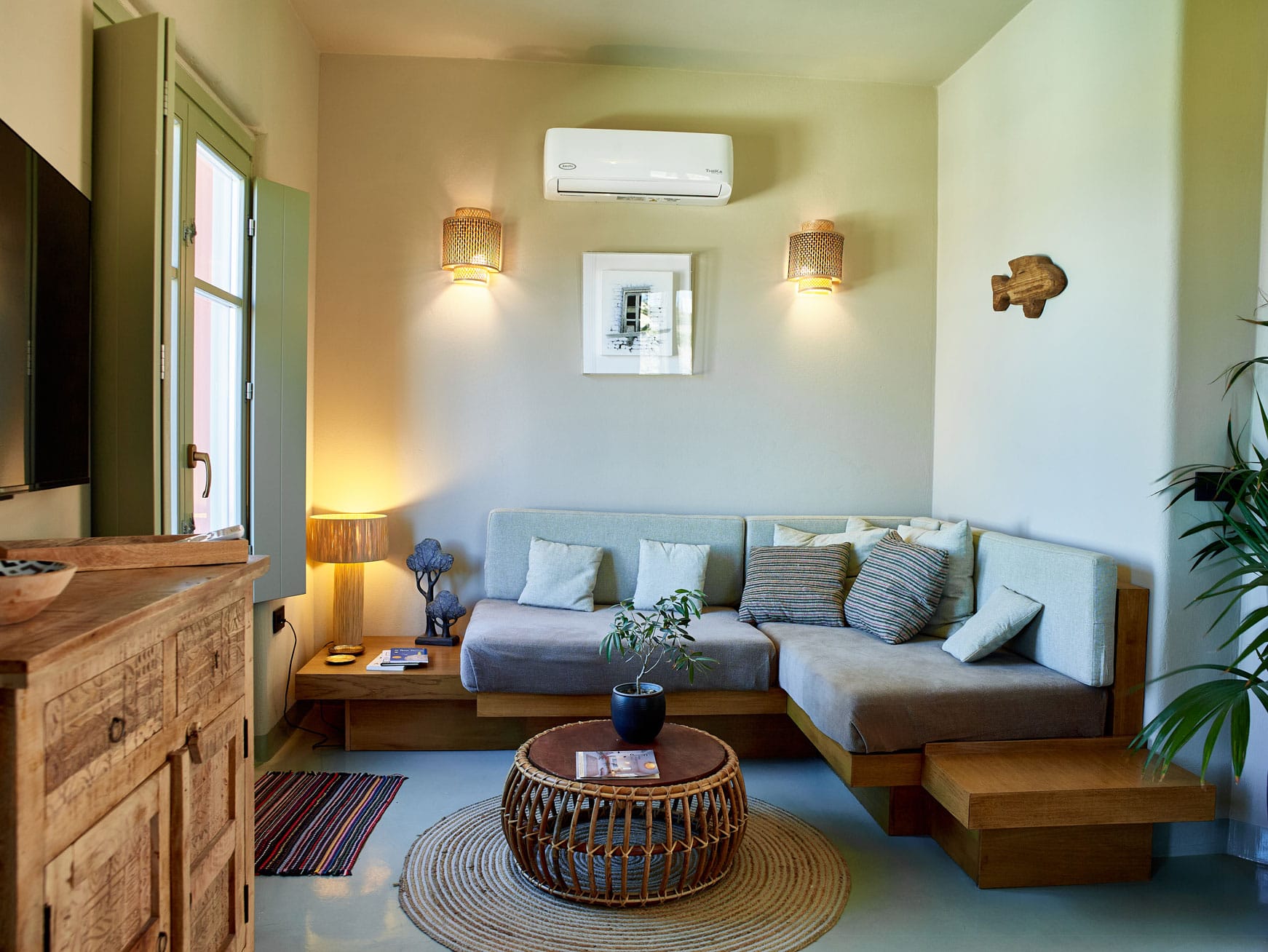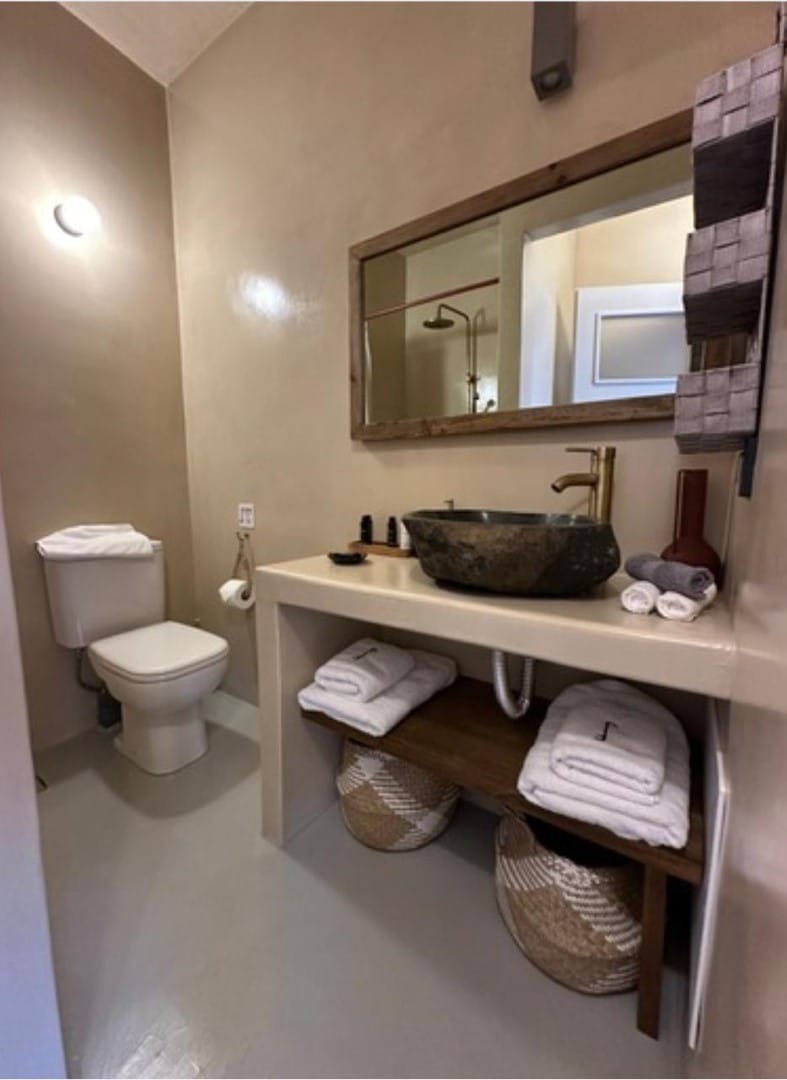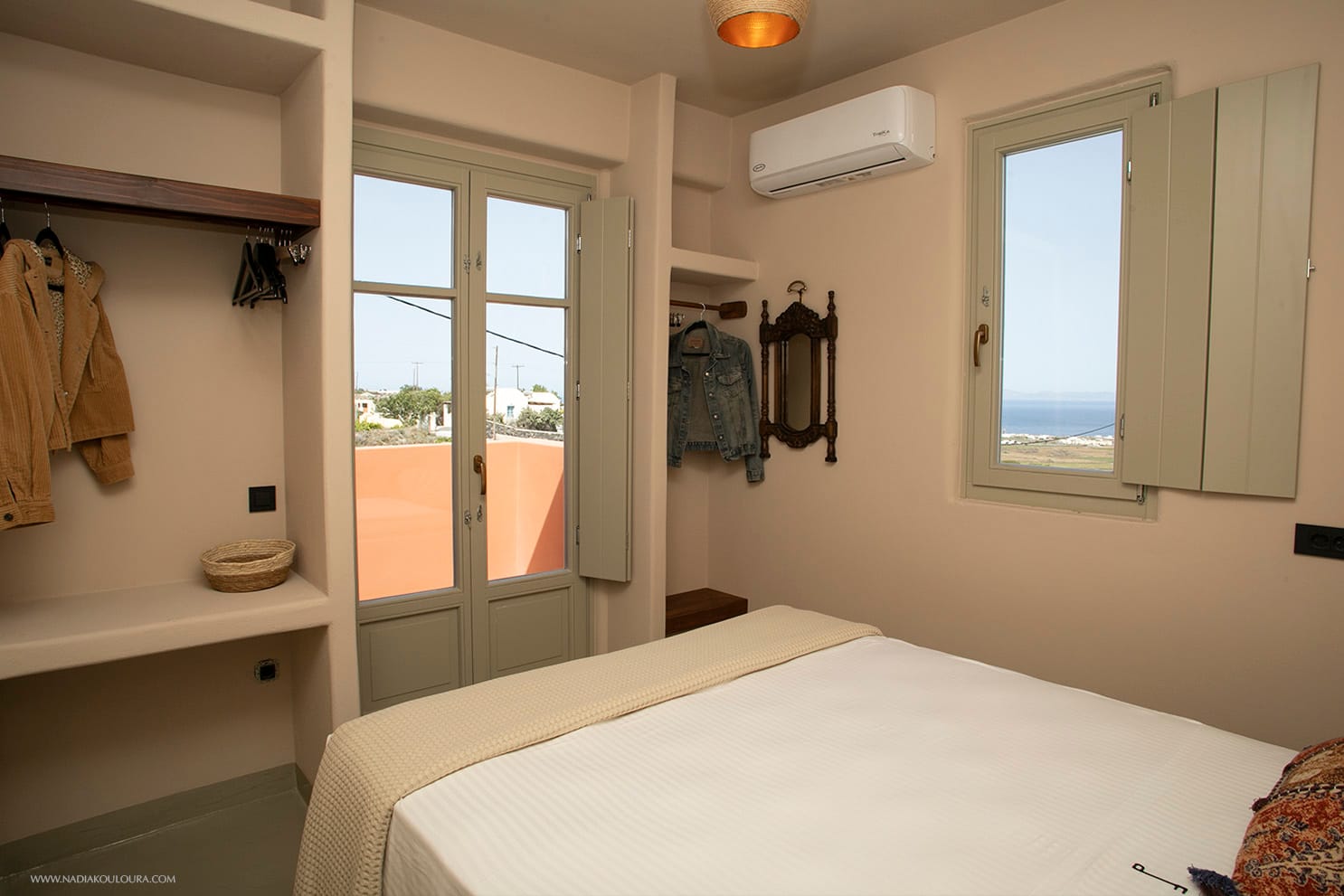 On the ground floor, there is an additional bedroom spacious enough to be considered a studio apartment or guest house attached to the main villa. This area features a private entrance, a walk-in closet, a beautiful bathroom, a kitchenette, a queen-size bed, a sofa bed, and ample space for a cot if you have a young child. It is a beautiful and practical addition to the main villa, perfect for families or guests seeking extra privacy.