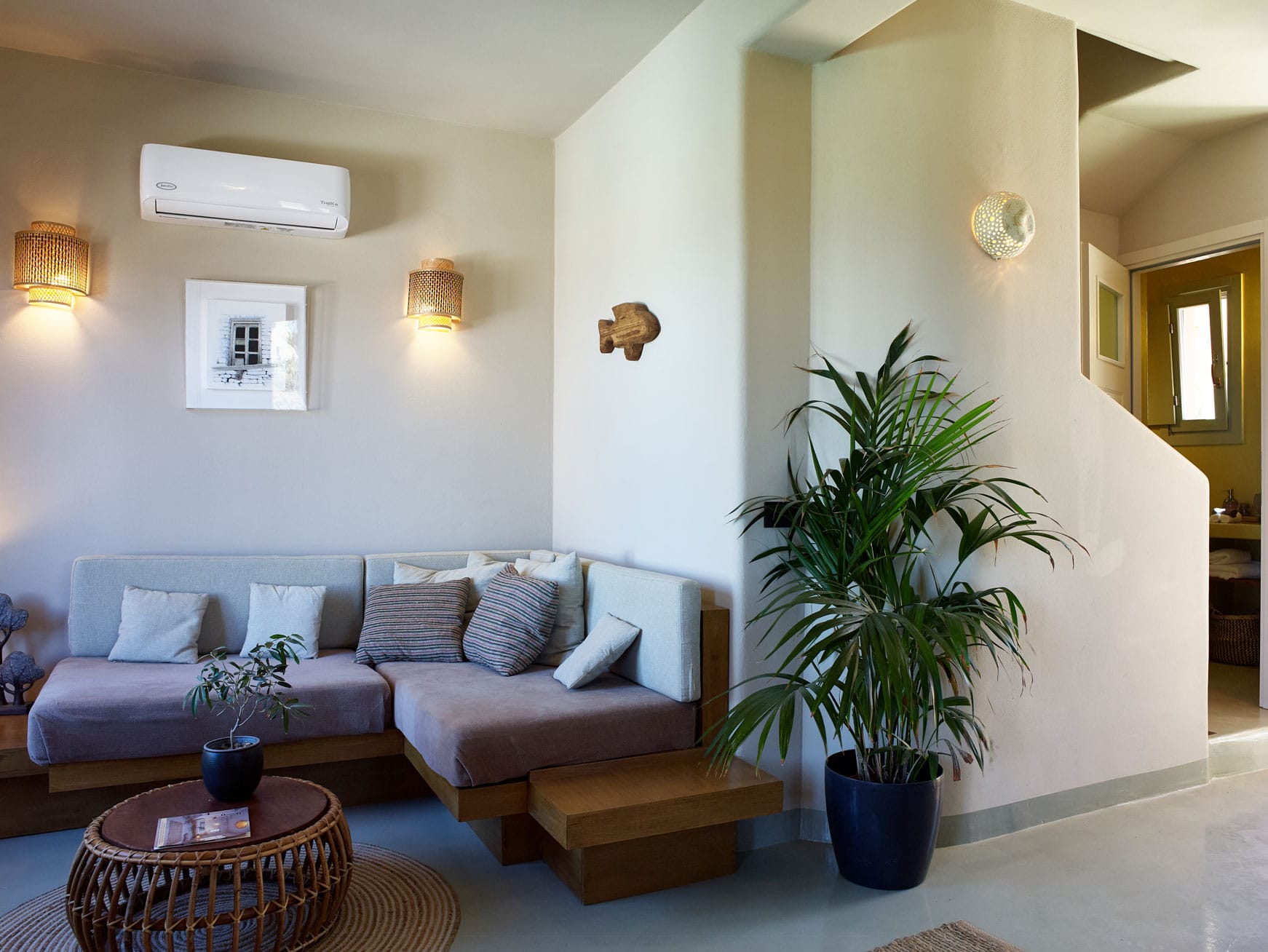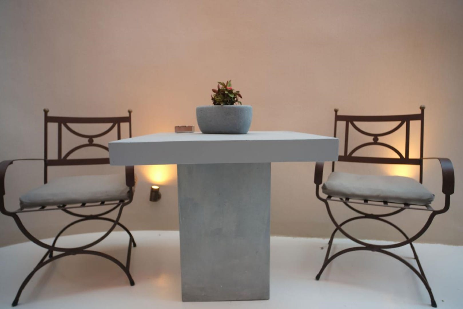 Within this villa, there are three distinct dining areas: one indoors and two outdoors. Moving to the first floor, you'll find two beautifully furnished bedrooms, each with comfortable queen beds and signature bedding, alongside balconies that overlook the Aegean Sea and the enchanting Santorini sunset. You can rest assured that all linens, mattresses, and toiletries provided in this villa are of exceptional quality.