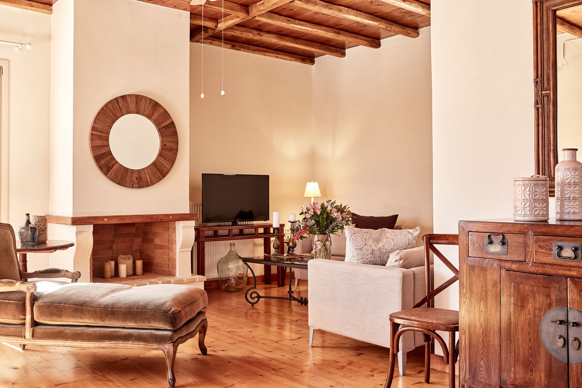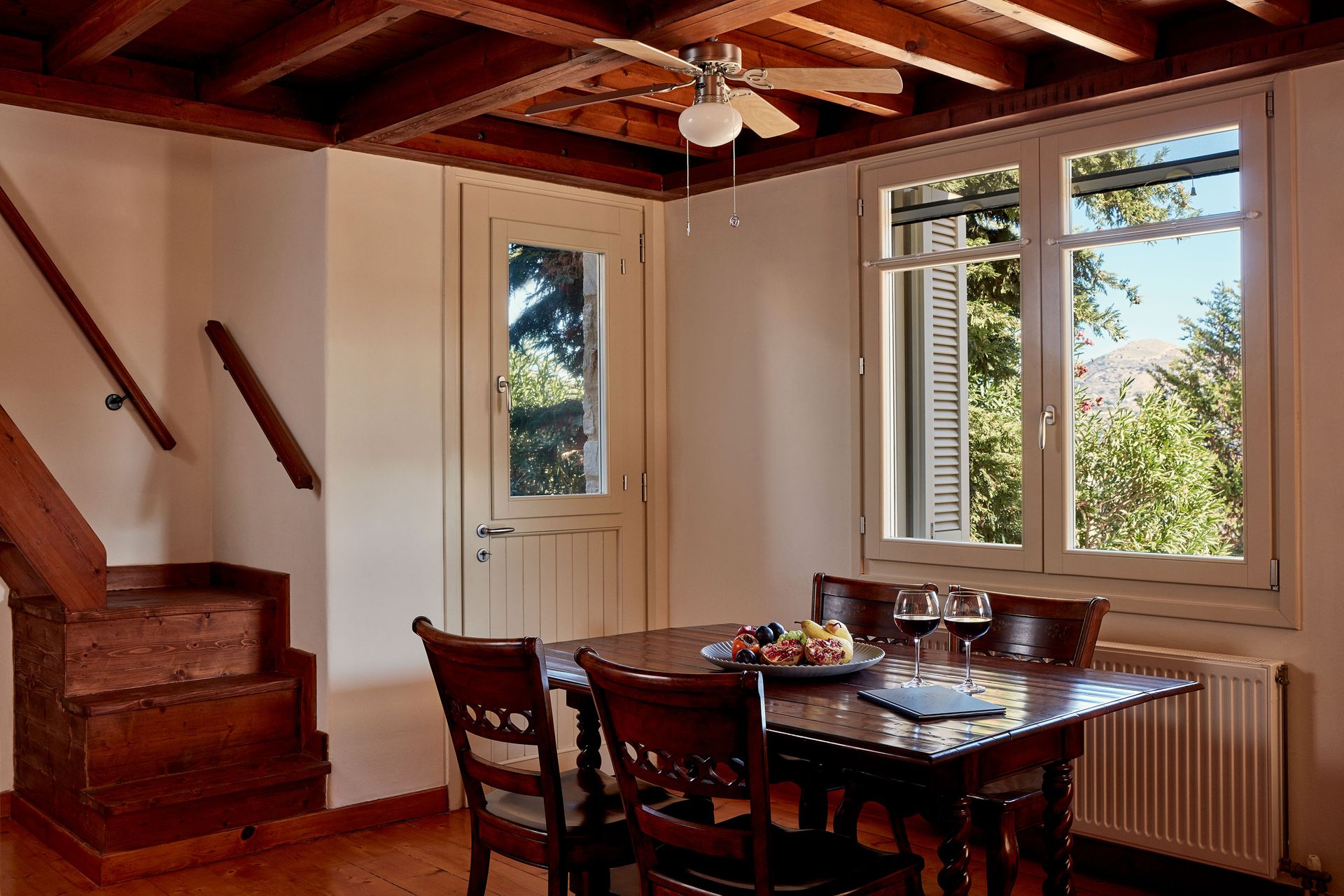 1st floor: Includes 3 bedrooms with balconies offering spectacular panoramic views and air conditioning. The master bedroom features a queen-sized bed, wall-to-wall closet, wooden beam ceiling and en suite bathroom. The second bedroom features a queen-sized bed and the third is equipped with a single bed. Both bedrooms include ceiling fans and the entire villa is equipped with air conditioning.