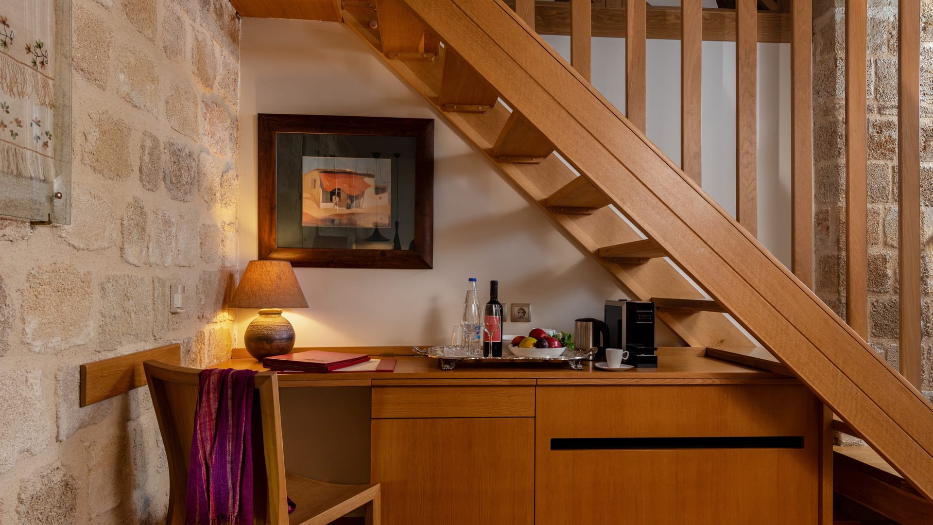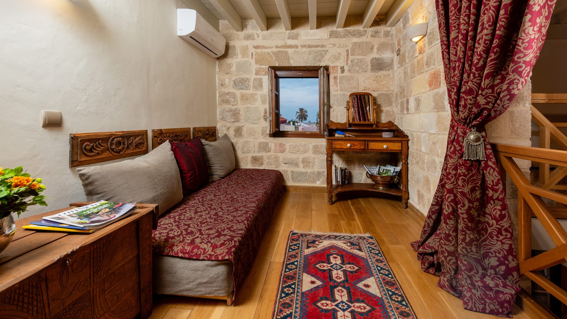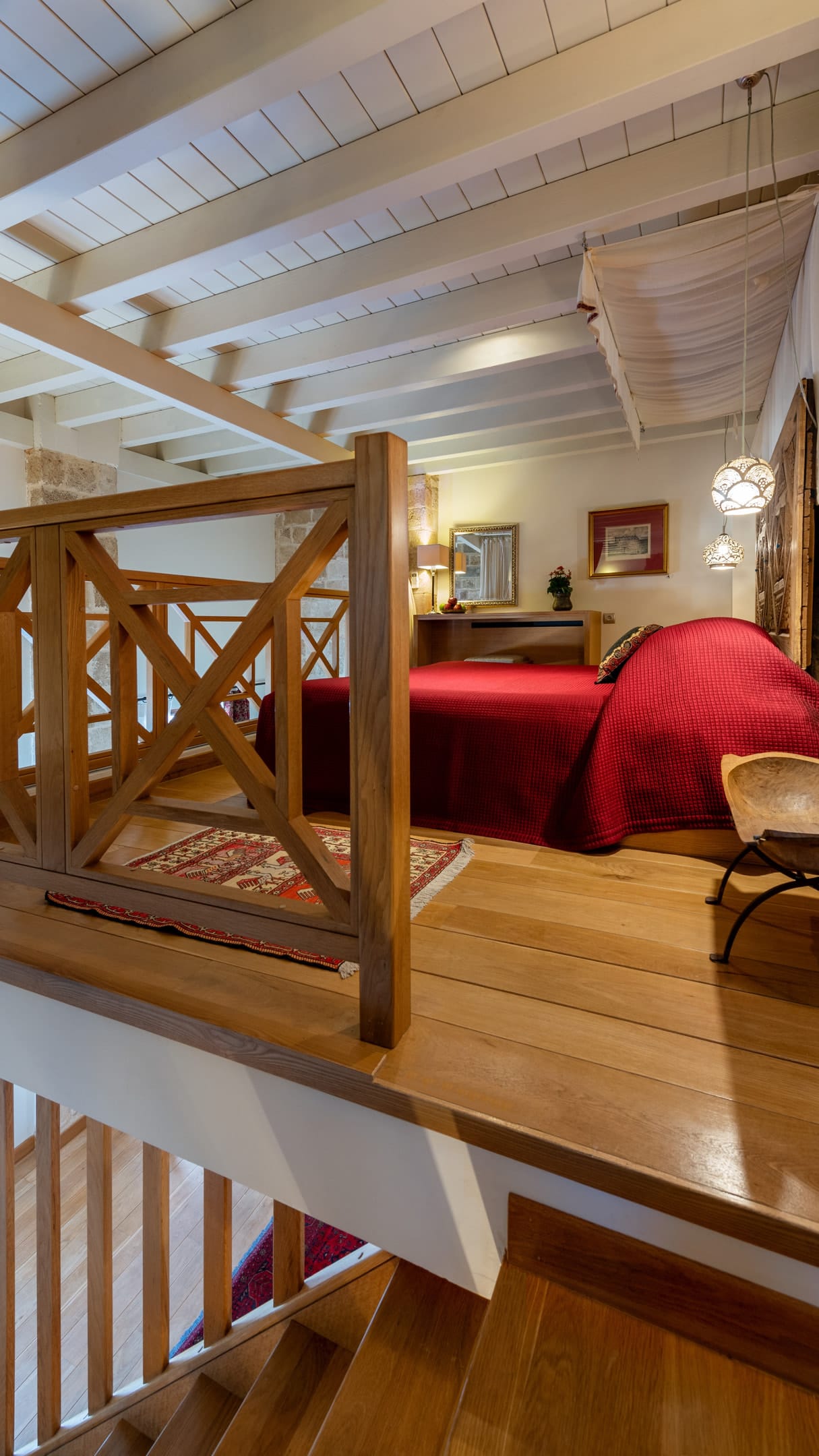 This spacious and full of sunlight suite is located on the first floor. Its 58 sq.m. (625 sq.f.) are open-plan on two levels.