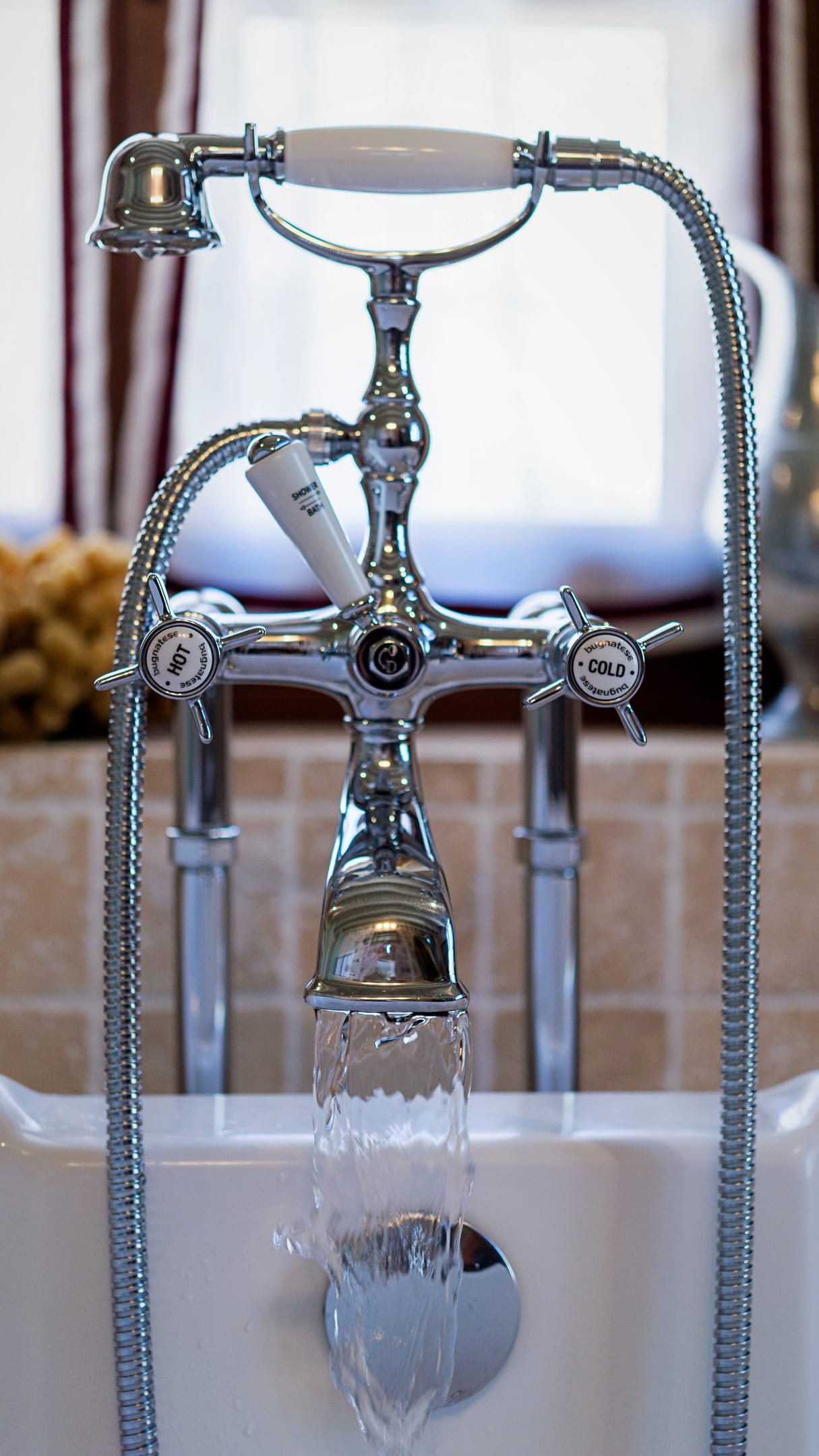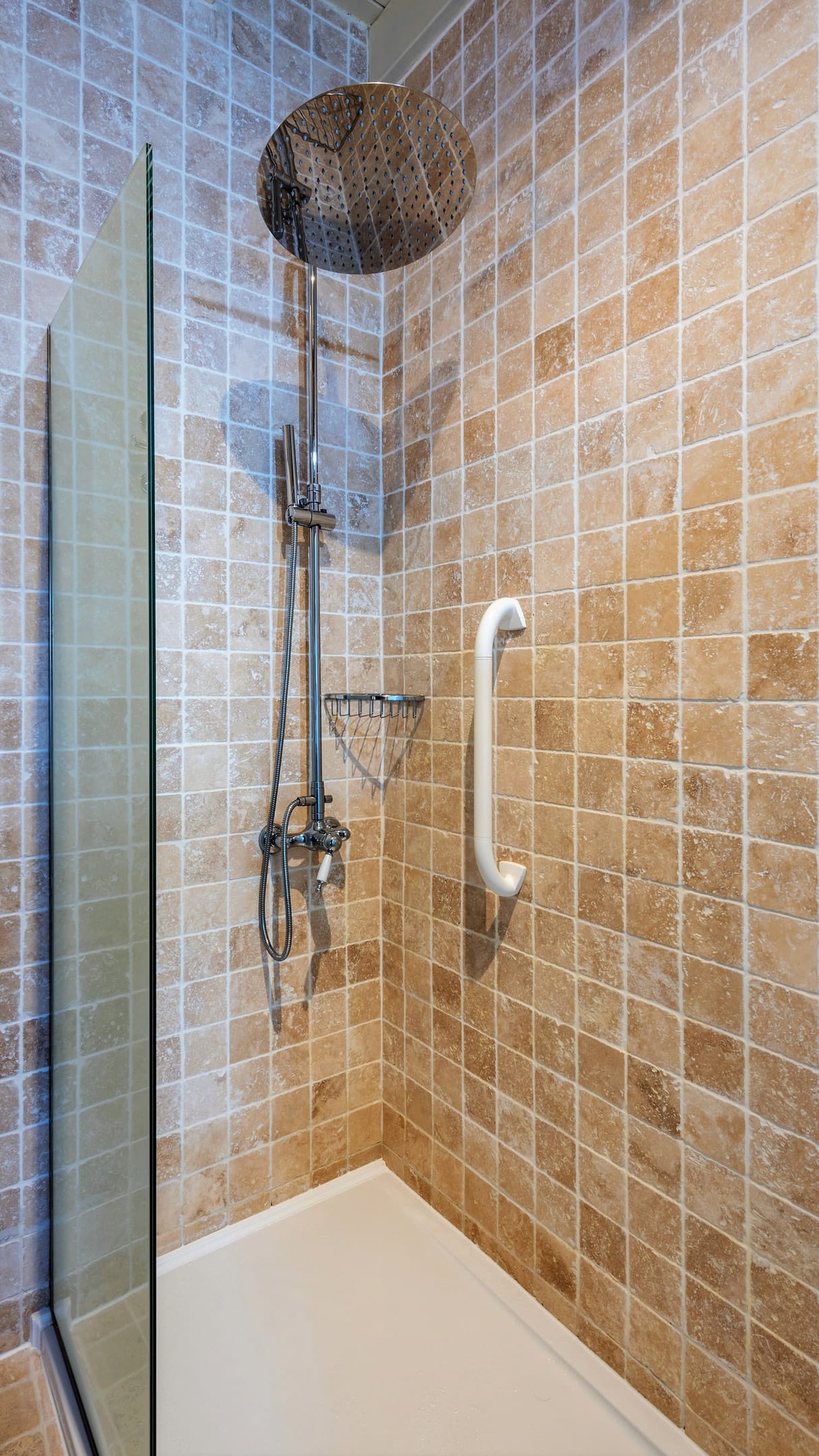 The bathroom is on the lower lever of the suite, and has a freestanding bathtub and a separate shower cabin with a 40cm rainfall shower head.