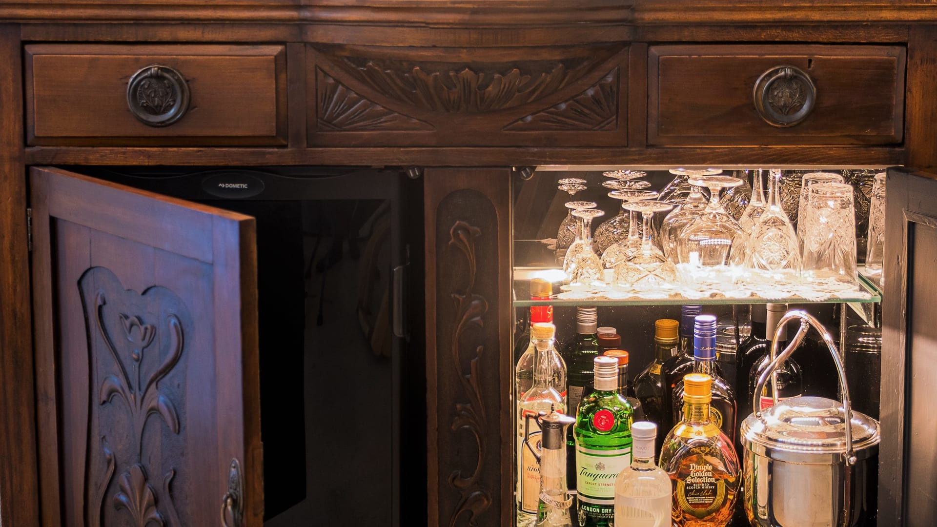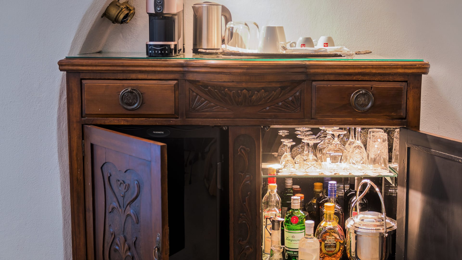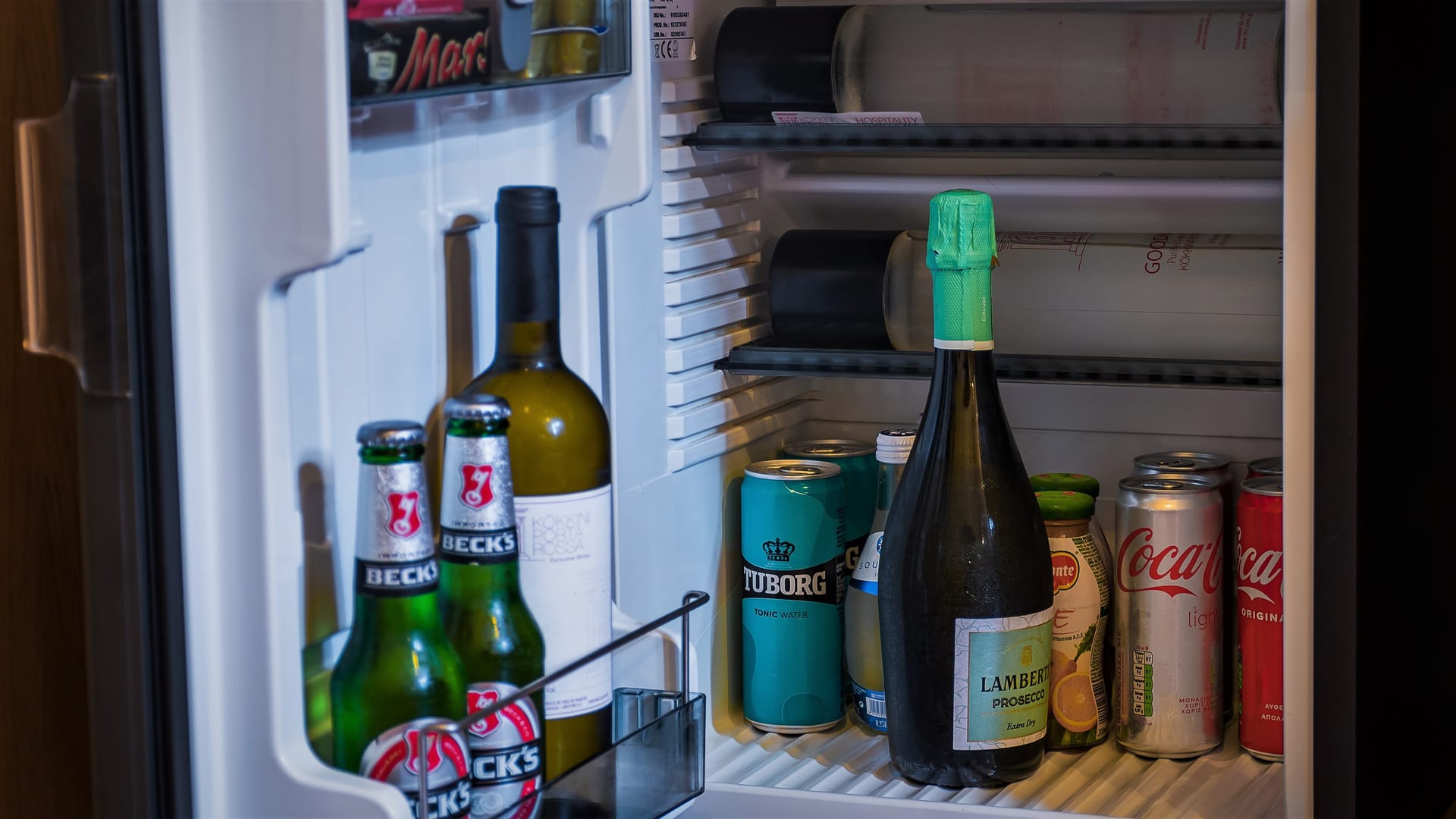- Decanters of top-branded alcoholic drinks, red and white wine, as well as some of the best Greek liquors and spirits,