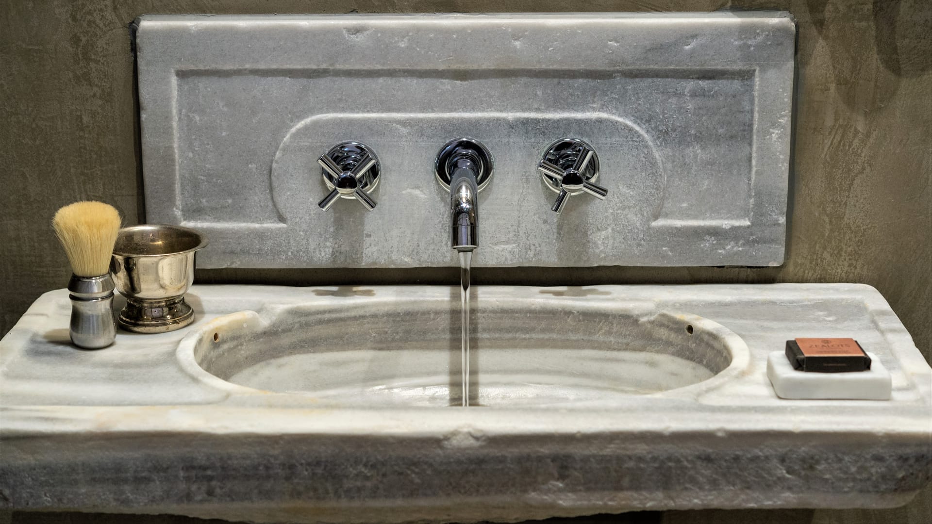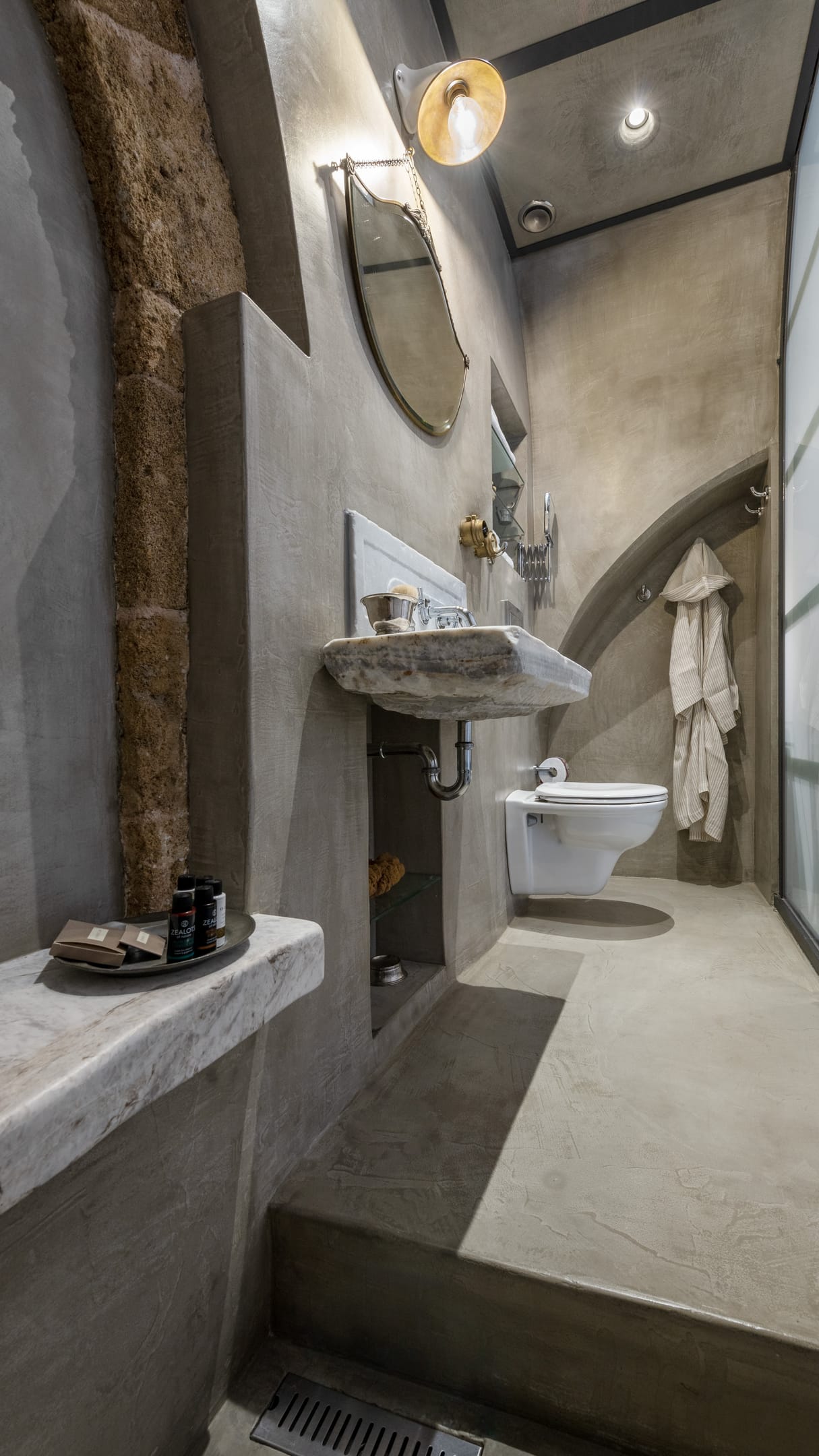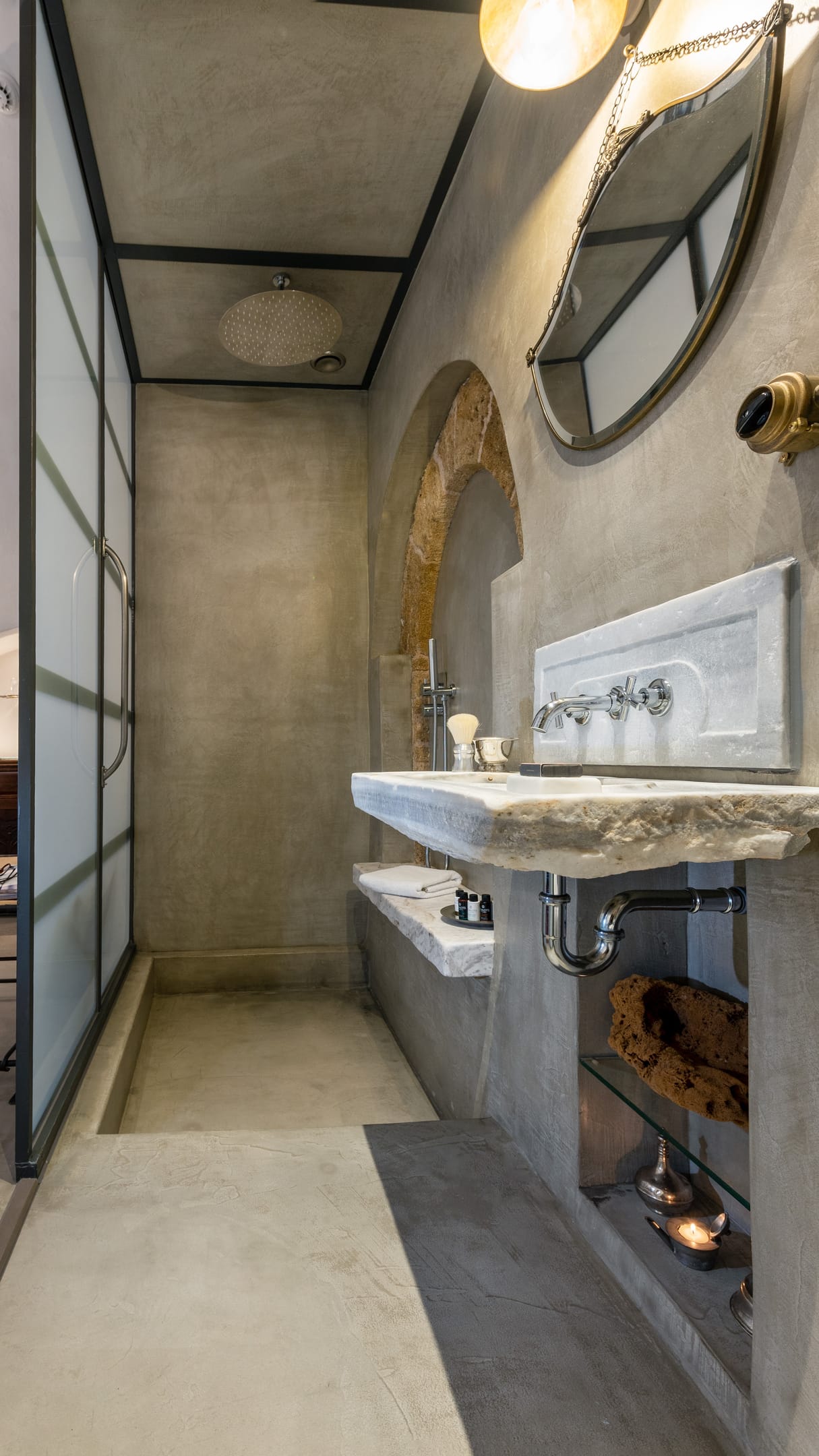 Its bathroom features a “rainfall” walk-in shower, a marble antique sink, 1920’s lamp and mirror.