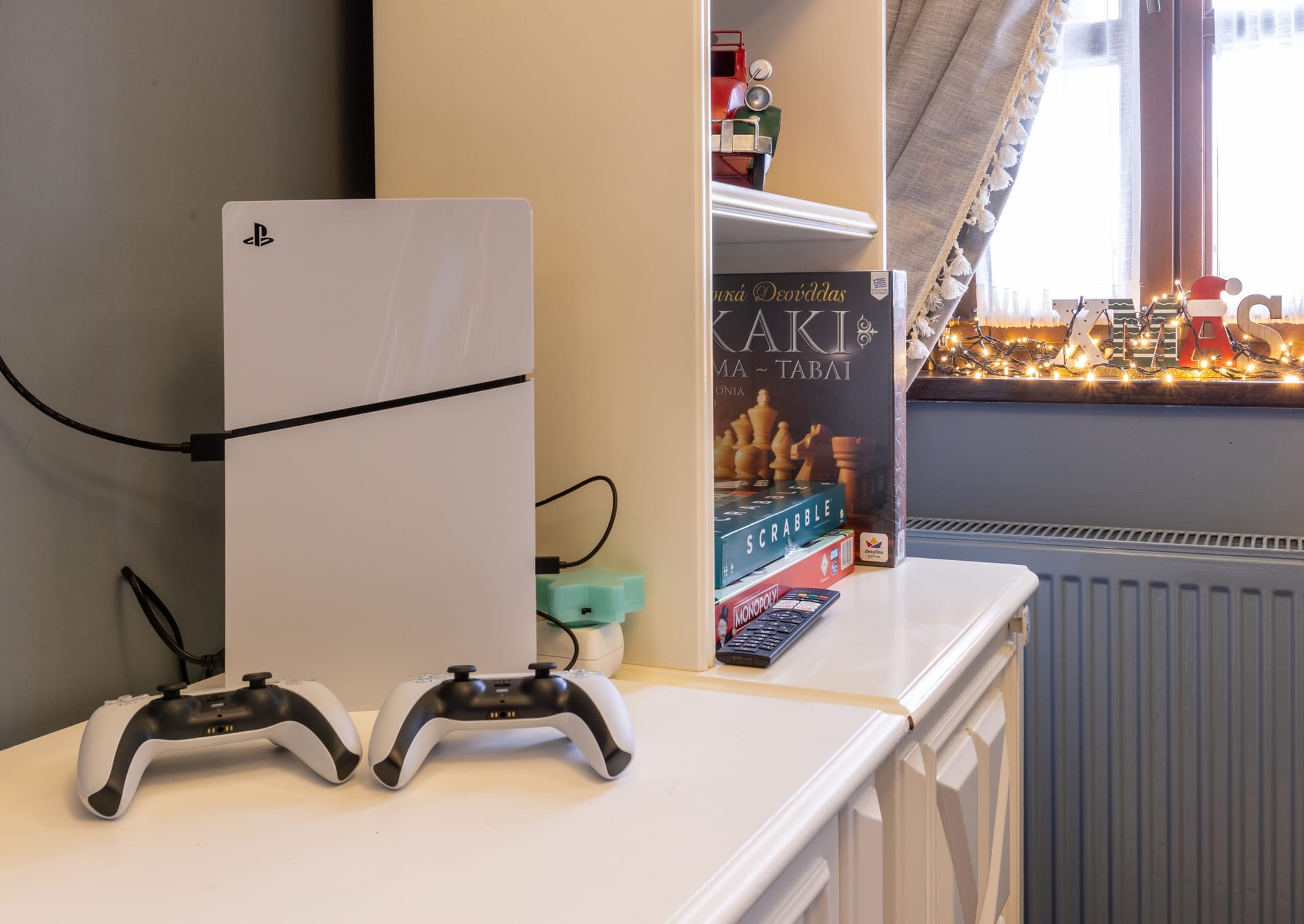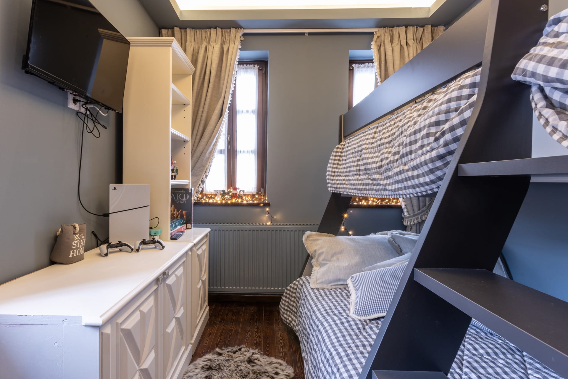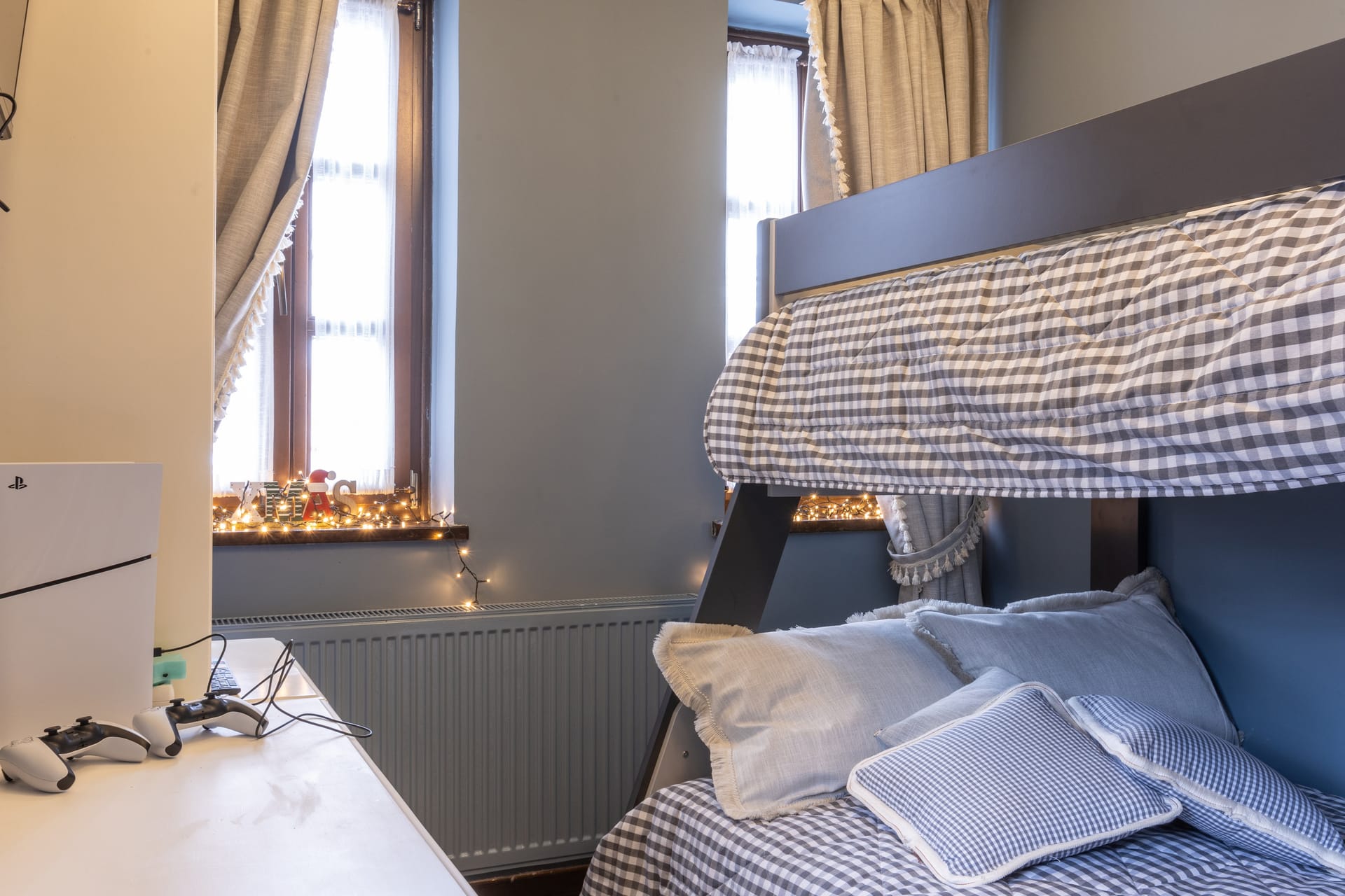 - First floor: One bedroom with a double bed, and another room with a bunk bed and a PlayStation 5, perfect for family fun or entertaining friends.