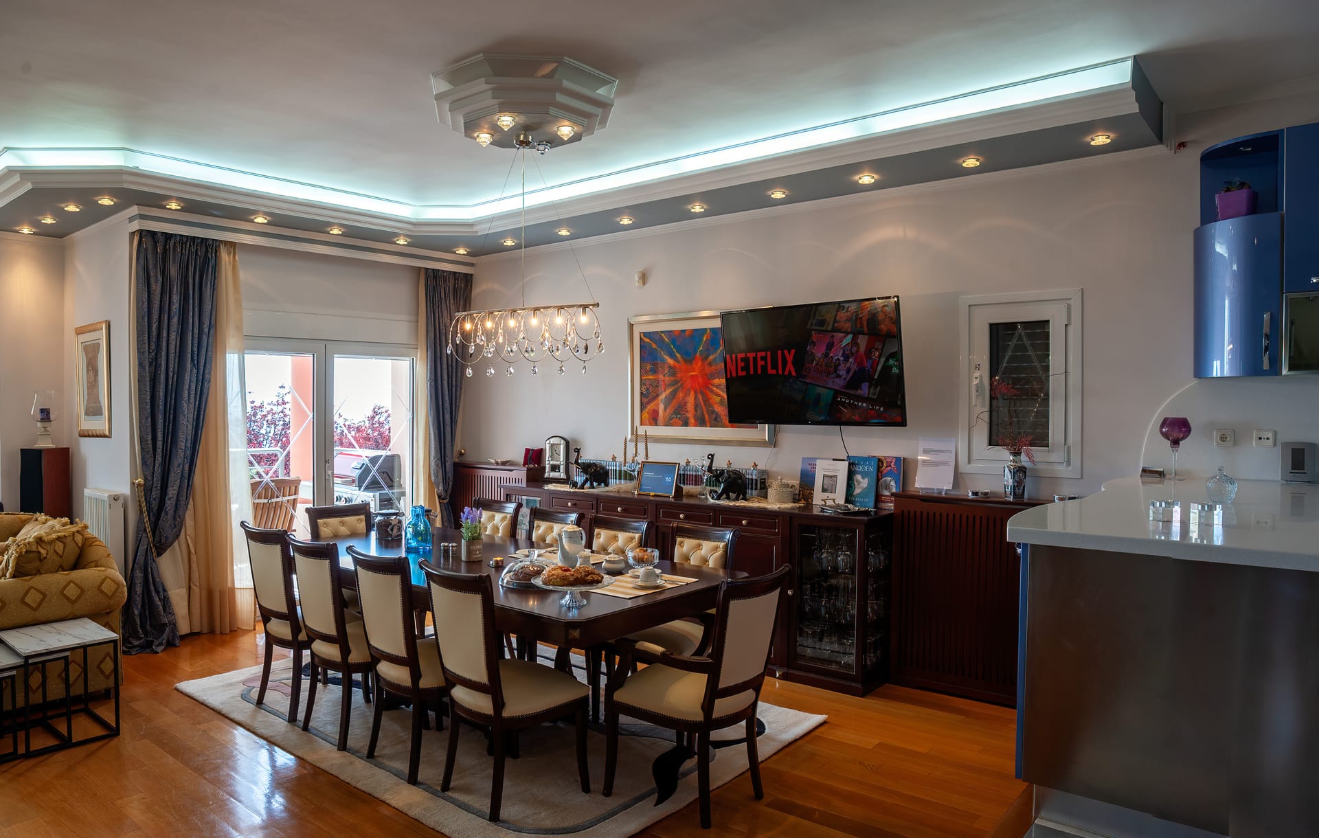 villa serenity (by the sea) is a modern, contemporary, fully furnished villa of 360 sq.mtrs and one acre of plants, fruits and decorating trees, located in the heart of kymi. The villa is characteristic of a small museum, because its decoration is of high quality s material with stucho veneciano and vetro in glass technique, its curtains are of pure silk and coppies of Fornasseti s paintings, most of the lights are of famous Architects from Milano and all its decoration has designed by Greek Architects, one of them is Mr. G.Kritharis. It can serve nine persons.there are 4 bedrooms, luxury kitchen of all amenities, living and dining room, desk room, big verandahs with city, mountain and sea view. in master bedroom of 50 sq.mtrs there are: fire place (there is one extra in living room), cloakroom, secretaire and a big zaccuzi bath. there are 2 luxury baths and 2 wcs. on the loft there are 3 single beds, 1 wc and 1 mini refrigerator. all other bedrooms have queen size beds with mattresses of high quality, anatomic, orthopedic and hypoallergic, not only for sleeping but also for living. independent main entrance. free of charge: wifi (code given upon arrival), 2 car parking positions, satellite tv and airconditioning in all rooms, aparatus excercise. villa is of three levels with stairs. there are beaches in short distance, the famous honeftiko with curative springs and lots of mountains for adventure and excursions. there are also supermarkets, restaurants, bars and lots of shops, big hospital as well. we can show you around. furthermore, those who love andentures, our district can offer gorgeous places for walking, diving, swimming, climbing and riding. please, do not forget to try it. first food facilities for your first breakfast are free of charge. a wellcome drink with sweets and snakcs are waiting for you. keys are given to you upon your arrival along with additional information. our folklore museum will surprise you with its performances, during summer period, as well as lots of events are happening during summer that will leave you speechless. please do not miss to taste local cuisine, we can teach you some recipes if you wish. Smoking and pets are not allowed.