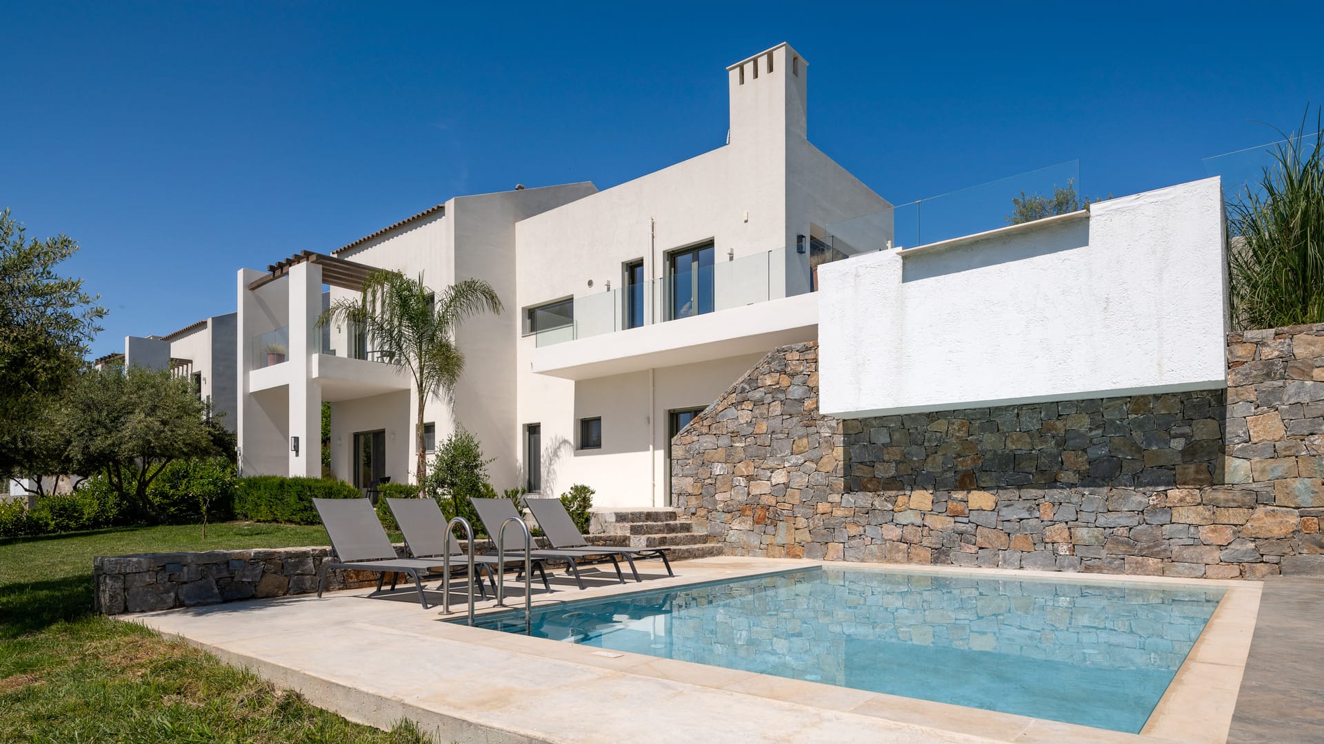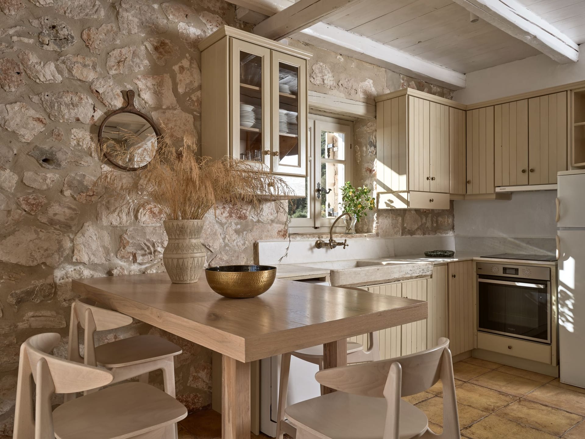 The main house and the stone-built bungalow. In the interiors, the main house offers extra spacious living and dining areas, a modern fully equipped kitchen, a study area, four bedrooms, 4 bathrooms and a WC.