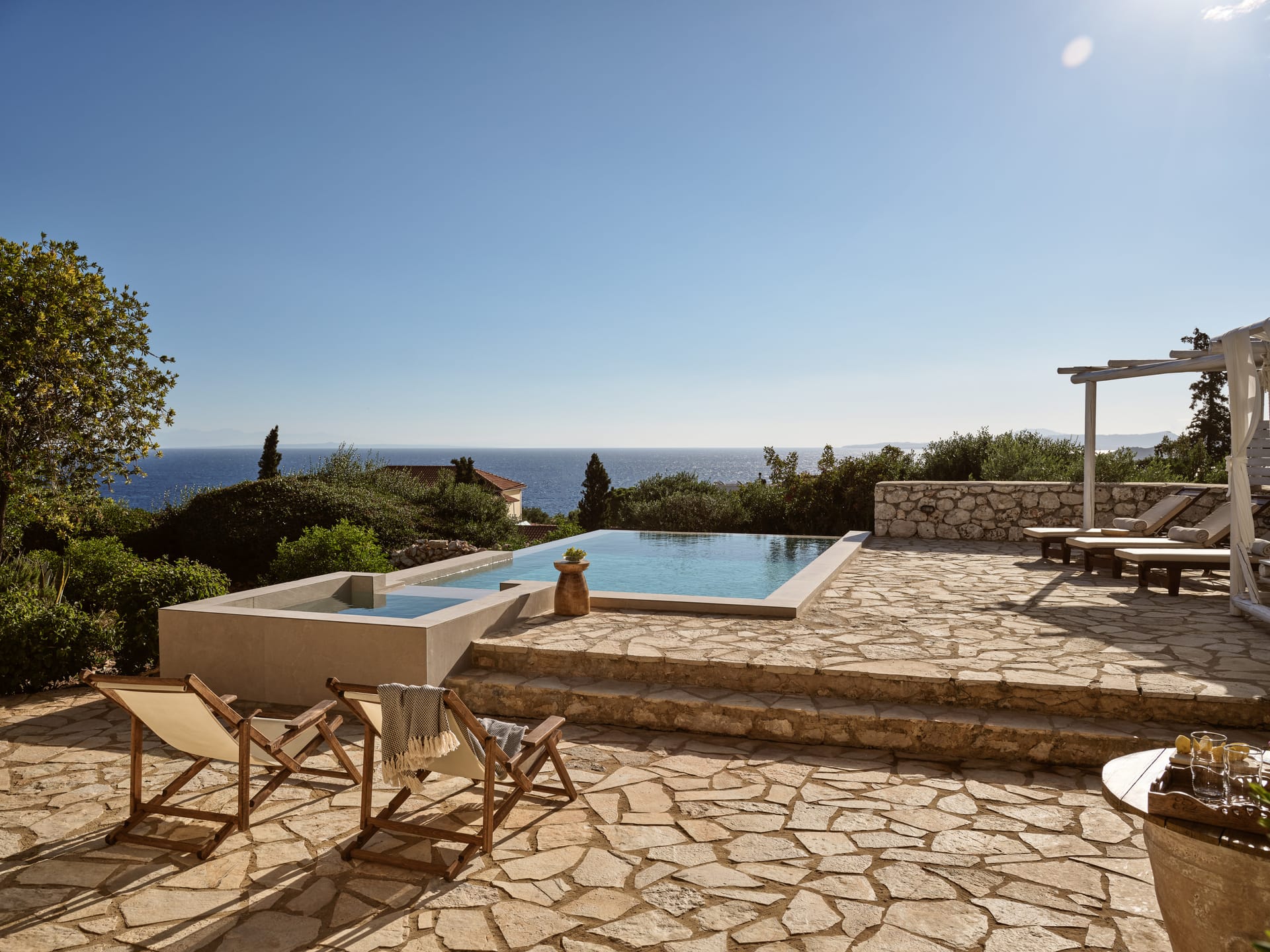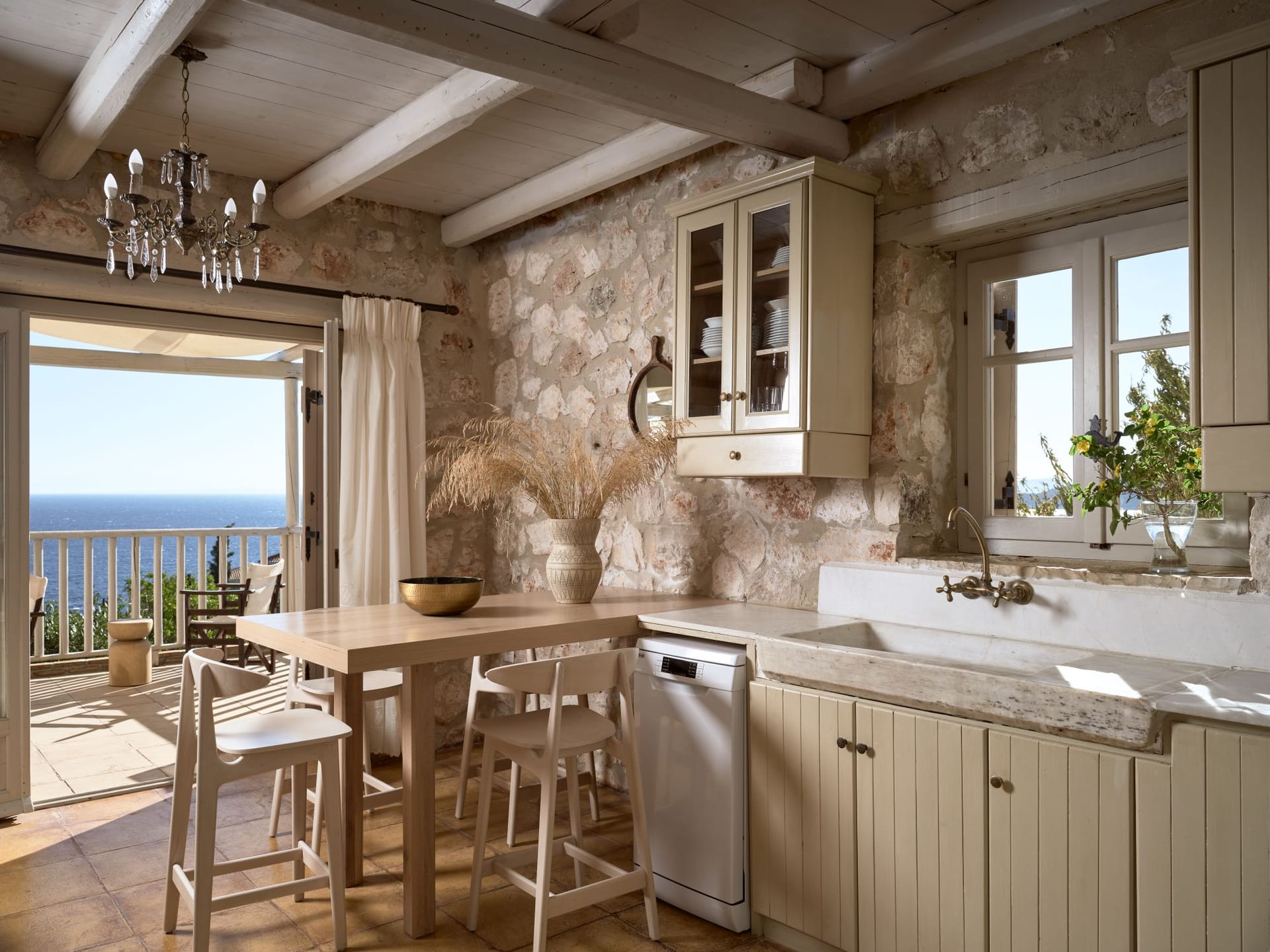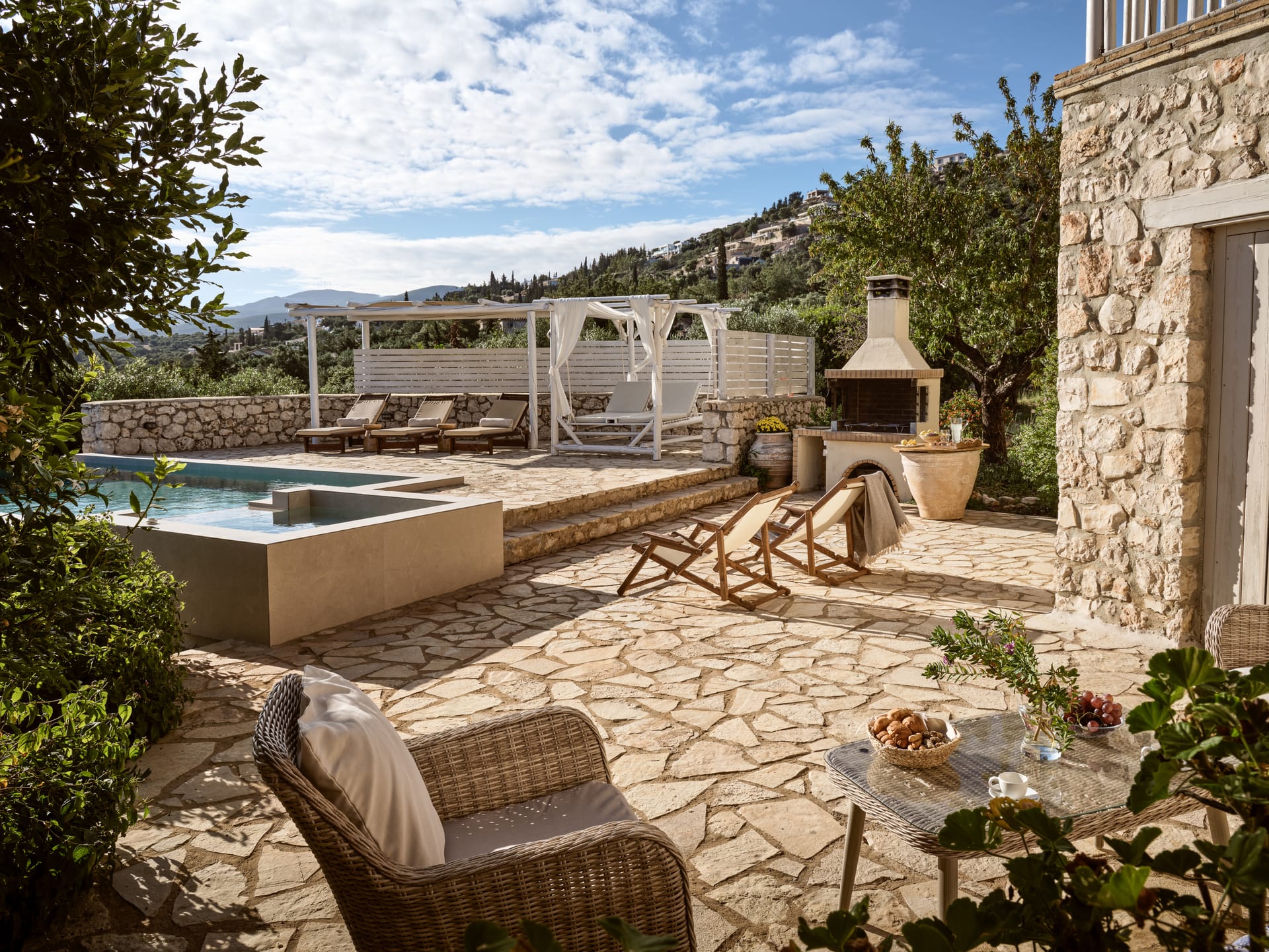 The chilling out and outdoor living areas at Villa Shangri-La Zakynthos are ample. Dining al fresco awaits. You are in Greece after all. And if you happen to enjoy outdoor cooking, here you can indulge in barbecues under the glass vaulted ceiling and dine on the dining table for a real Mediterranean feel.