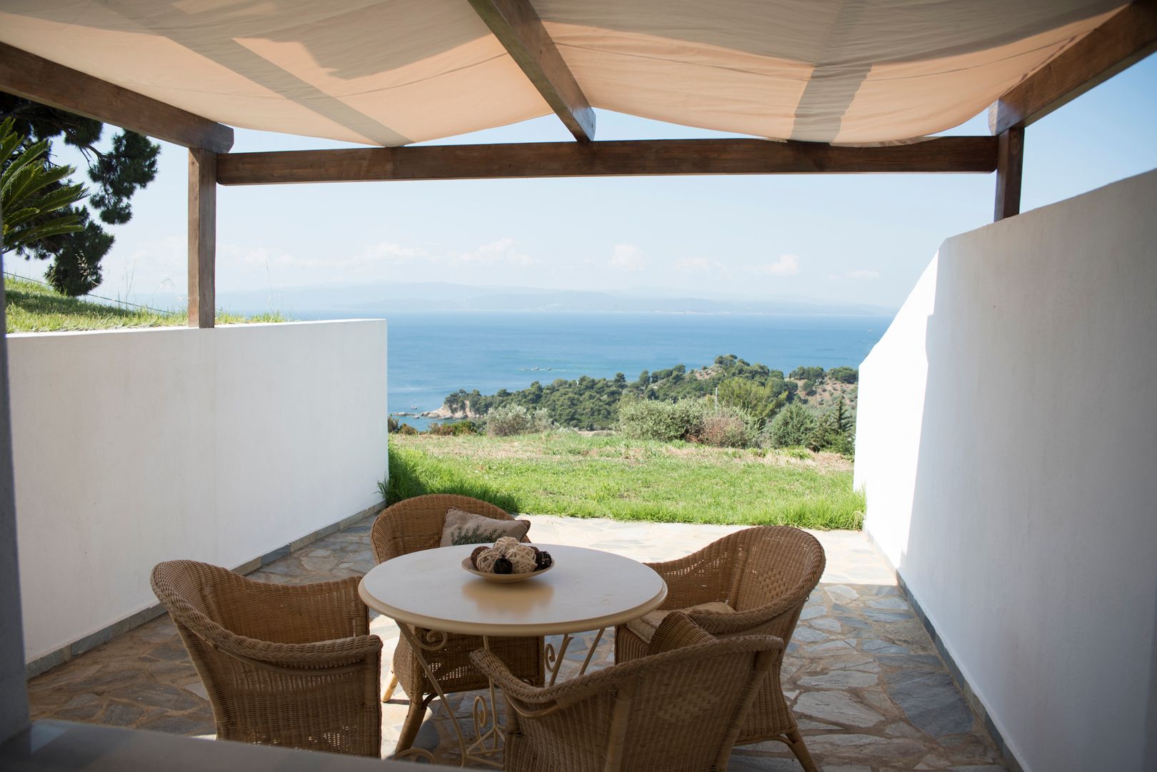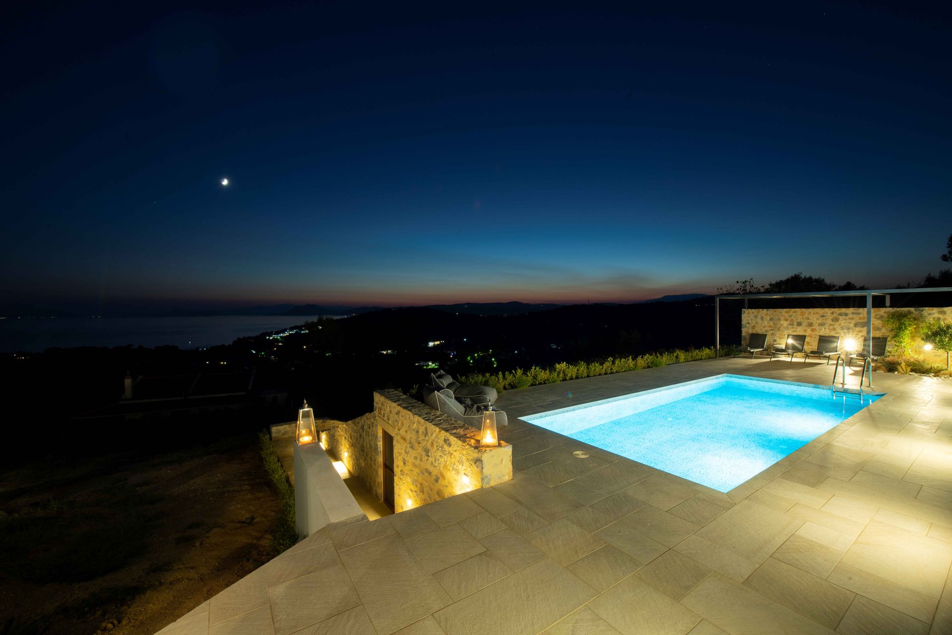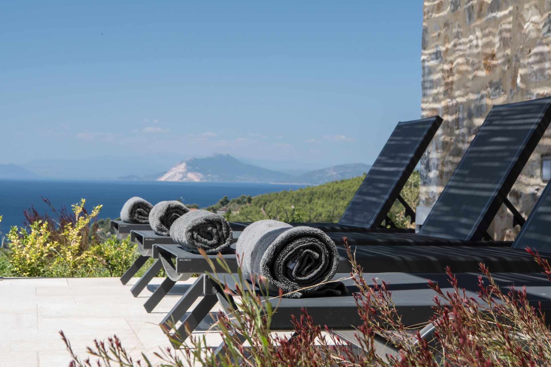 Skiathea Villas are situated in a fabulous raised position of Koumarorachi hill overlooking the brilliant blue sea at Agia Paraskevi and Troulos bays on the stunning Greek island of Skiathos. The domination of Skiathian rock building elements along with the minimalistic design style provide the ideal destination for those who seek peace, privacy and relaxation while on vacation. Our luxury accommodation is suitable for everyone who enjoys spending time together with their friends, for couples and families.Special care has been given to the private pool area (40 sqmt) that offers the best views in Skiathos.