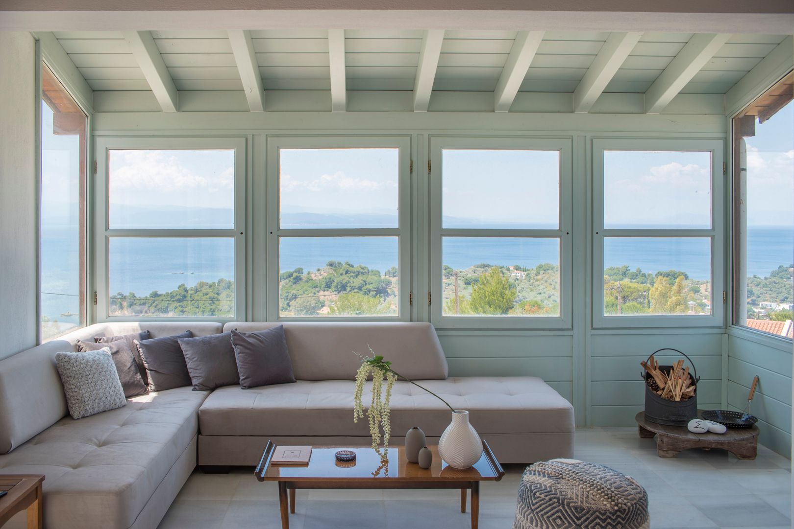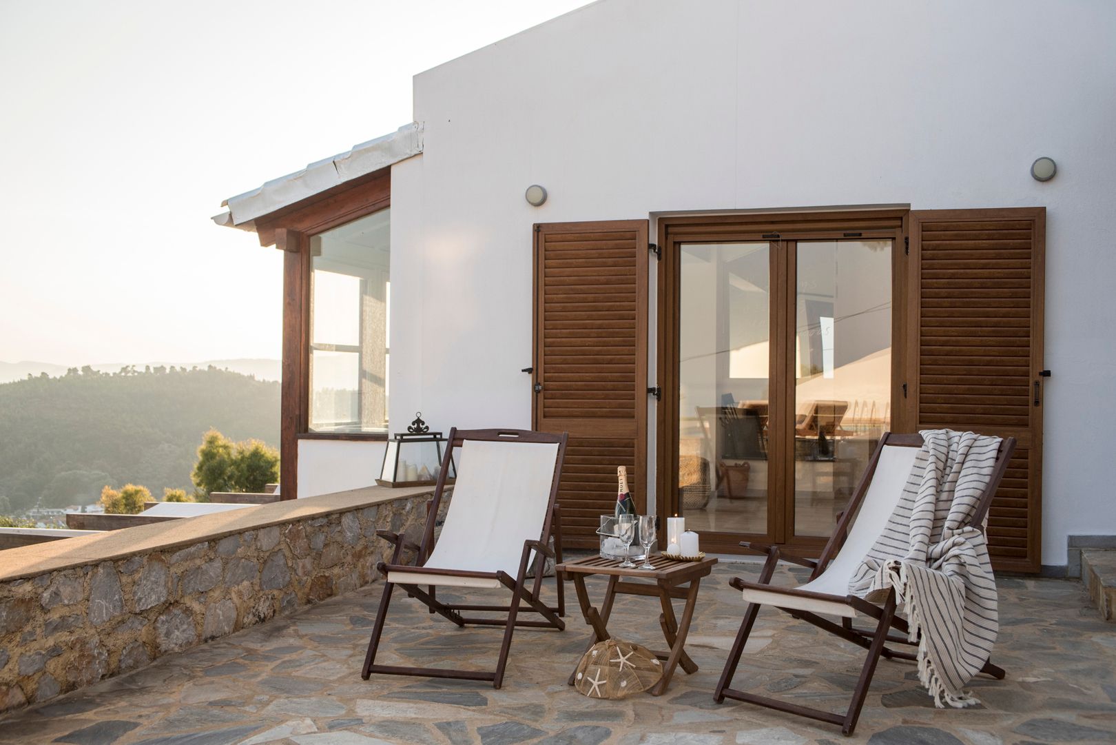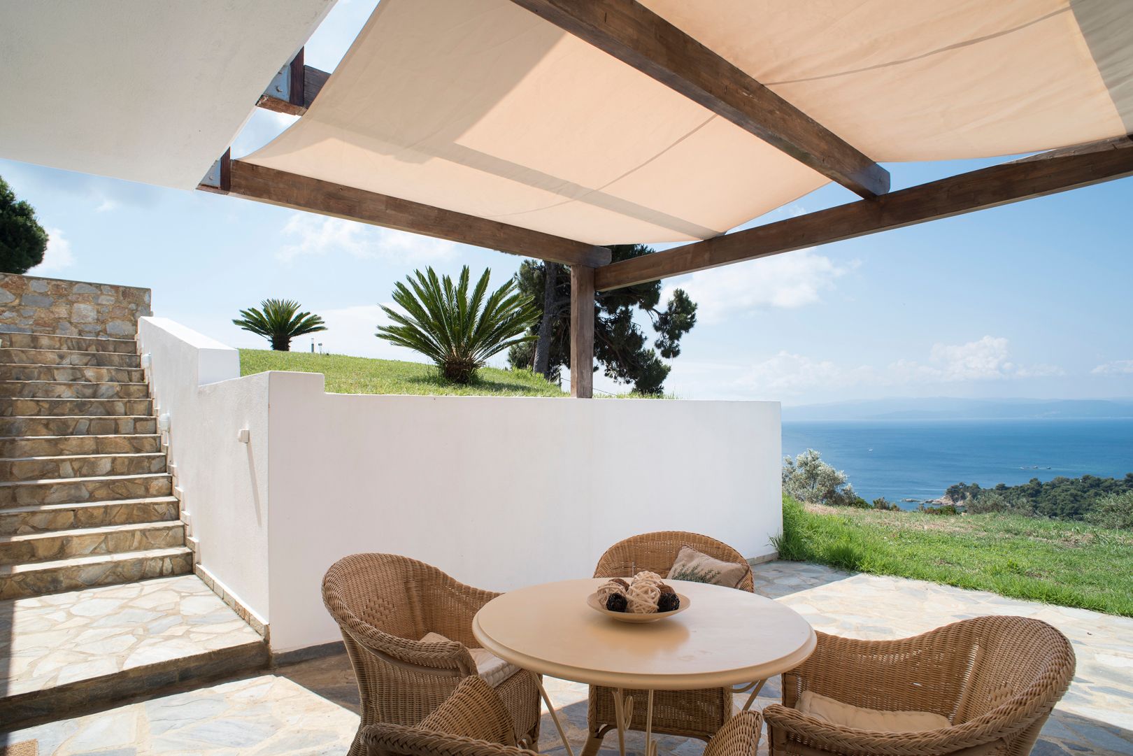 Skiathea Villas are situated in a fabulous raised position of Koumarorachi hill overlooking the brilliant blue sea at Agia Paraskevi and Troulos bays on the stunning Greek island of Skiathos. The domination of Skiathian rock building elements along with the minimalistic design style provide the ideal destination for those who seek peace, privacy and relaxation while on vacation. Our luxury accommodation is suitable for everyone who enjoys spending time together with their friends, for couples and families.Special care has been given to the private pool area (40 sqmt) that offers the best views in Skiathos.