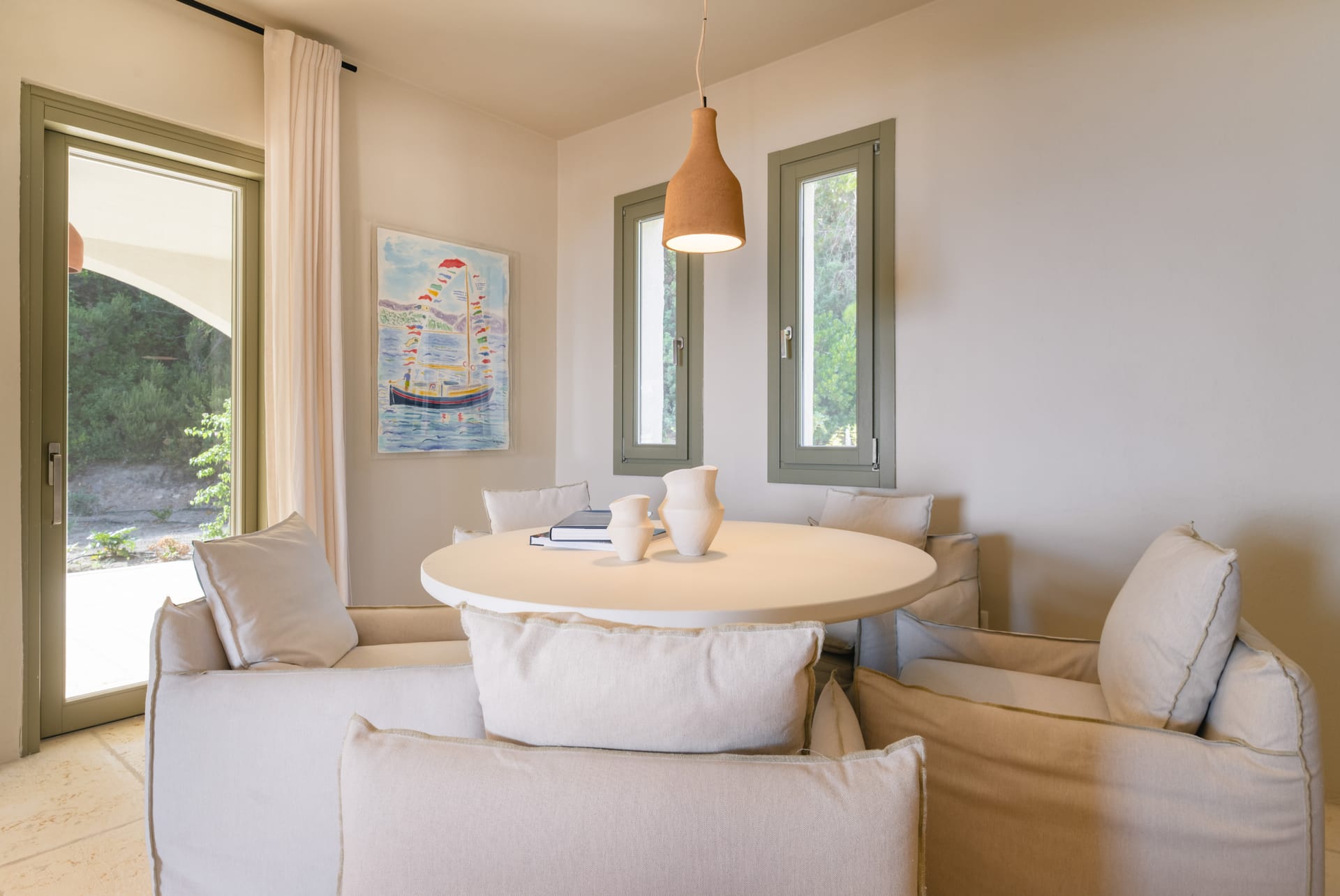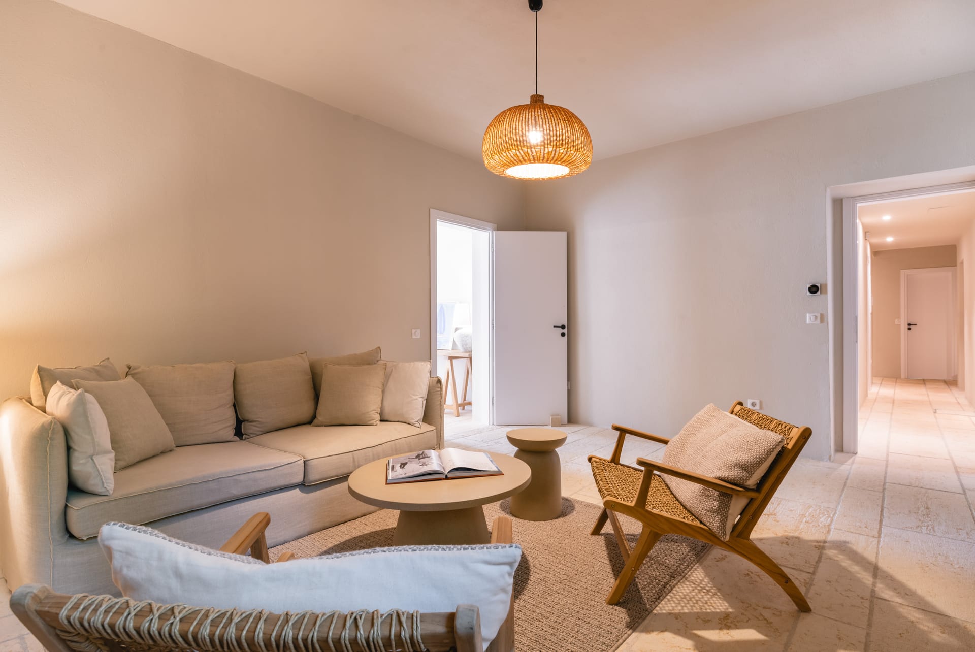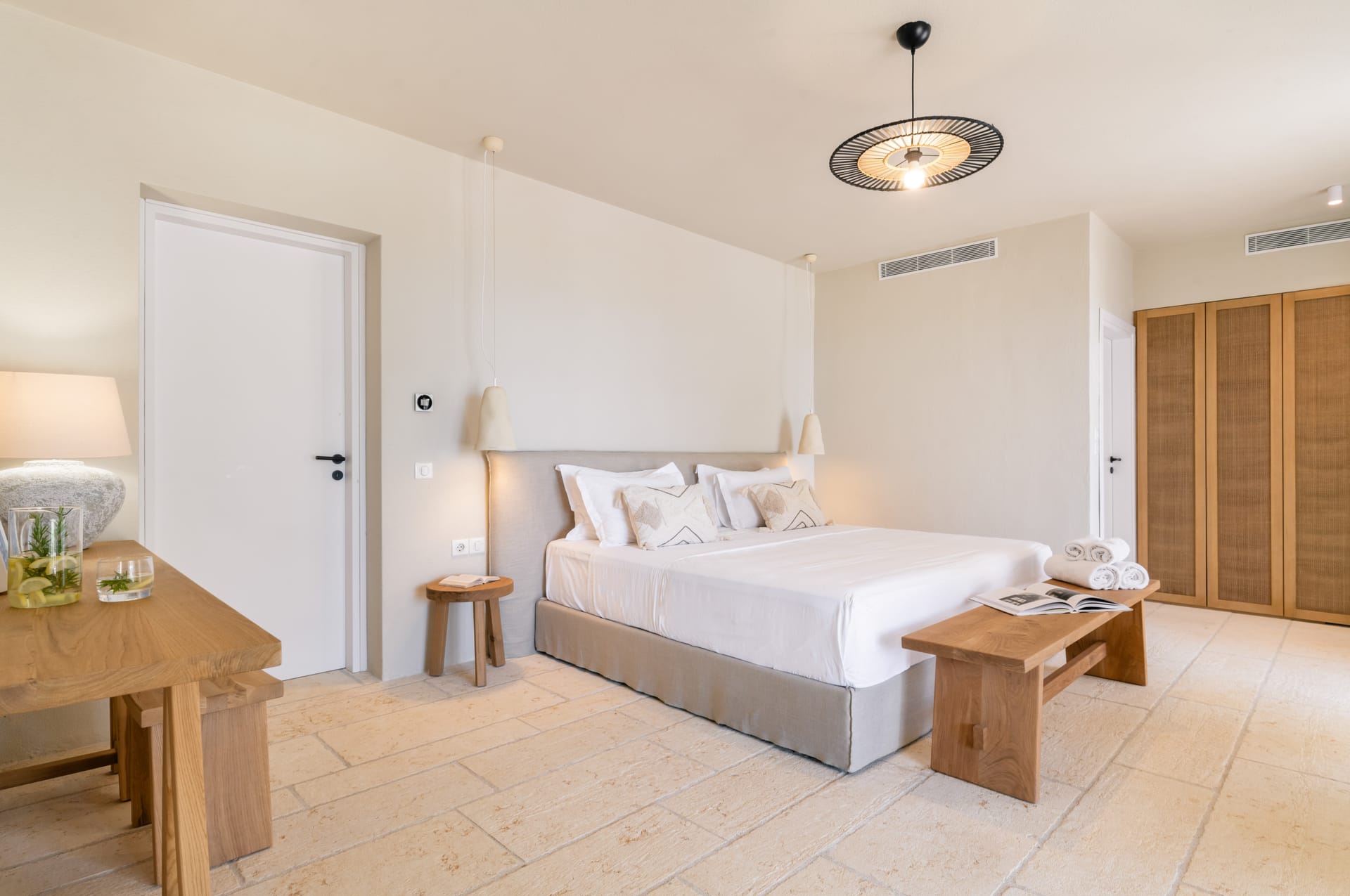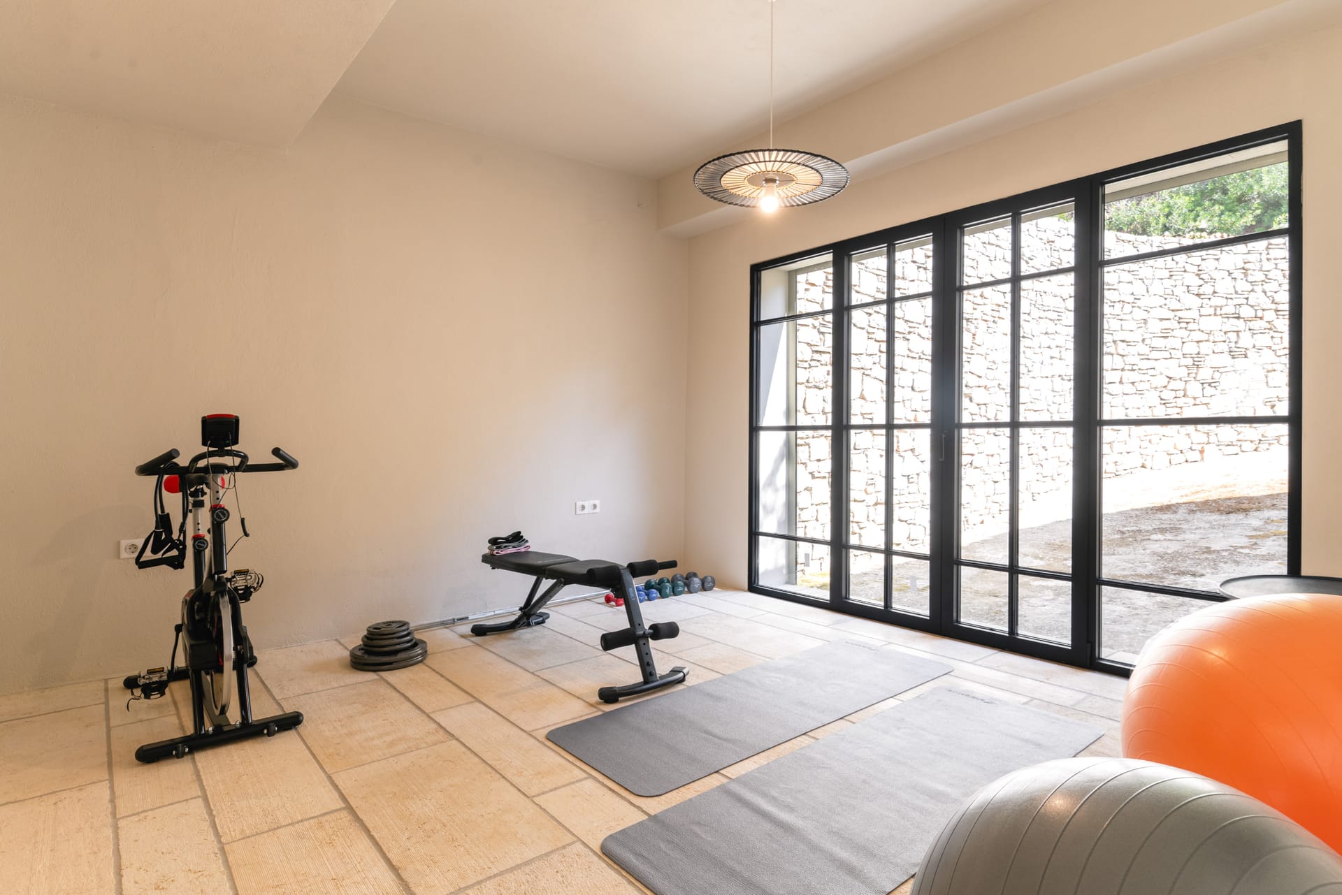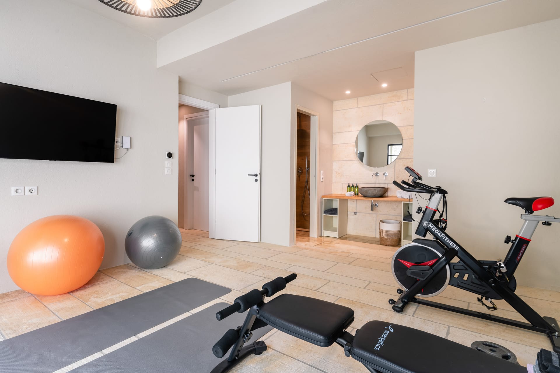 Inside, the villa features a bright and airy living room and a fully equipped kitchen, perfect for preparing meals with local ingredients. Accommodation includes six beautifully appointed bedrooms: five with queen-size beds—one of which also features a double sofa bed, making it ideal as a family room if desired—and a sixth bedroom with two single beds. With eight full bathrooms plus an additional WC, every guest enjoys privacy and convenience. For those who like to stay active, a dedicated gym space with its own bathroom is at your disposal.