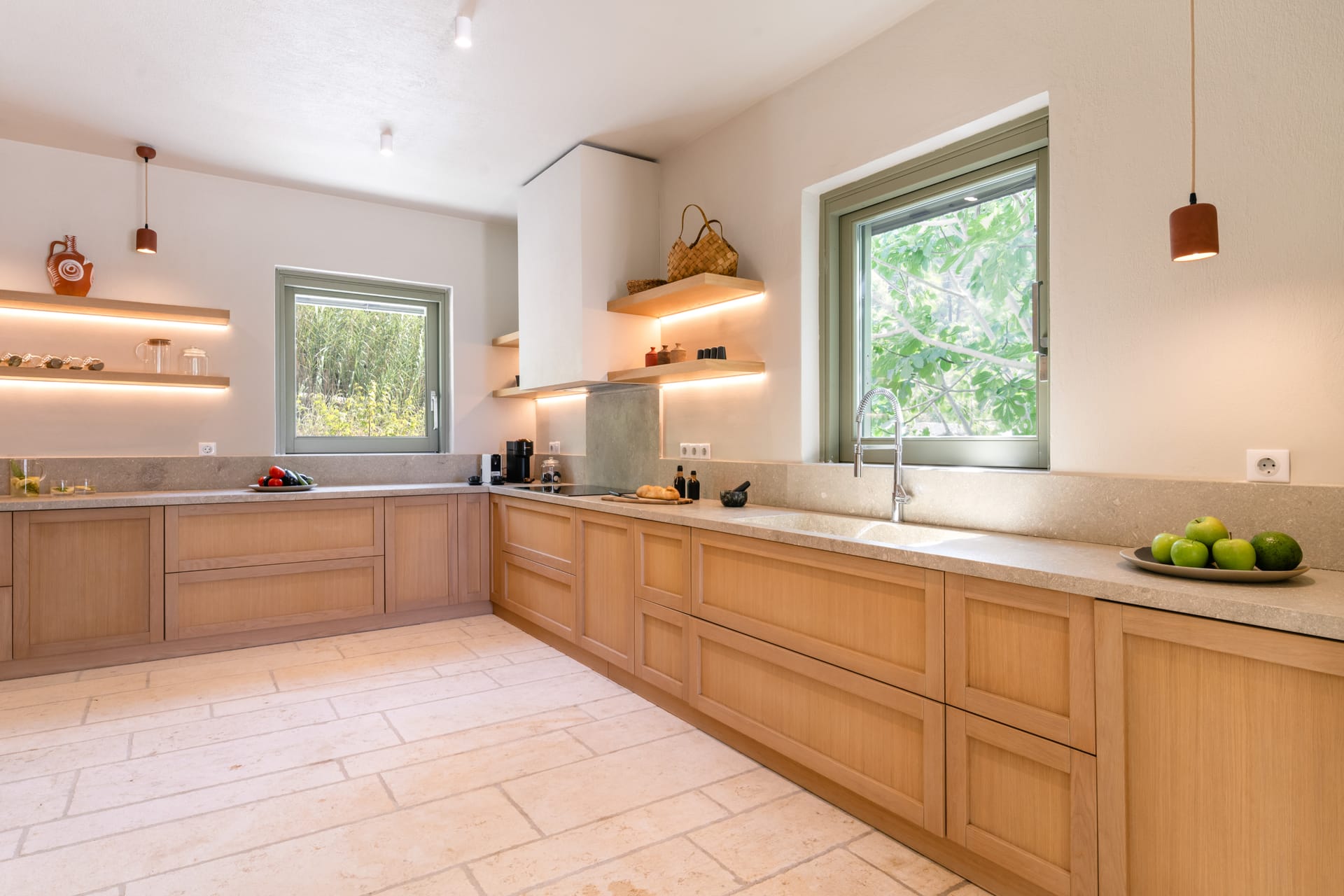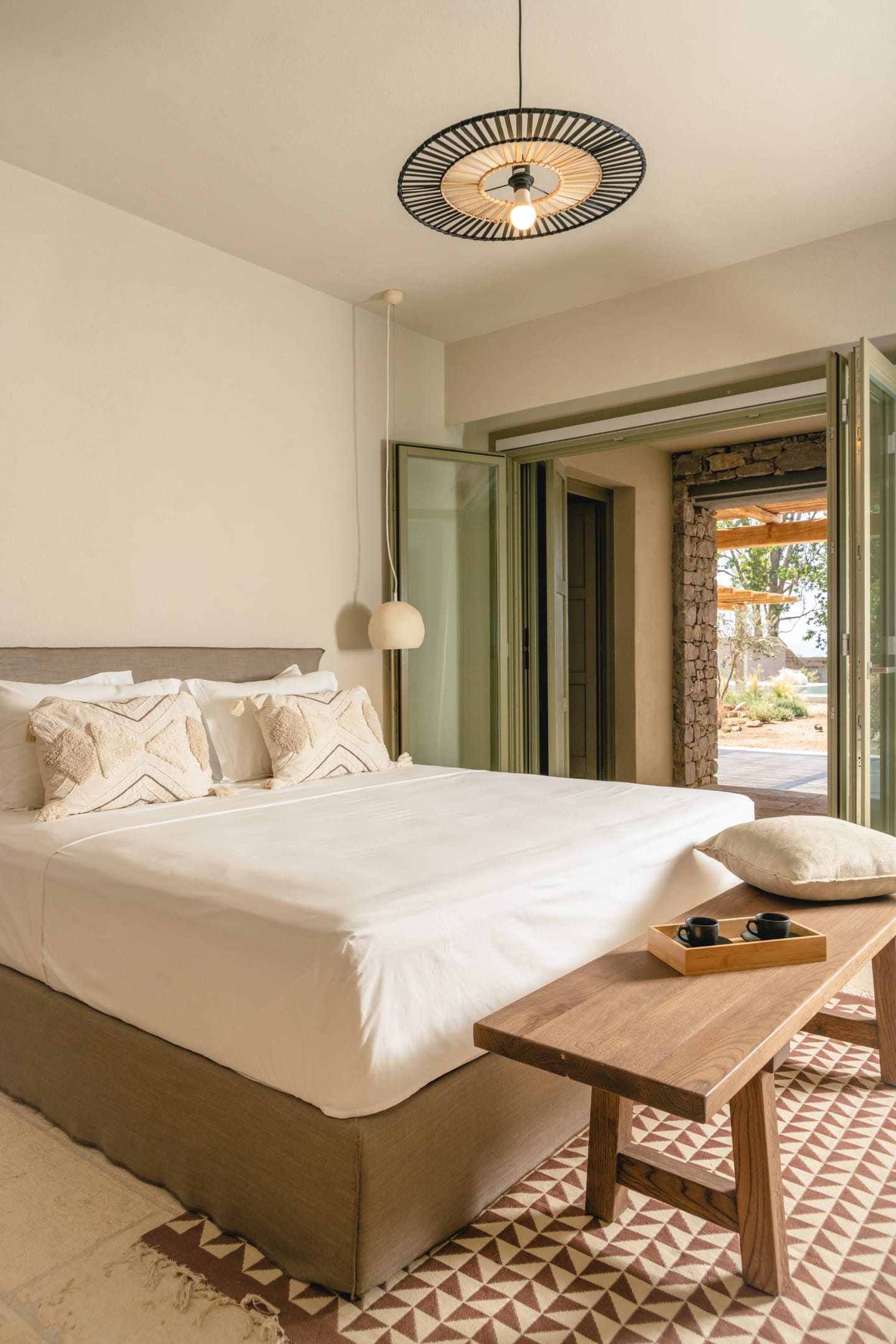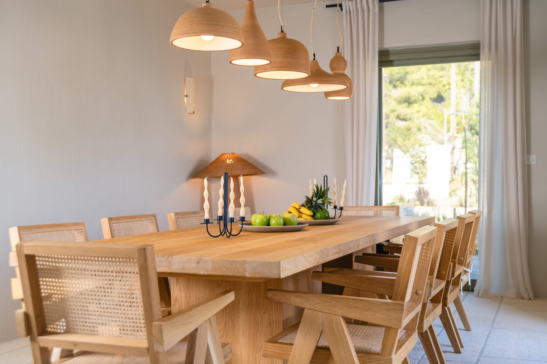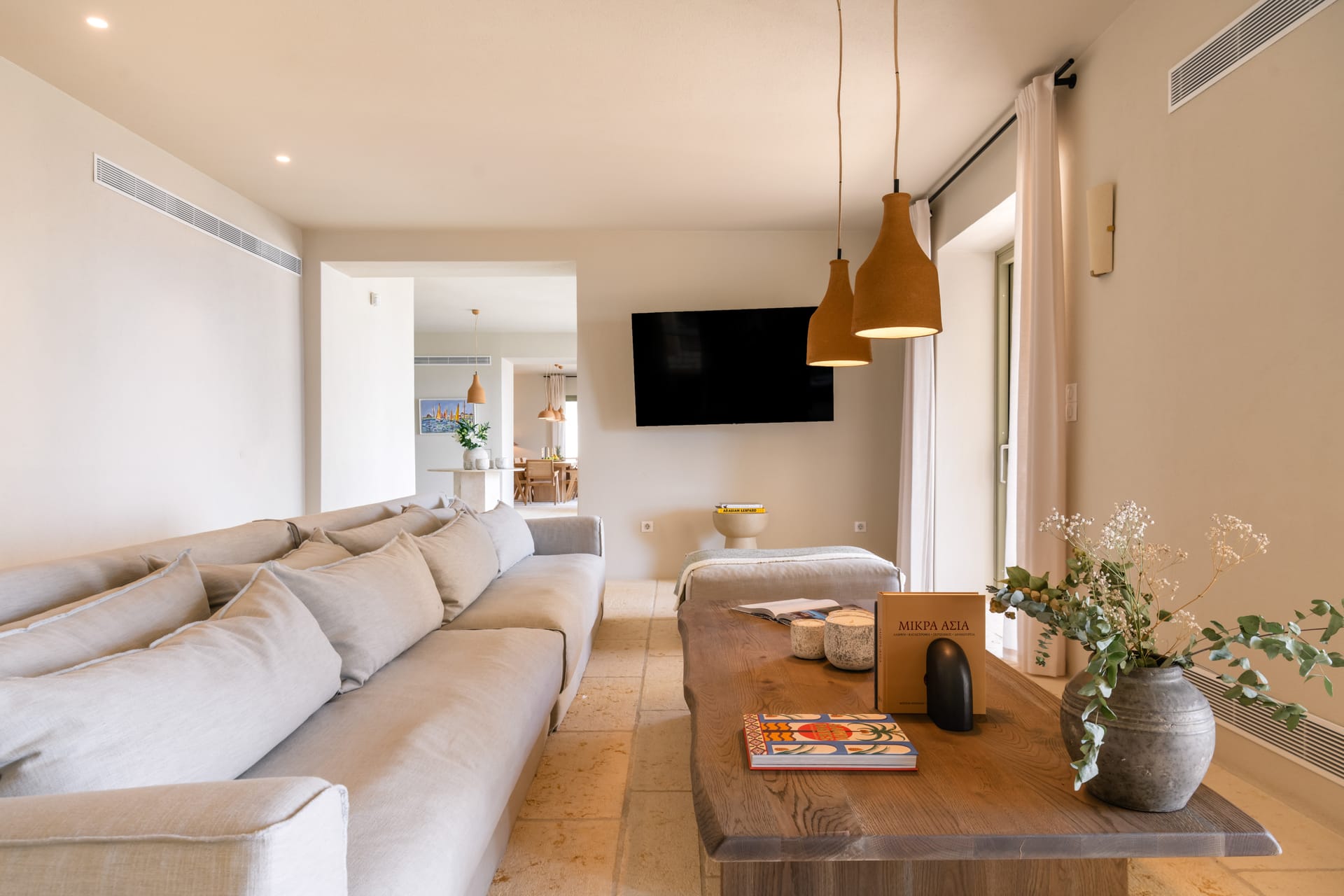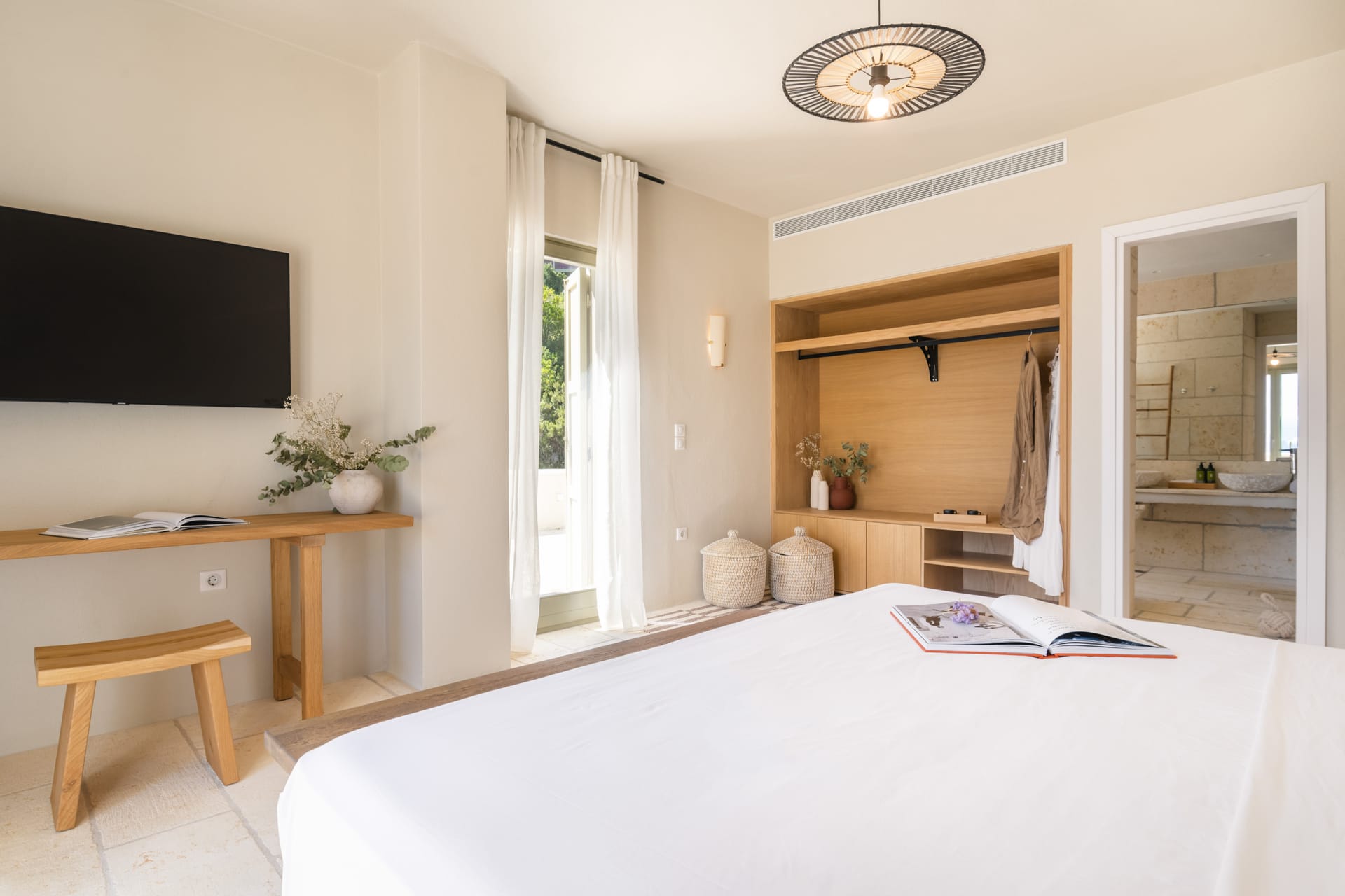 Inside, the villa features a bright and airy living room and a fully equipped kitchen, perfect for preparing meals with local ingredients. Accommodation includes six beautifully appointed bedrooms: five with queen-size beds—one of which also features a double sofa bed, making it ideal as a family room if desired—and a sixth bedroom with two single beds. With eight full bathrooms plus an additional WC, every guest enjoys privacy and convenience. For those who like to stay active, a dedicated gym space with its own bathroom is at your disposal.