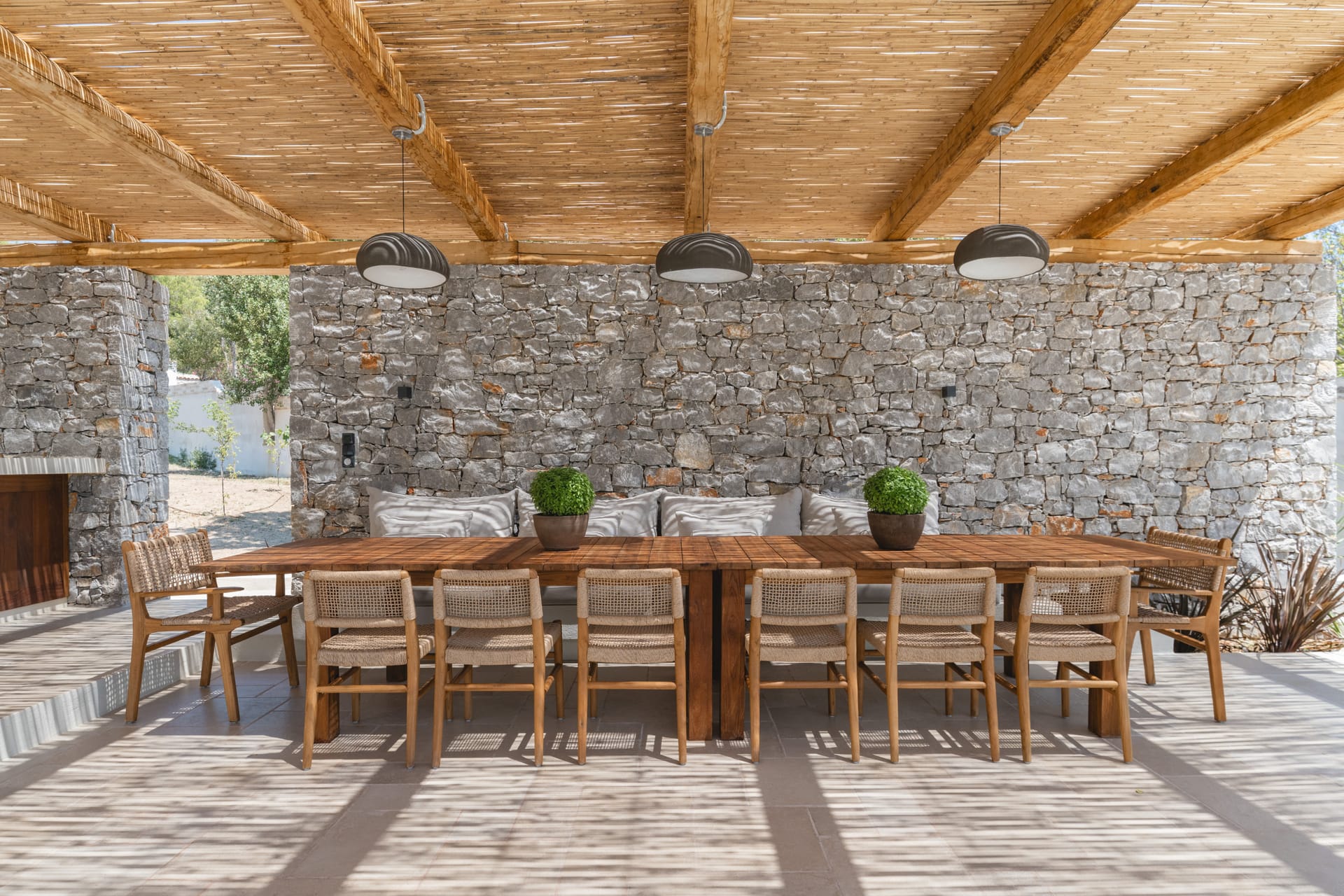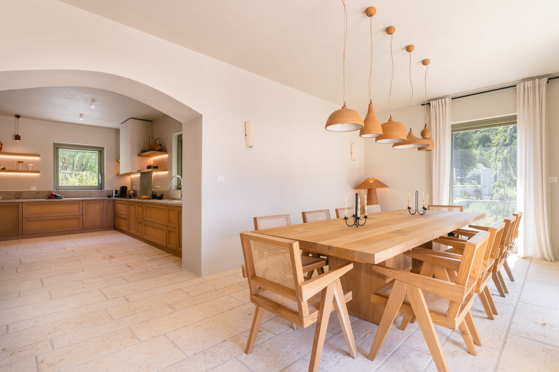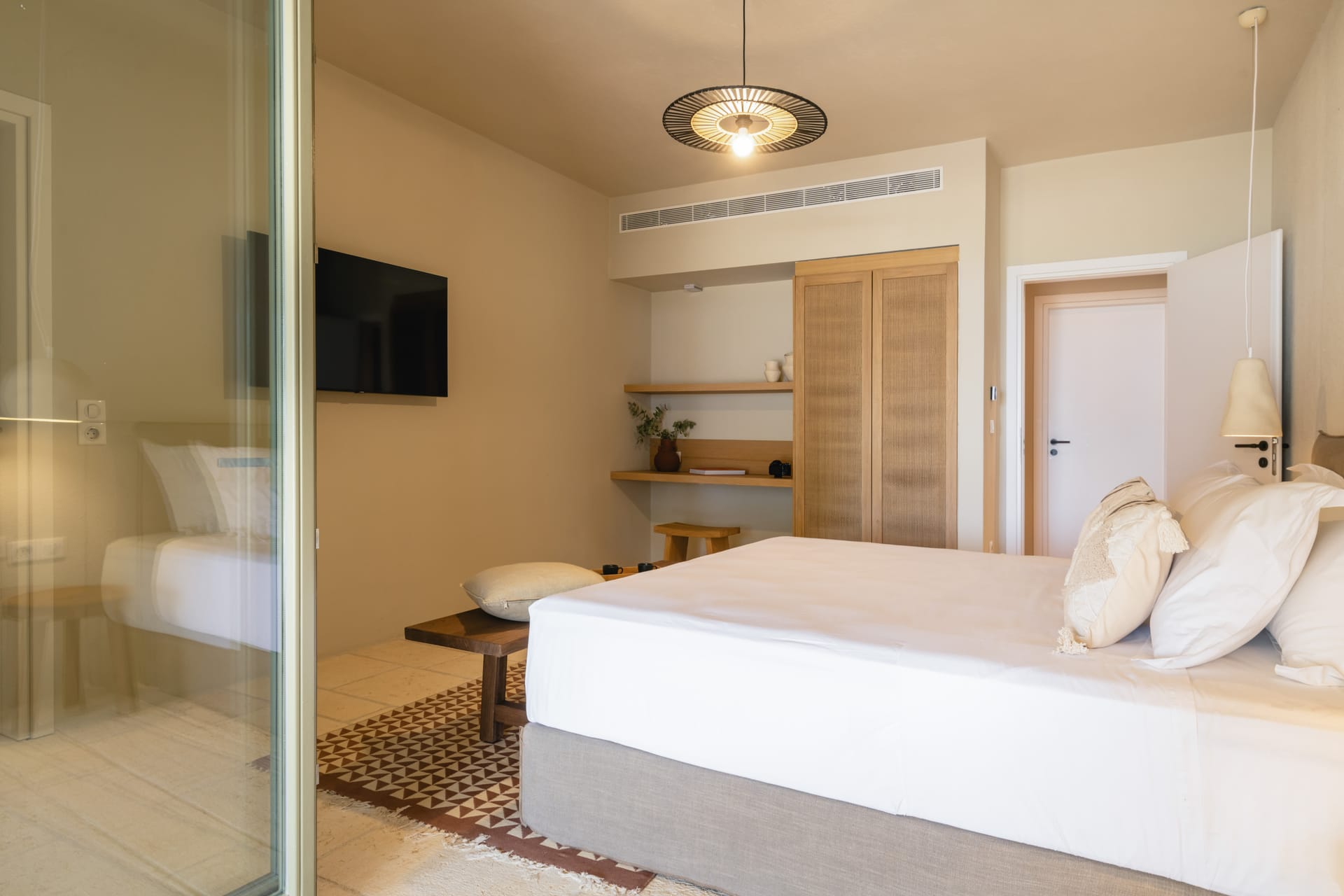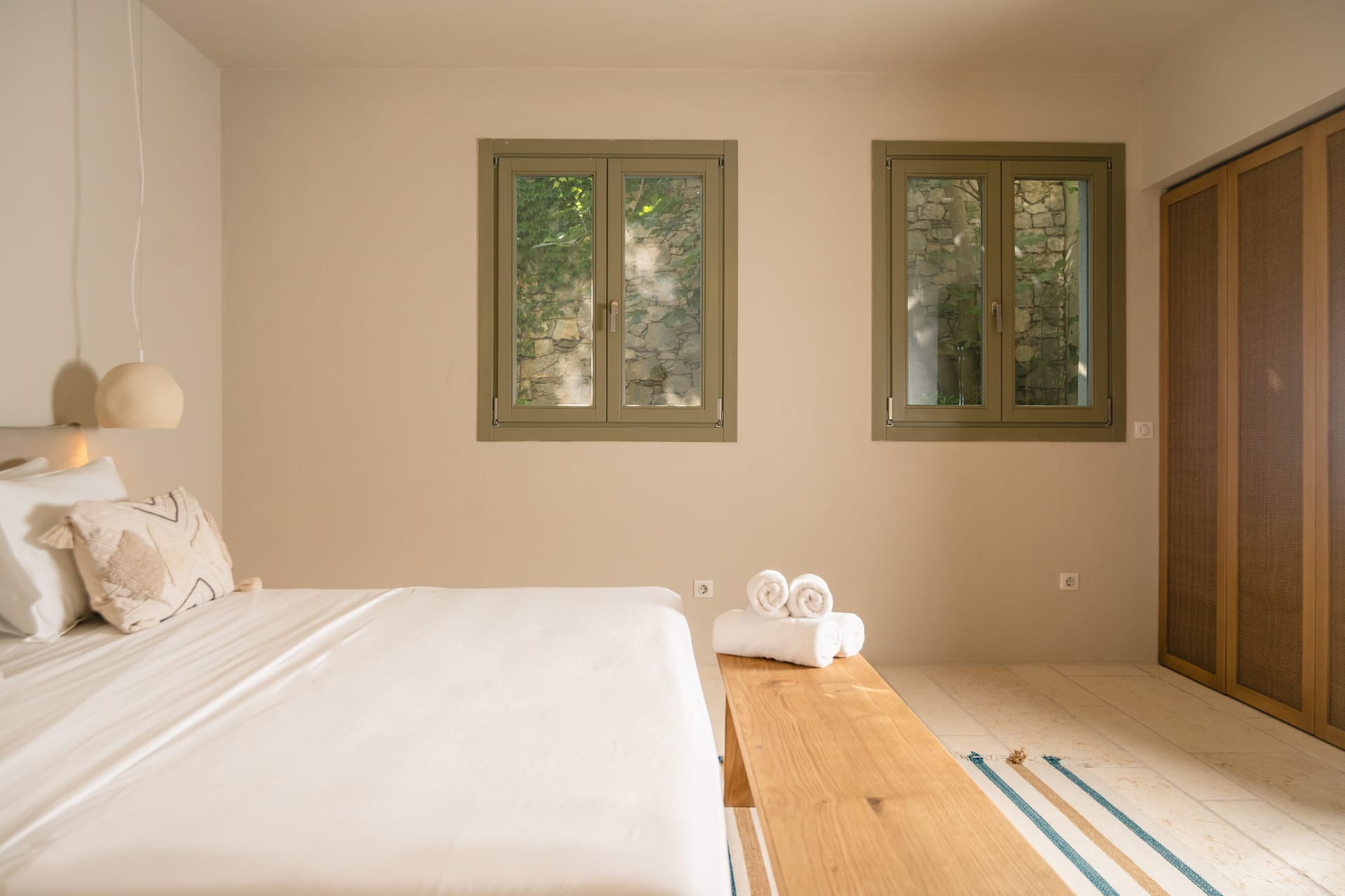 Inside, the villa features a bright and airy living room and a fully equipped kitchen, perfect for preparing meals with local ingredients. Accommodation includes six beautifully appointed bedrooms: five with queen-size beds—one of which also features a double sofa bed, making it ideal as a family room if desired—and a sixth bedroom with two single beds. With eight full bathrooms plus an additional WC, every guest enjoys privacy and convenience. For those who like to stay active, a dedicated gym space with its own bathroom is at your disposal.