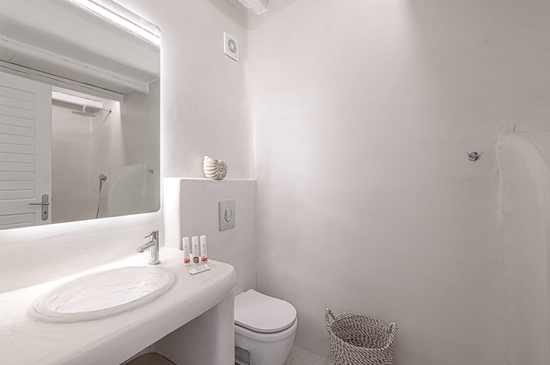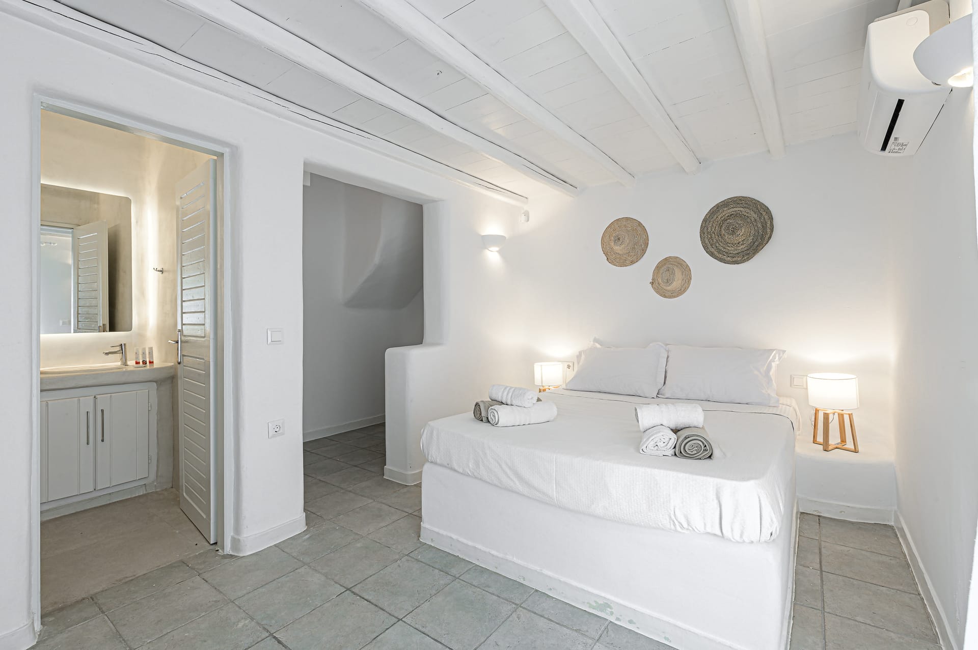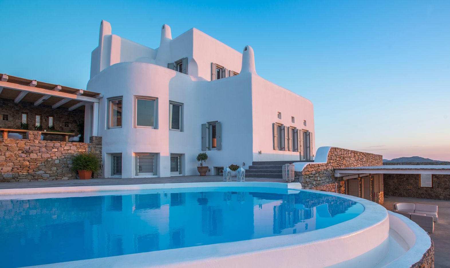 🏛️ White plaster, local stone, built-in couches, and wooden pergolas intertwined with Cycladic arches