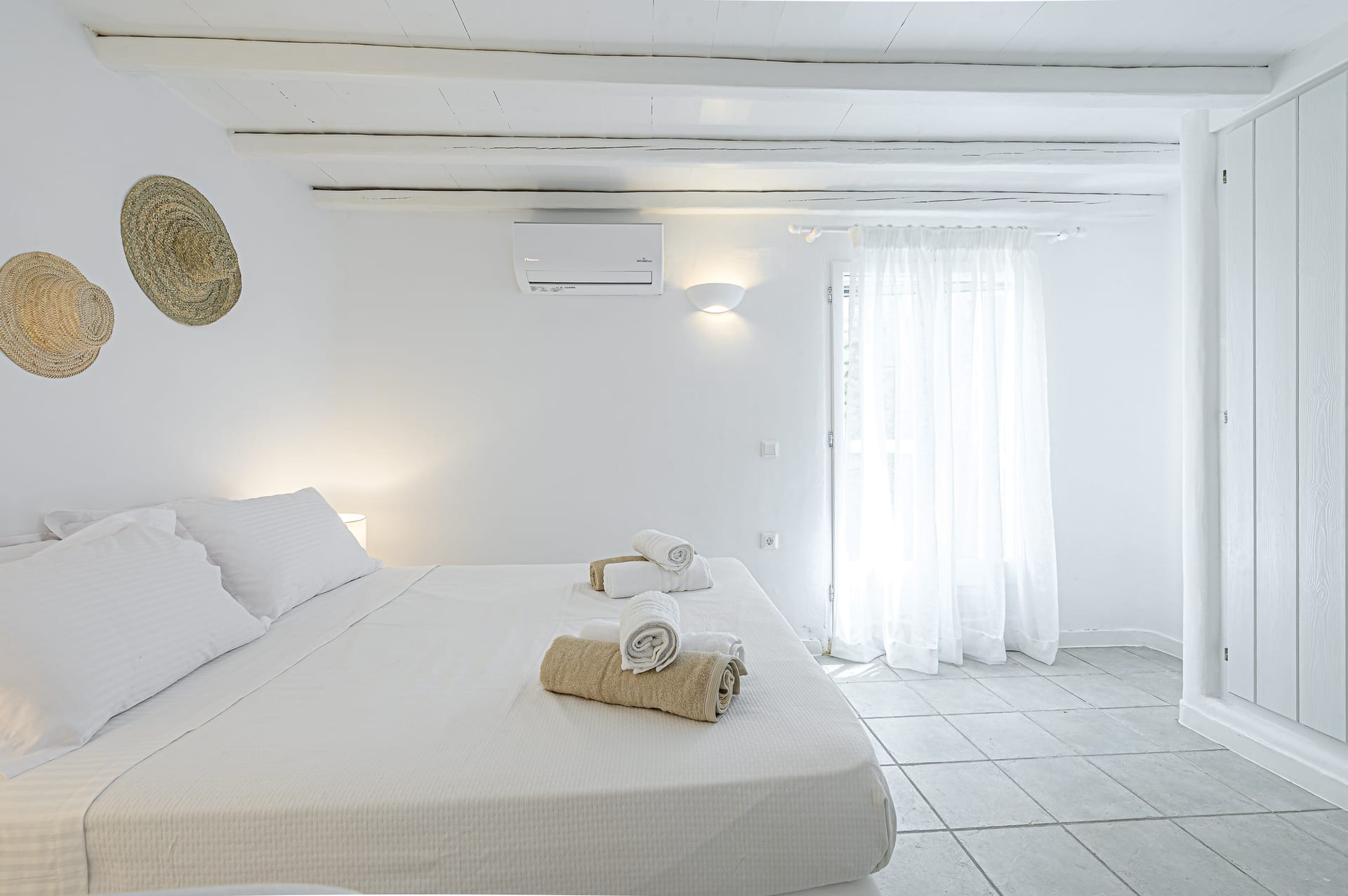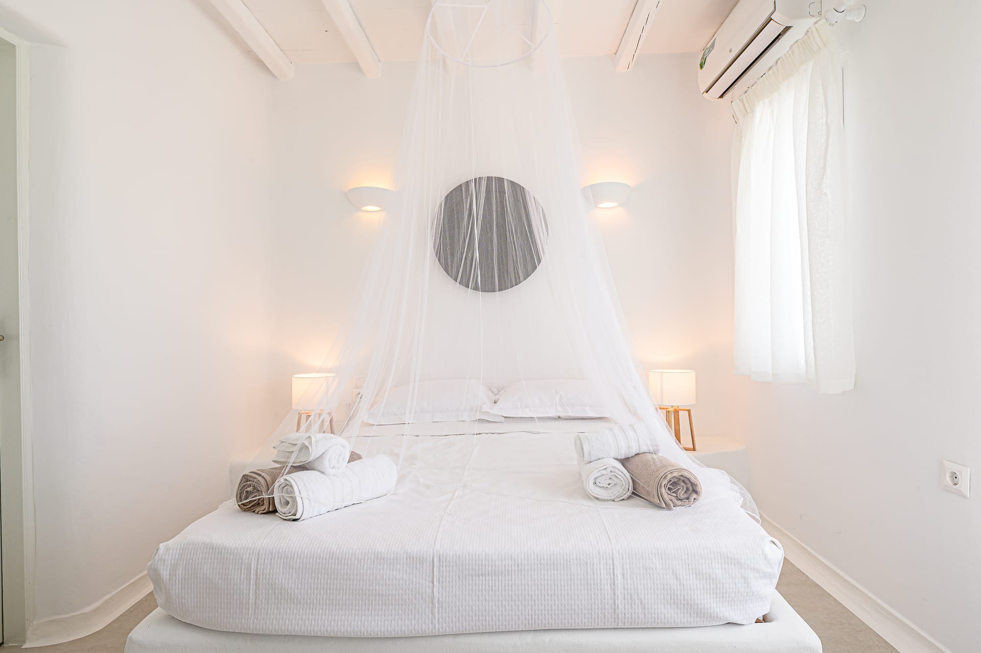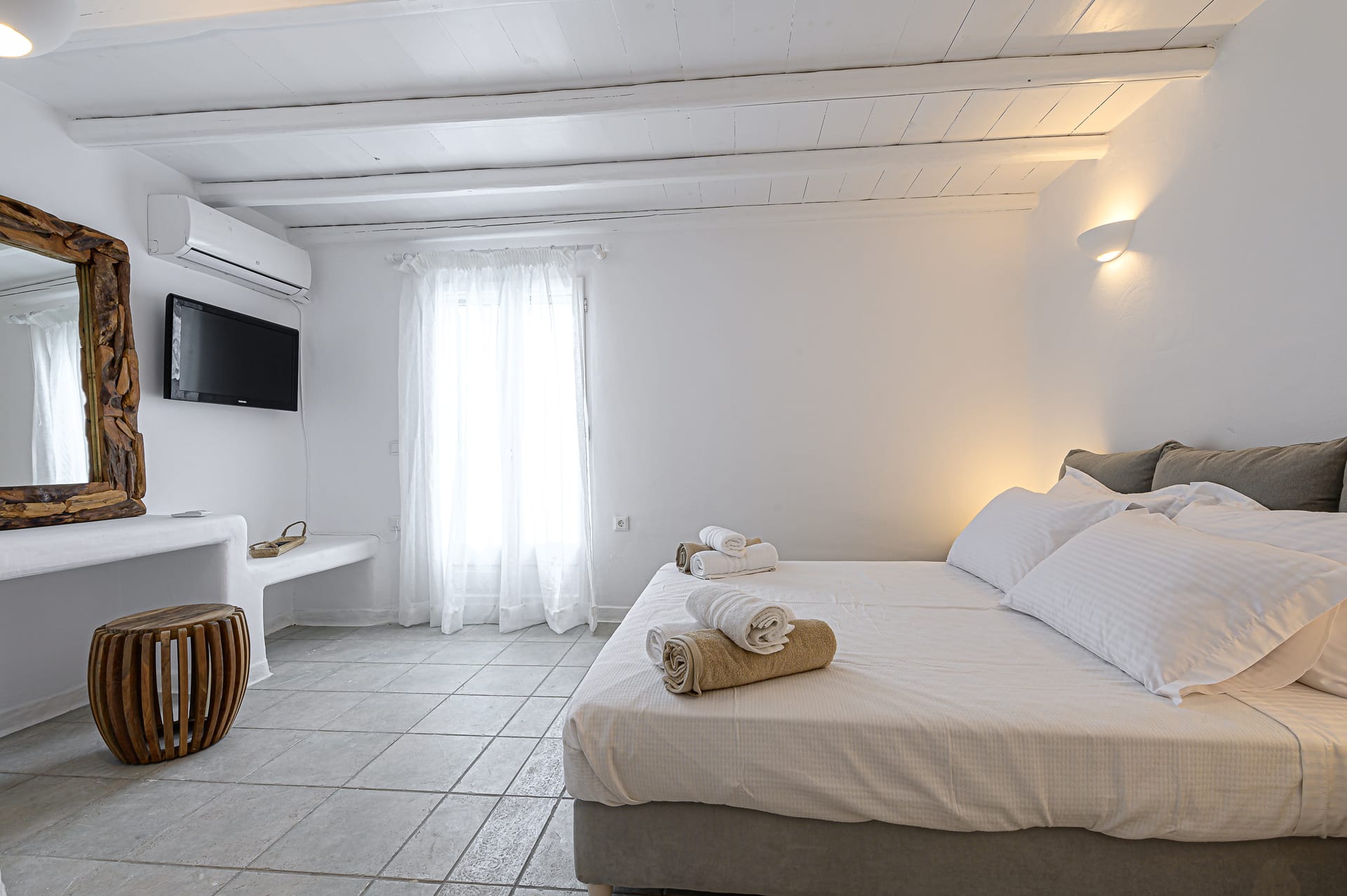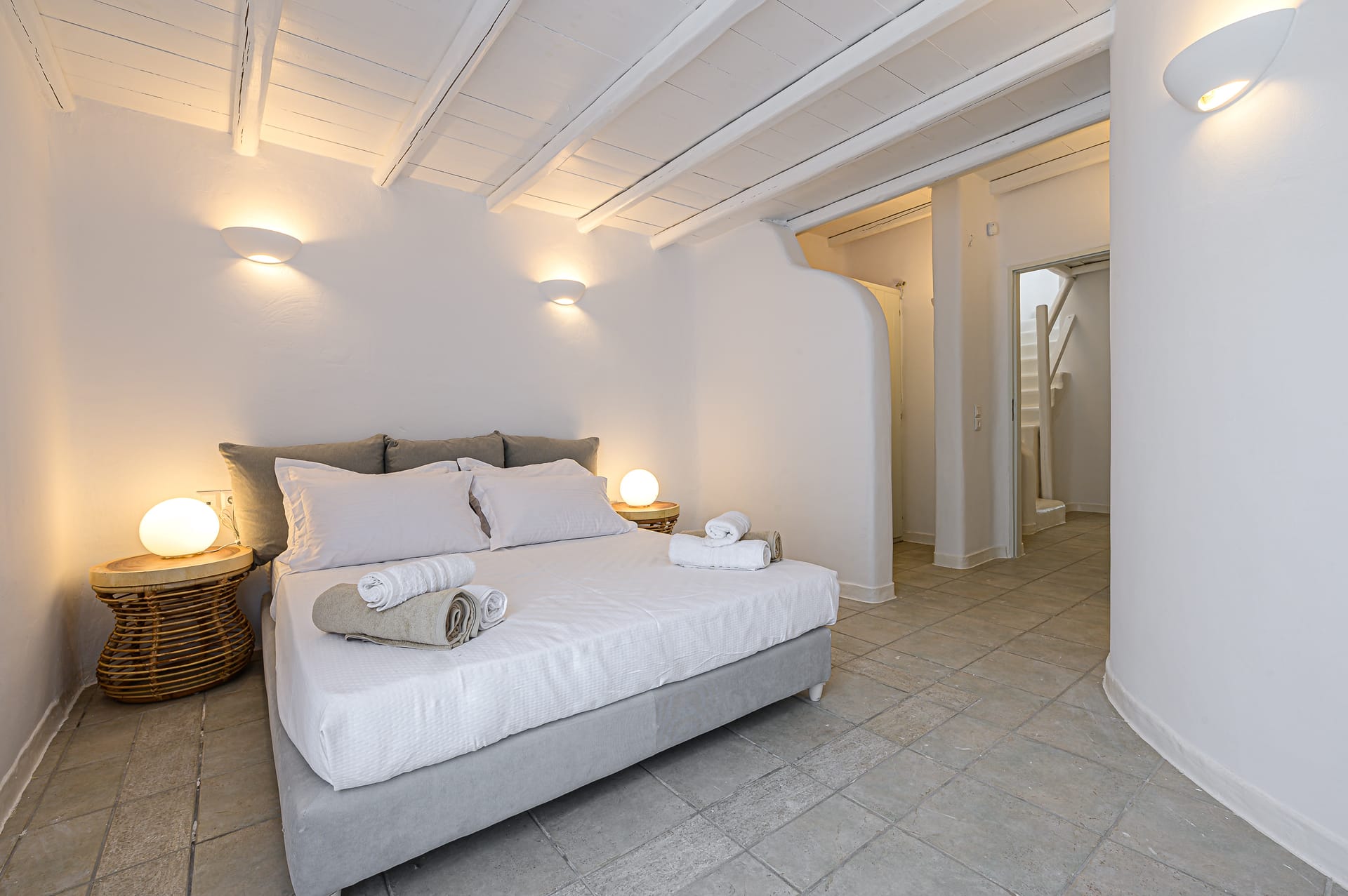 Renovated in 2020, the villa blends traditional Mykonian design—whitewashed walls, marble floors, wooden beams, and built-in furnishings—with modern comforts. Its idyllic setting is enhanced by a 10 sq.m. private pool, lush gardens, and expansive outdoor spaces designed for relaxation and recreation.