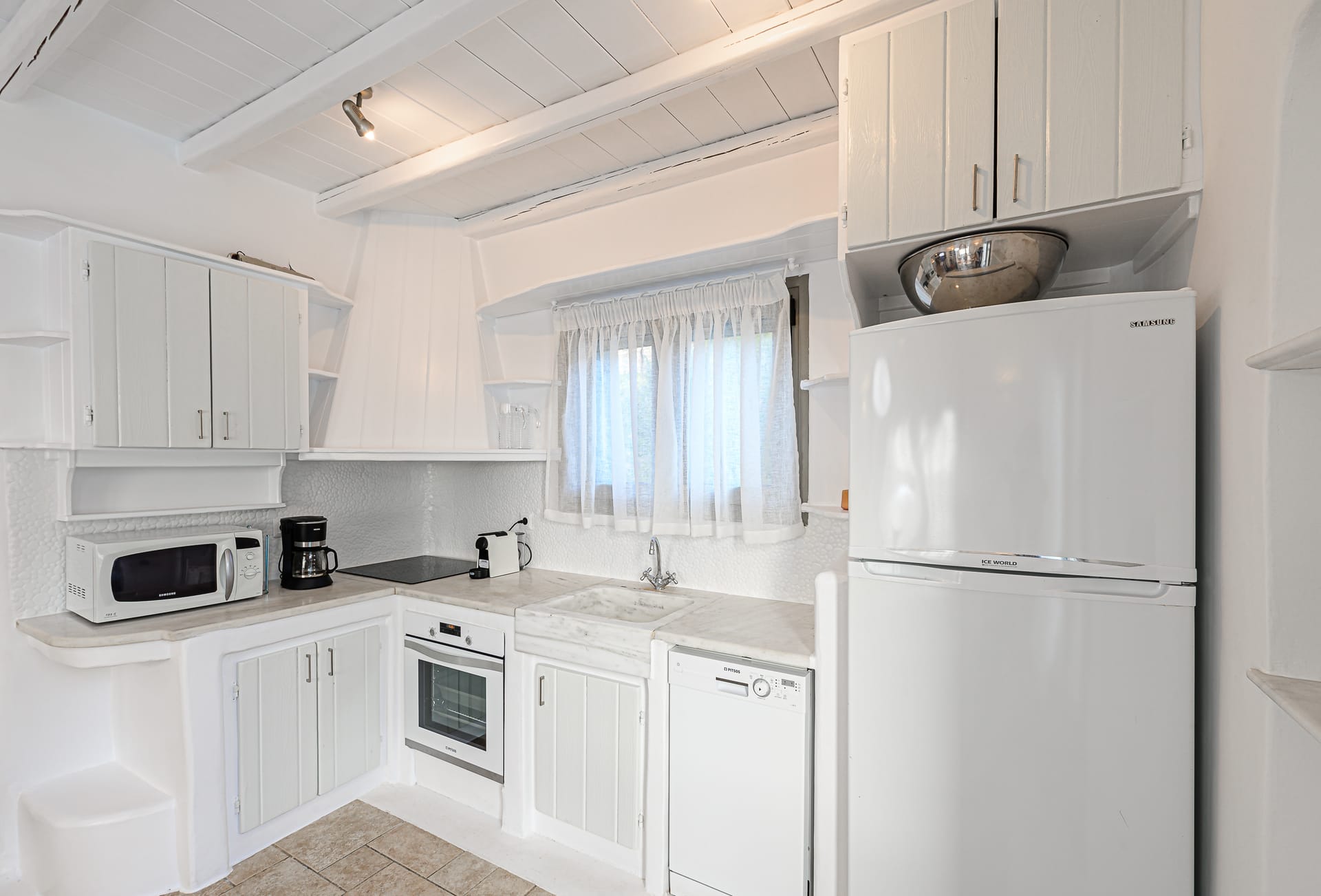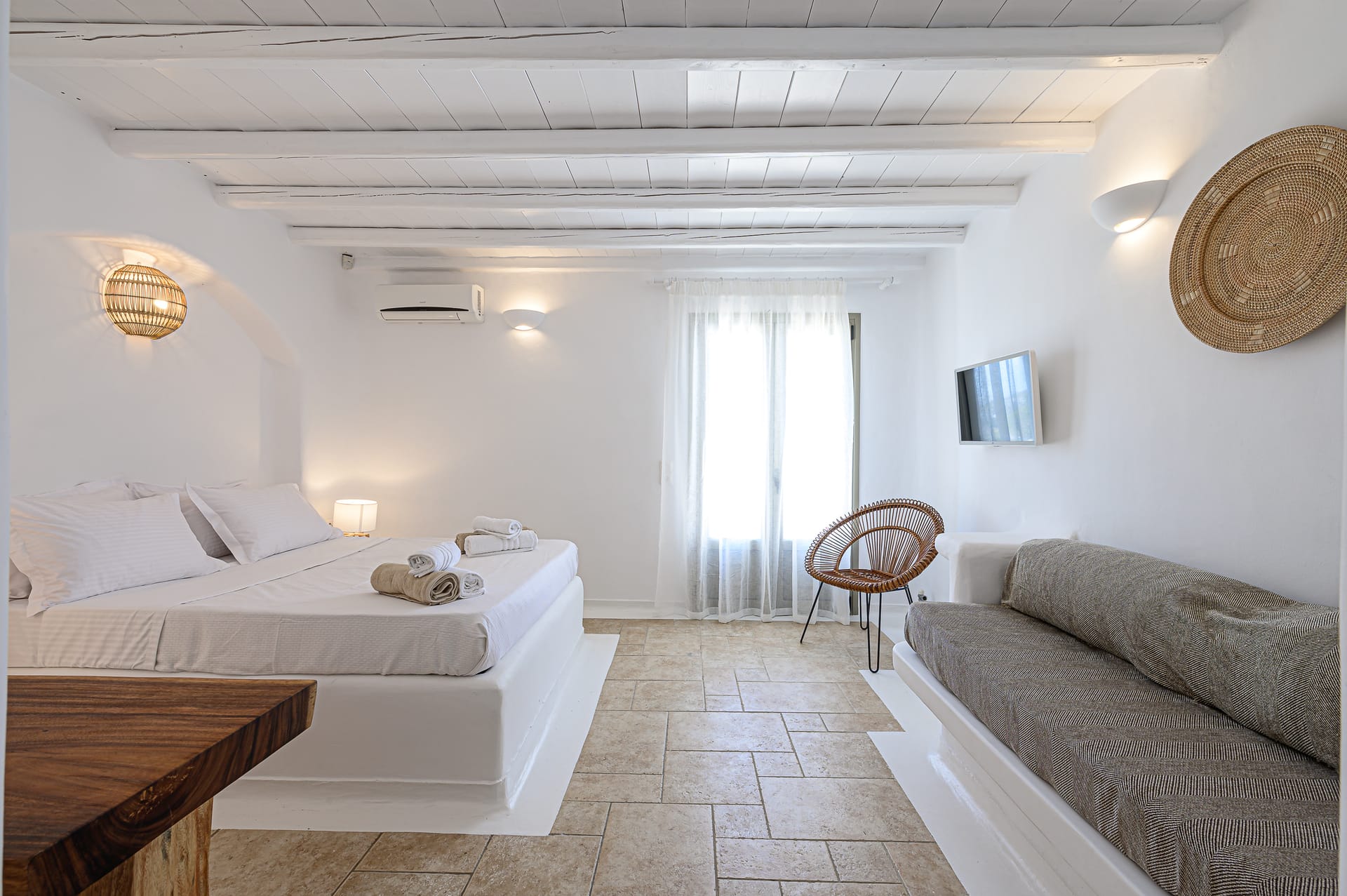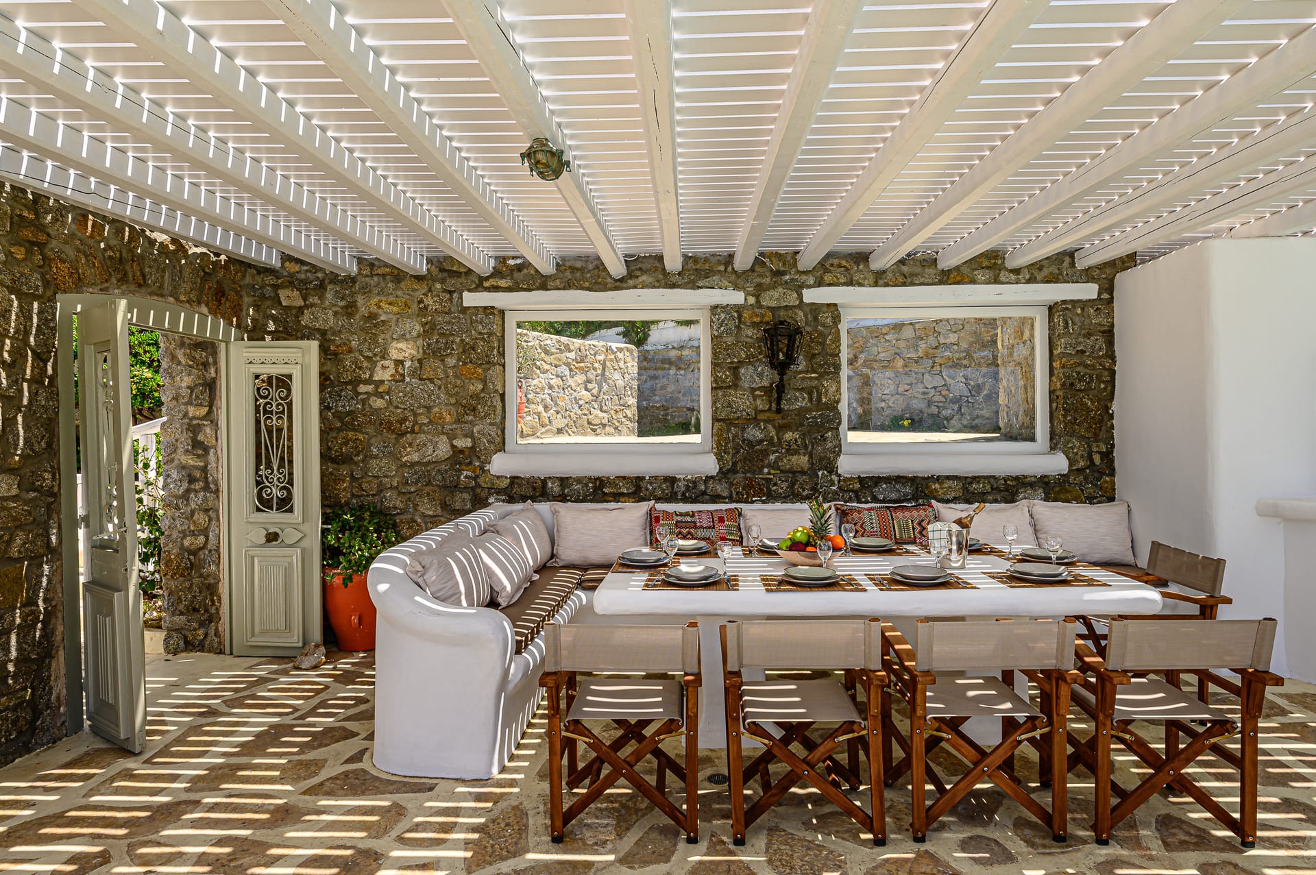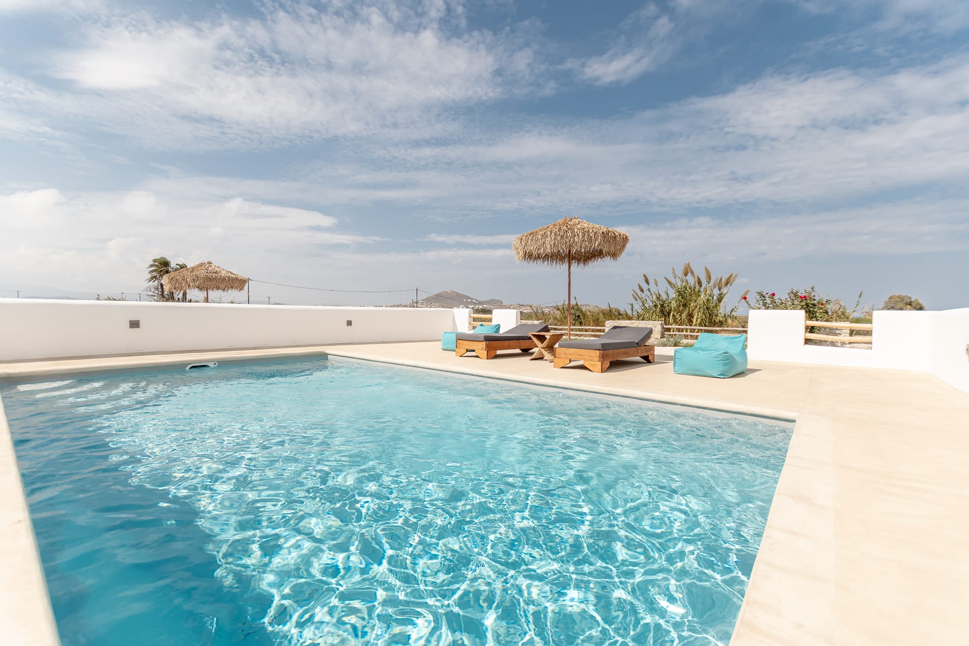 Renovated in 2020, the property combines whitewashed architecture, marble floors and built-in furnishings with contemporary amenities. The outdoor areas are centered around a 50 sq.m private infinity pool, landscaped gardens and multiple lounge spaces overlooking the sea.
