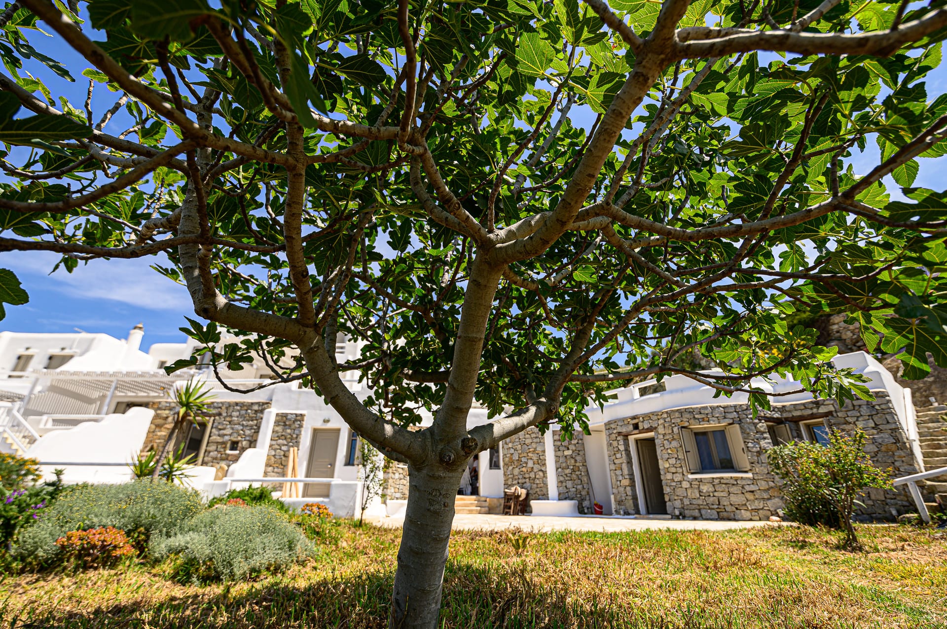 - Mediterranean landscaping with olive trees, cacti and local flora