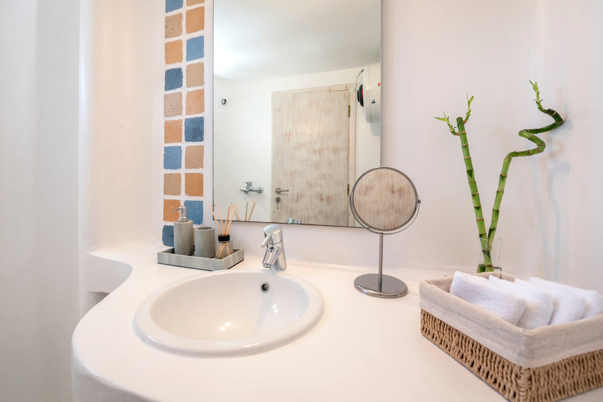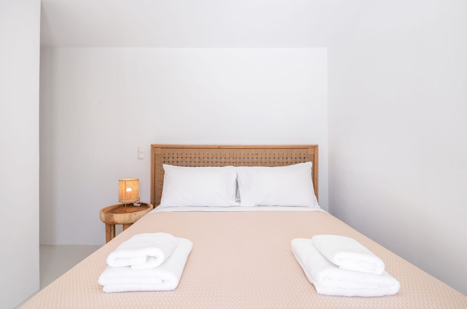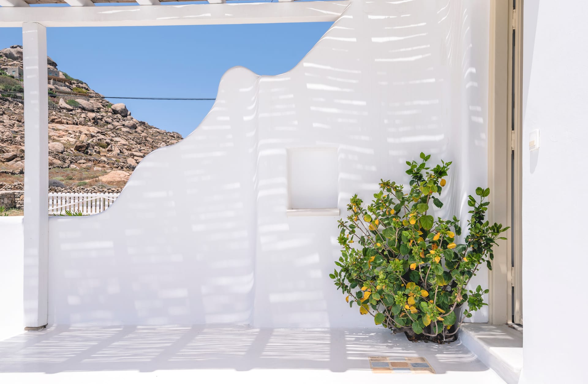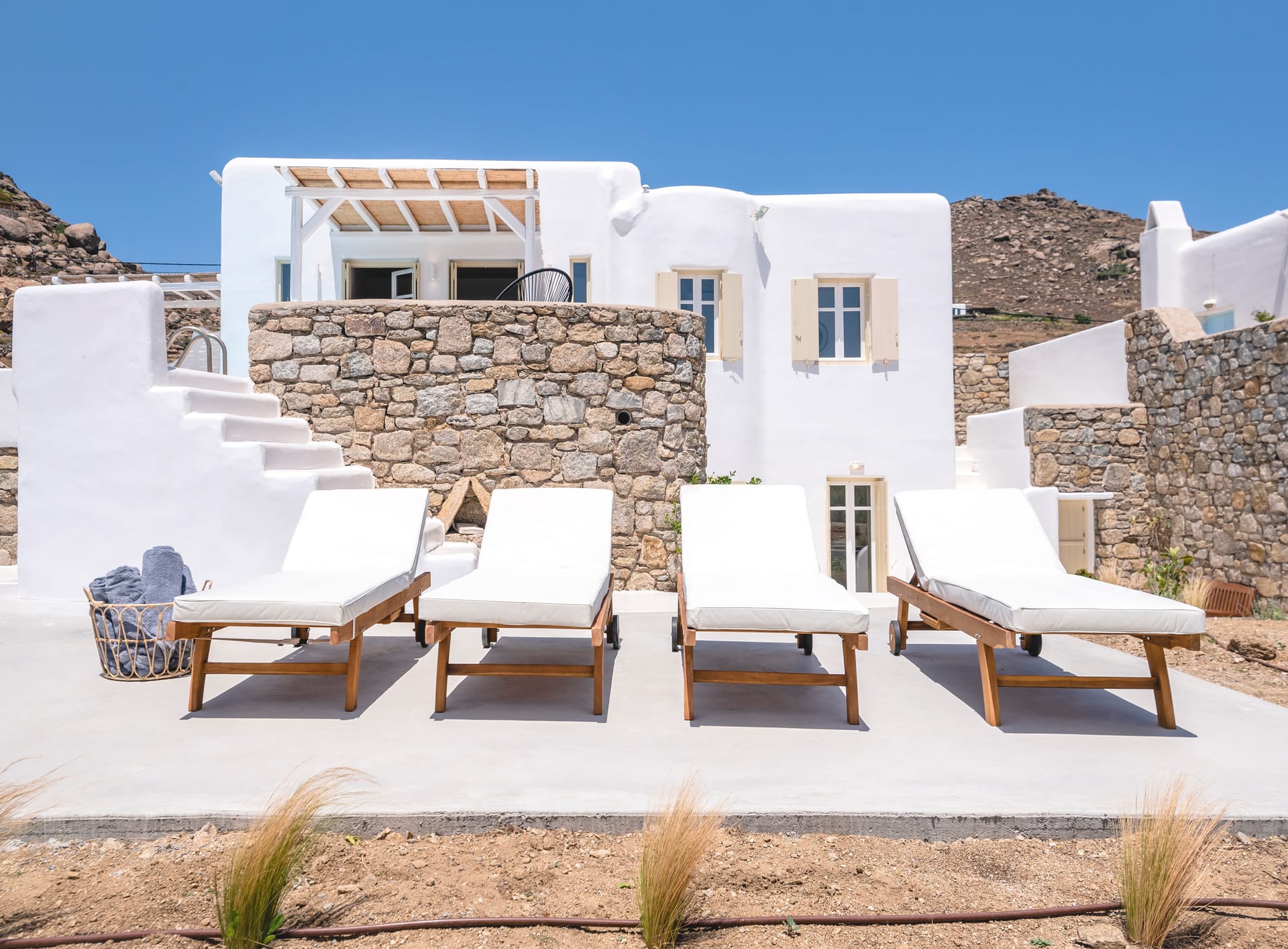 Our Villa is a 107sqm modern Mykonian house with private pool, incorporating 3 master-bedrooms with en-suite bathrooms, kitchen-living room and a large patio and bohemian style garden.