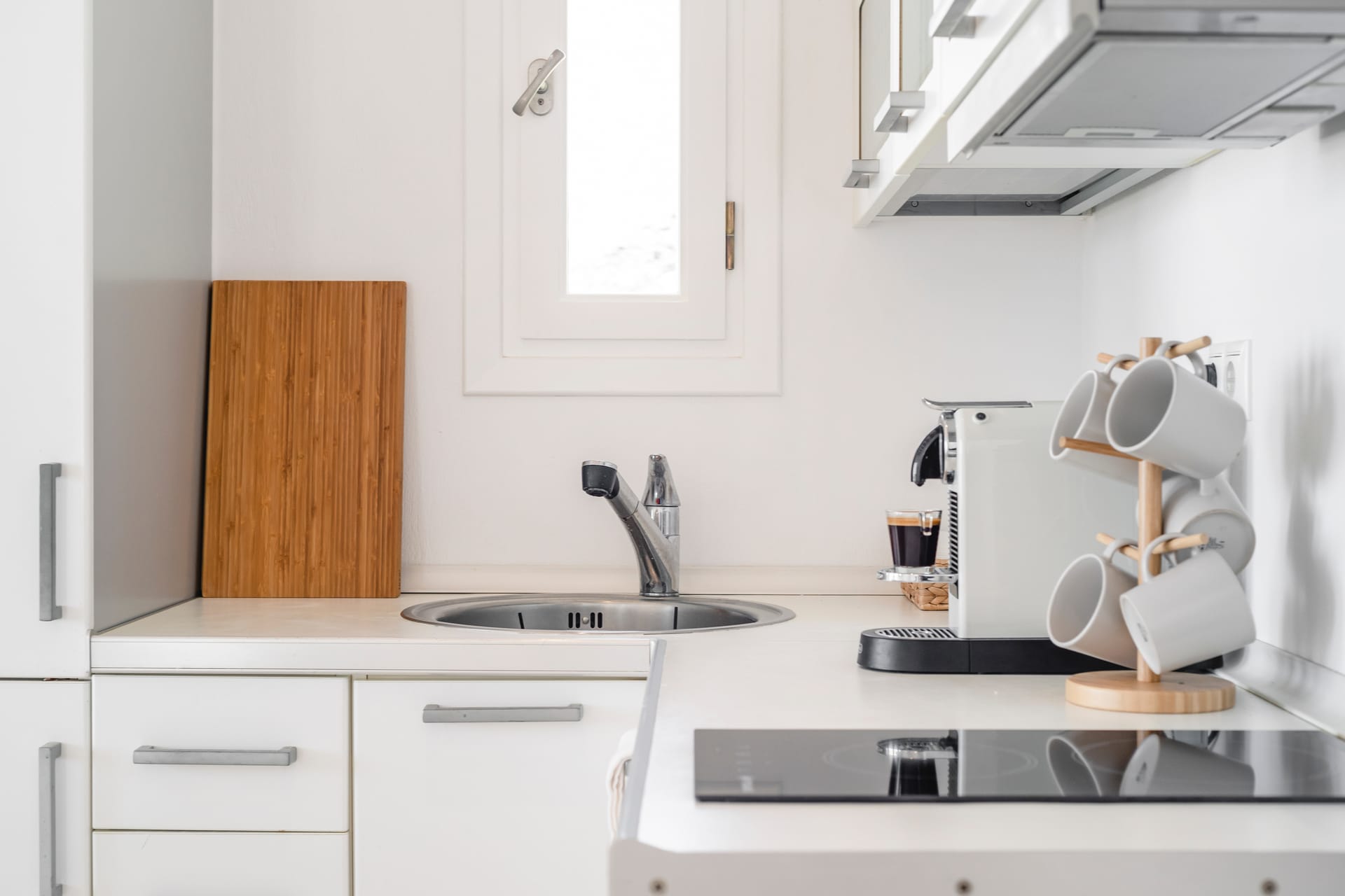 ➡️ Spacious living room with fully equipped open-plan kitchen and direct access to the private pool.