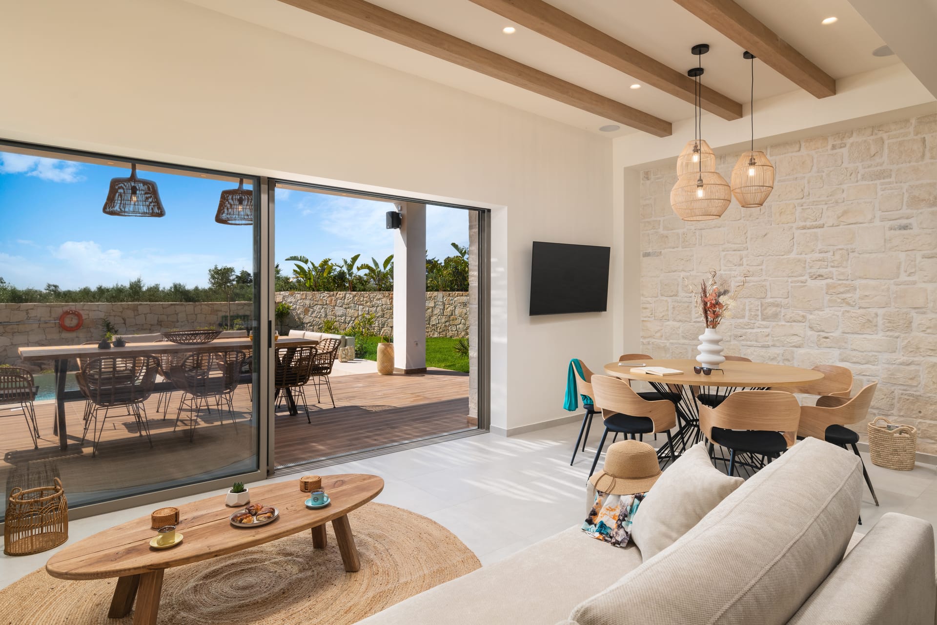 • Spacious living area with comfortable sofa and large windows that open to the outdoor swimming pool area