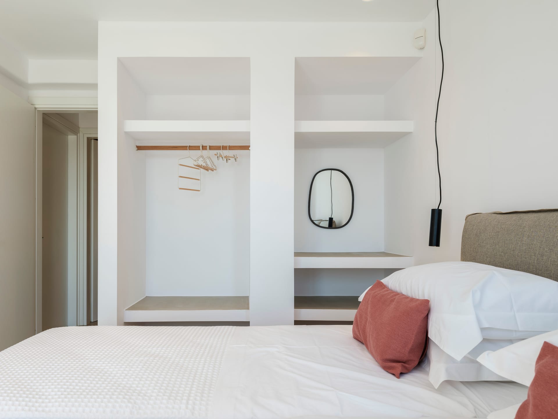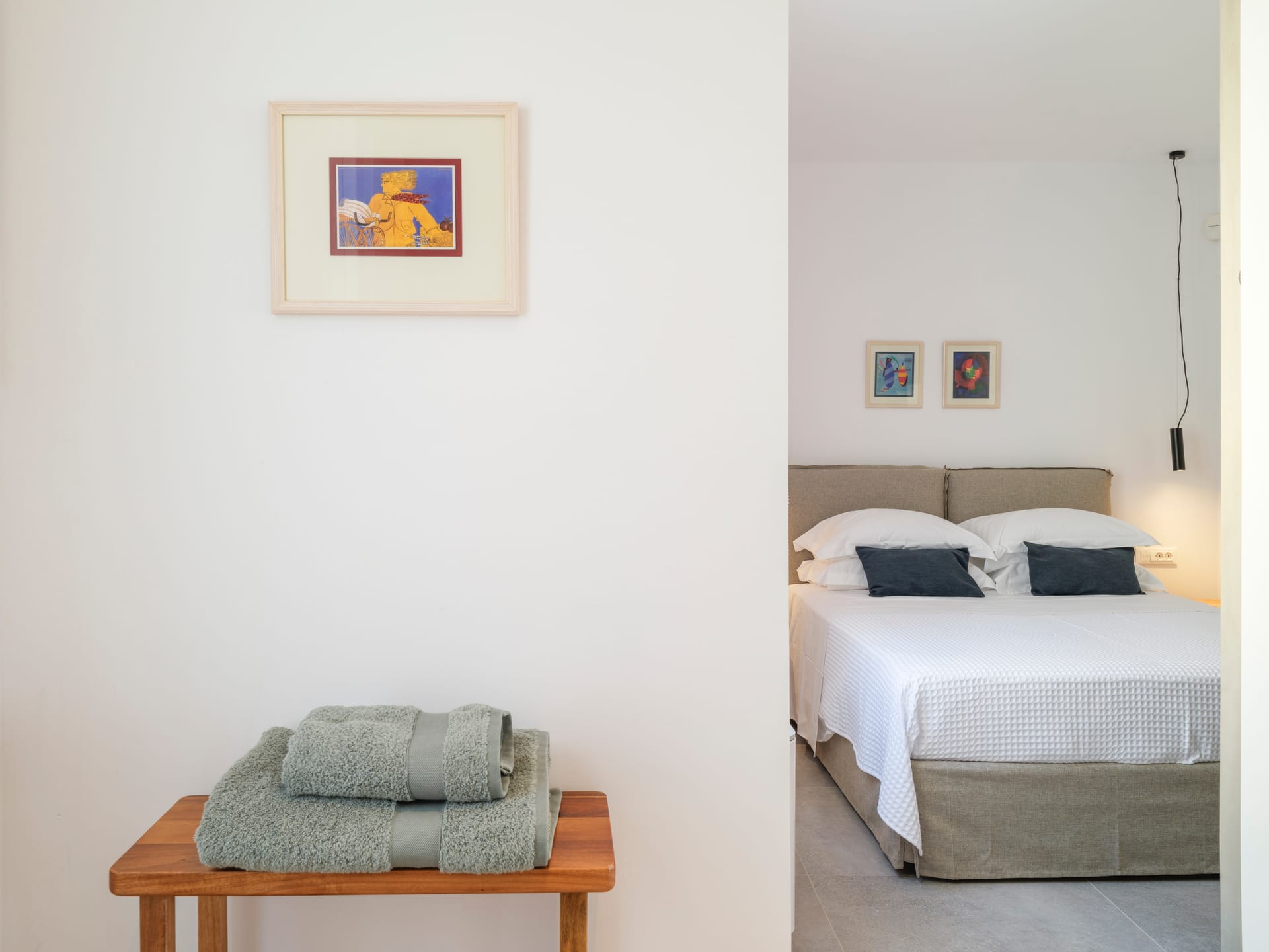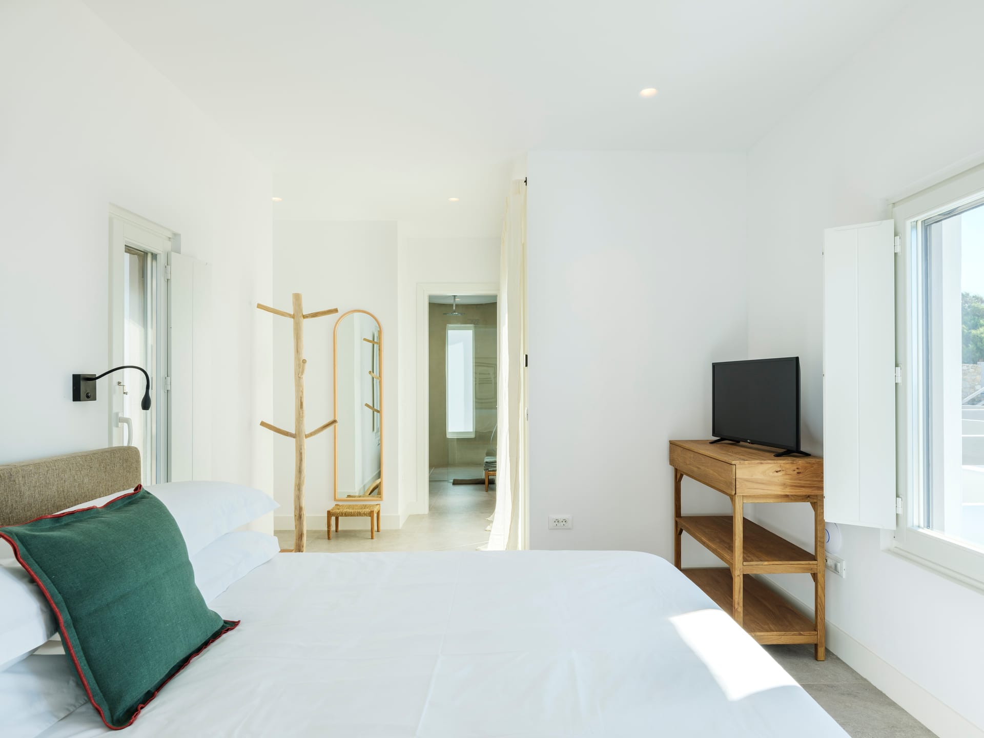 • 1 Double bedroom with queen sized bed, ensuite bathroom (direct access to pool and sea view).