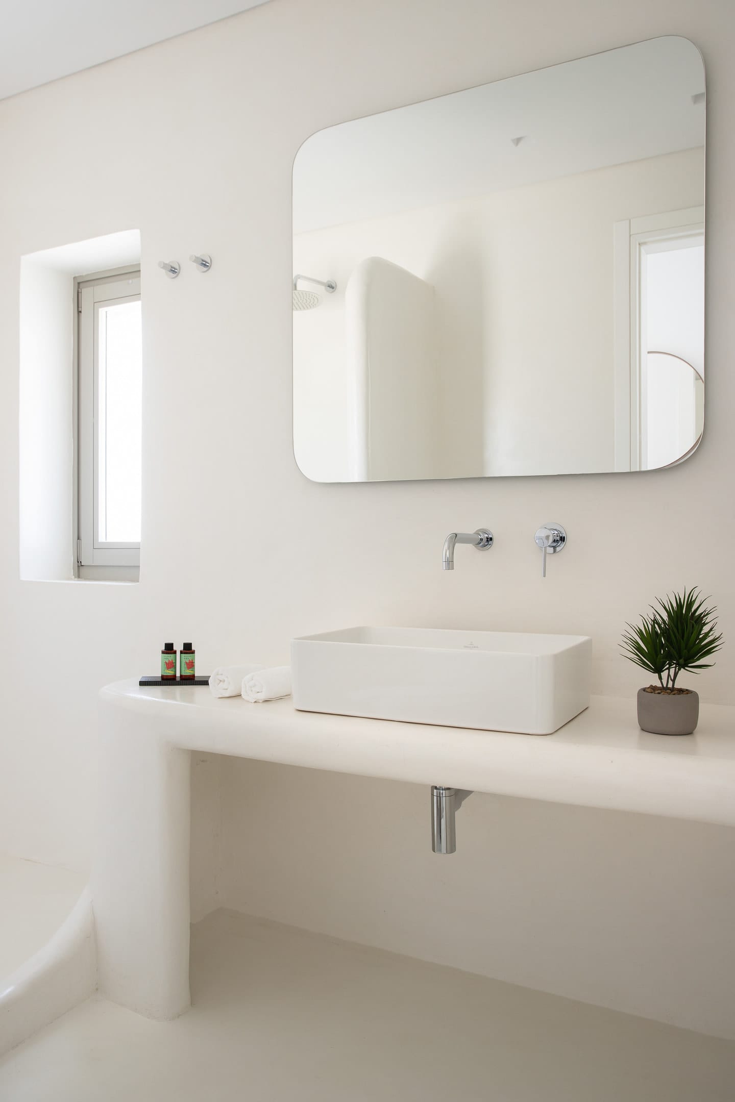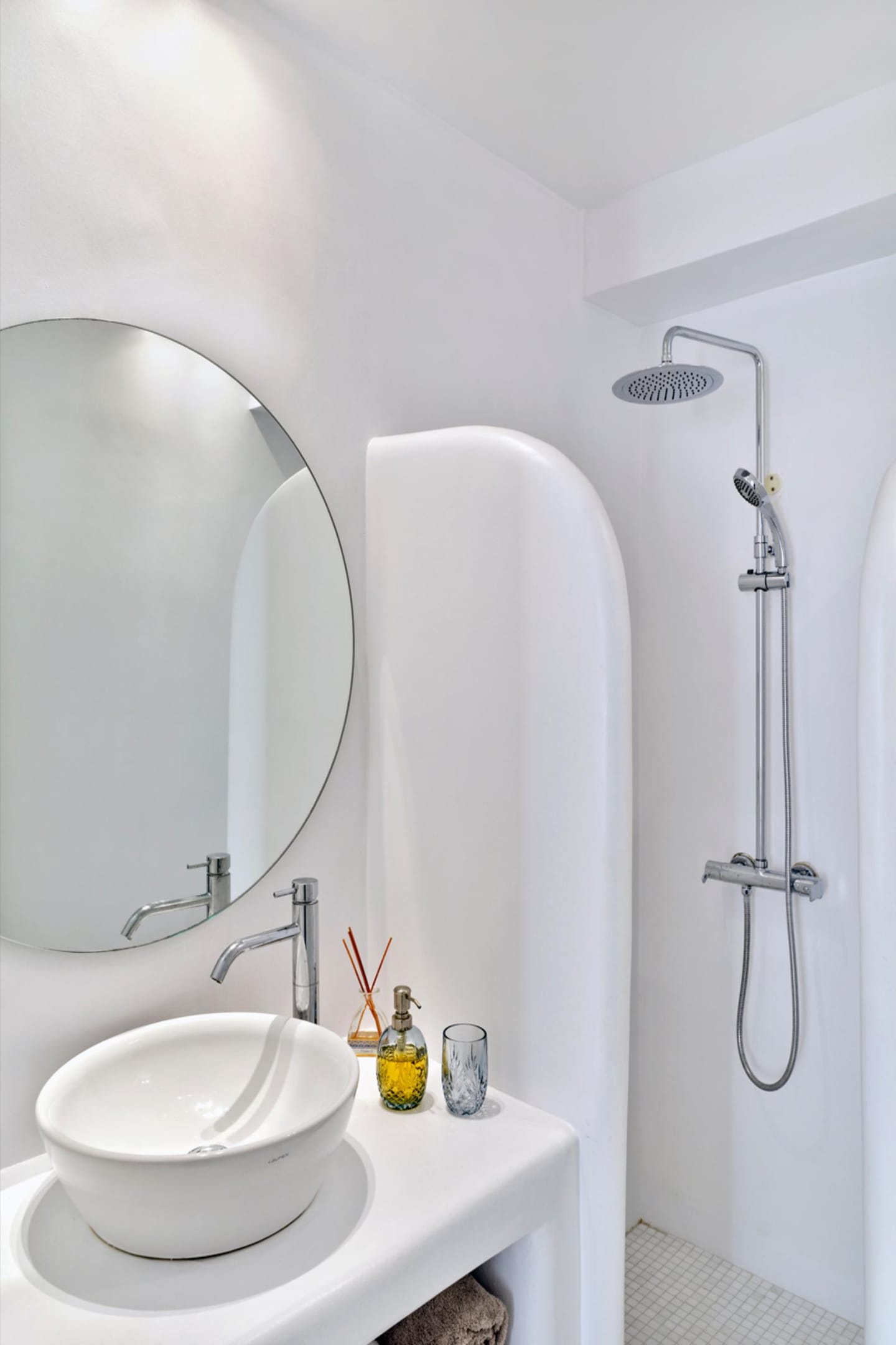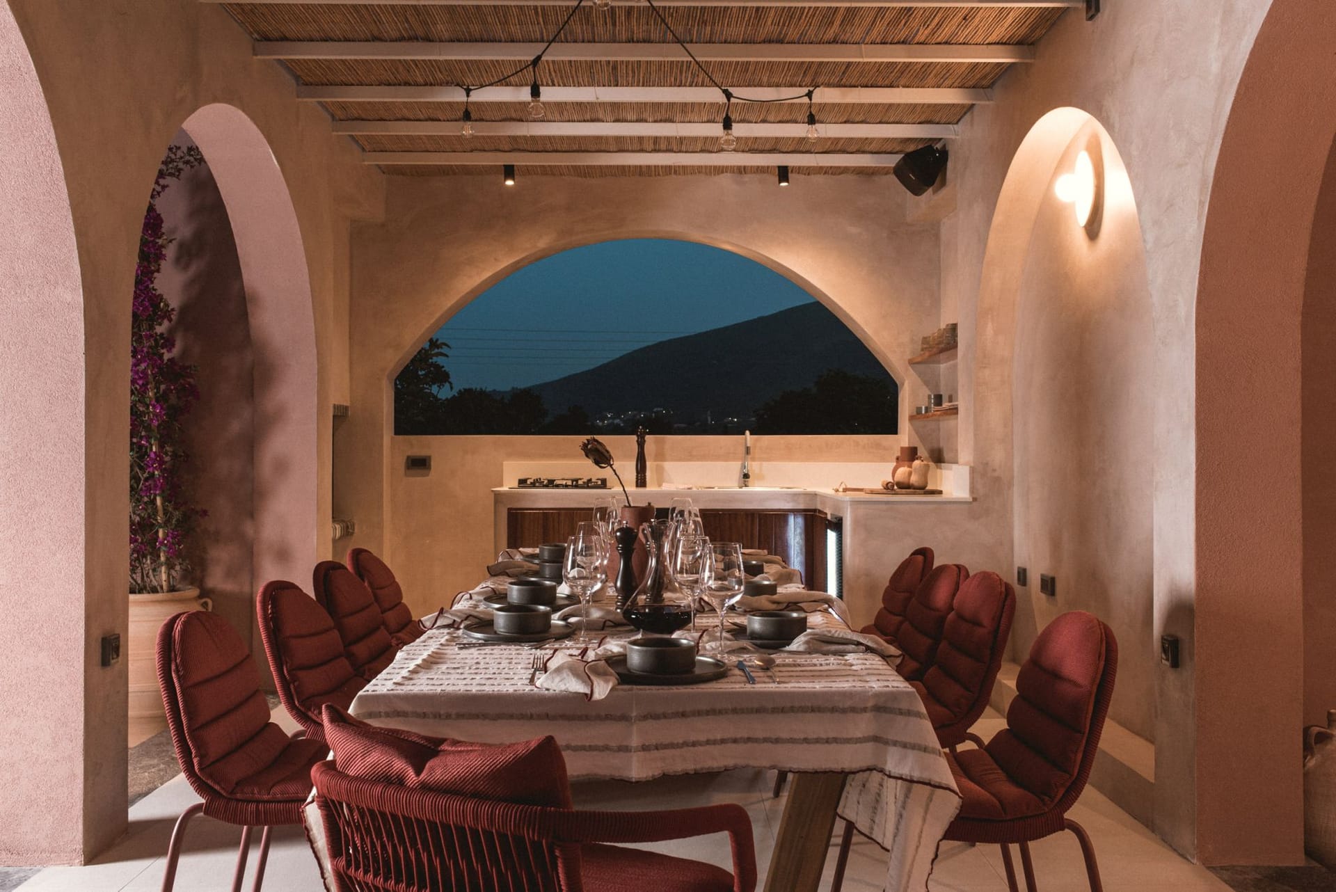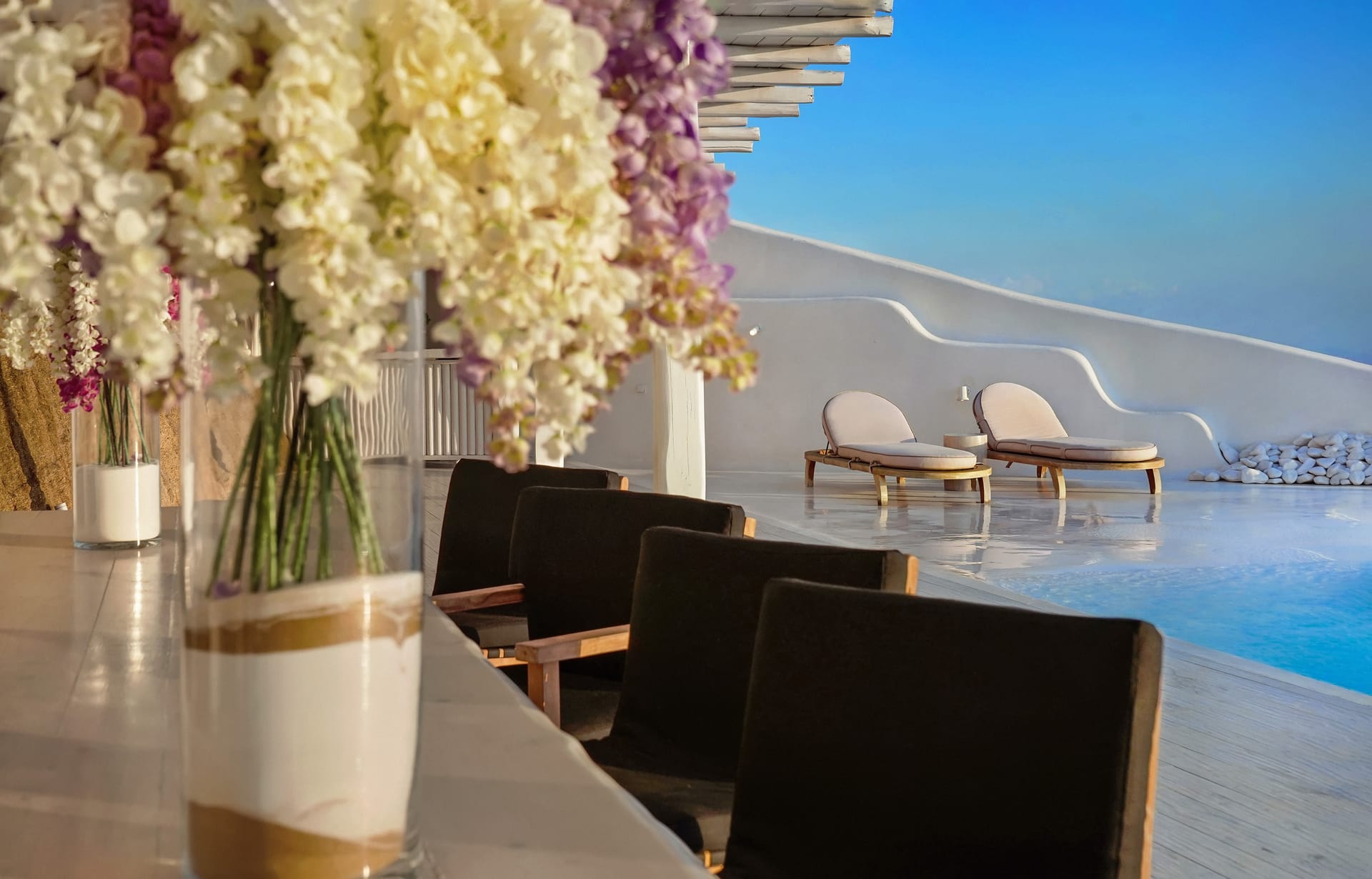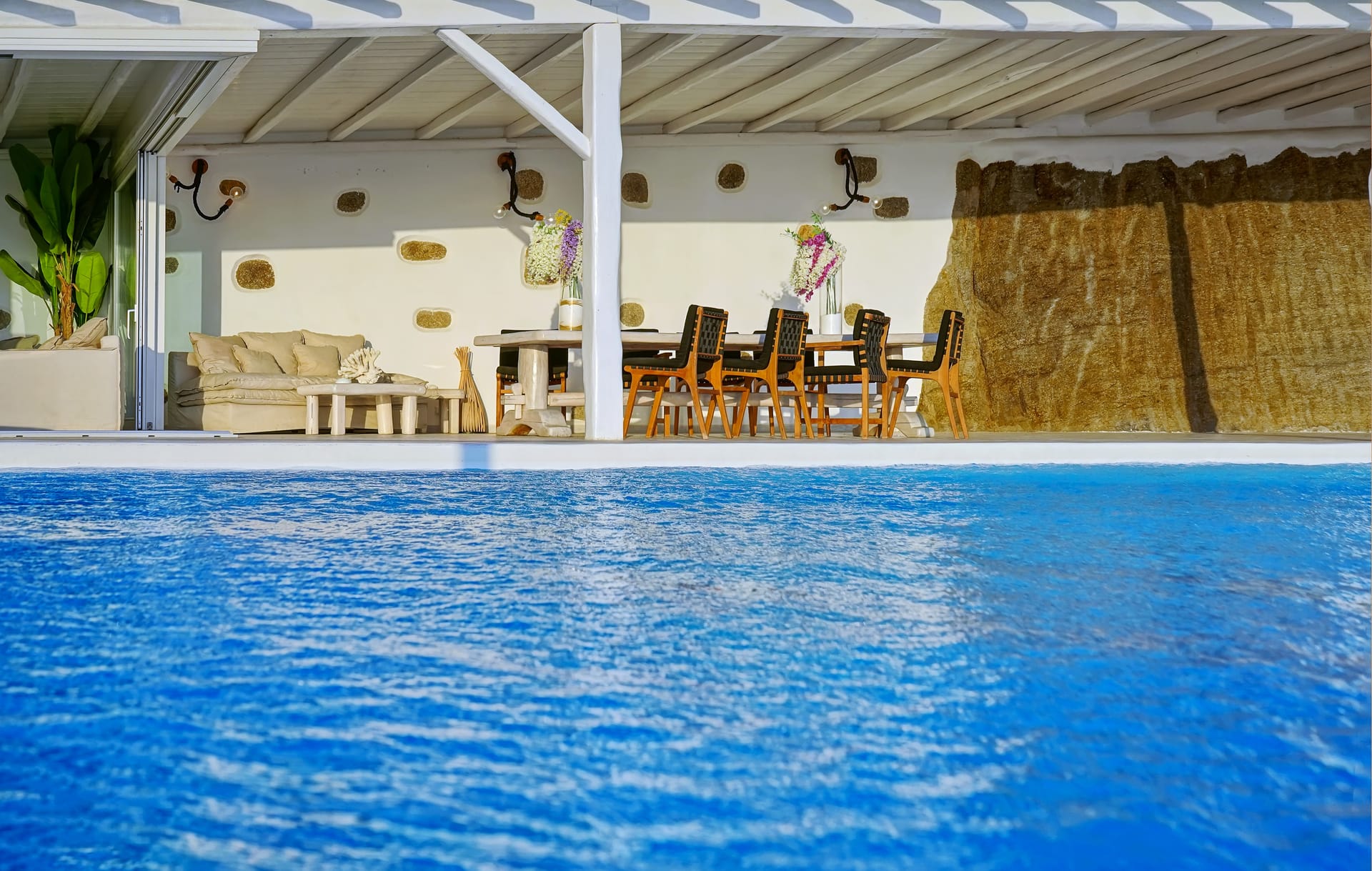 - Private swimming pool (with hydromassage feature) with pairs of sunbeds and outdoor shower. A lovely lounge area conducted by outdoors dining and bar spaces with pergola. Dining area is protected from the Mykonos’ windy weather.