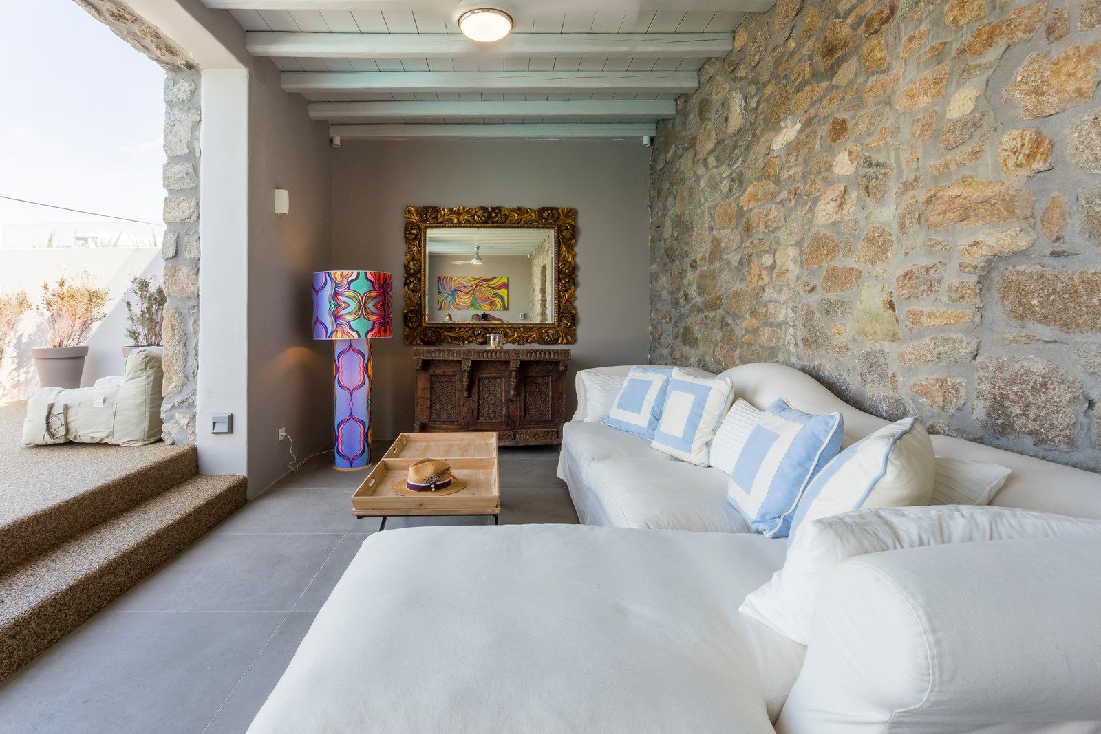 Open-air shaded lounge and dining area Sunbeds