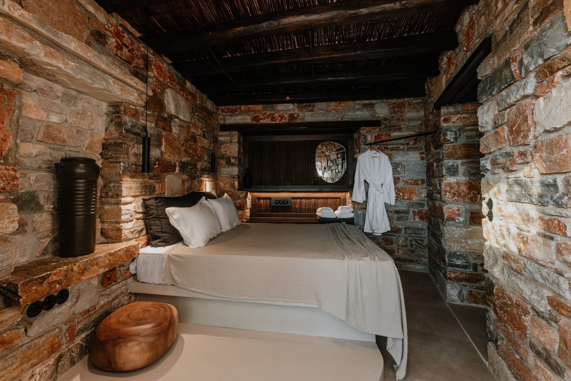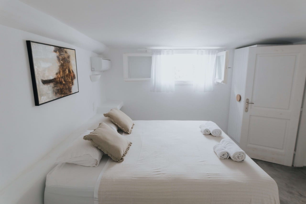 The villa features three independent levels within one building, providing ample space and privacy for up to 12 guests. The ground floor (62 m2) includes an open- plan living area with a dining area, a fully equipped kitchen, a cozy fireplace, and two bedrooms with queen-size beds. The first floor (40 m2) has a living and dining area with a fully equipped kitchen, one bedroom with a queen-size bed, and an outside mezzanine with another queen-size bed. The lower level provides an open-plan, fully equipped kitchenette, a dining area with two single beds, and one separate bedroom with a queen-size bed.