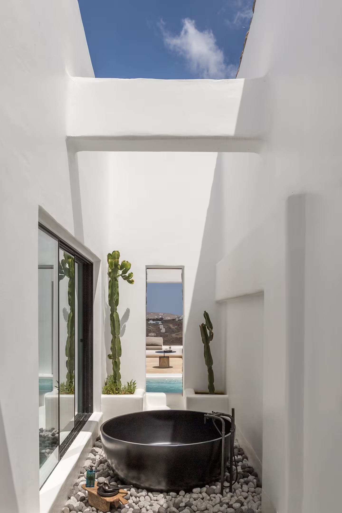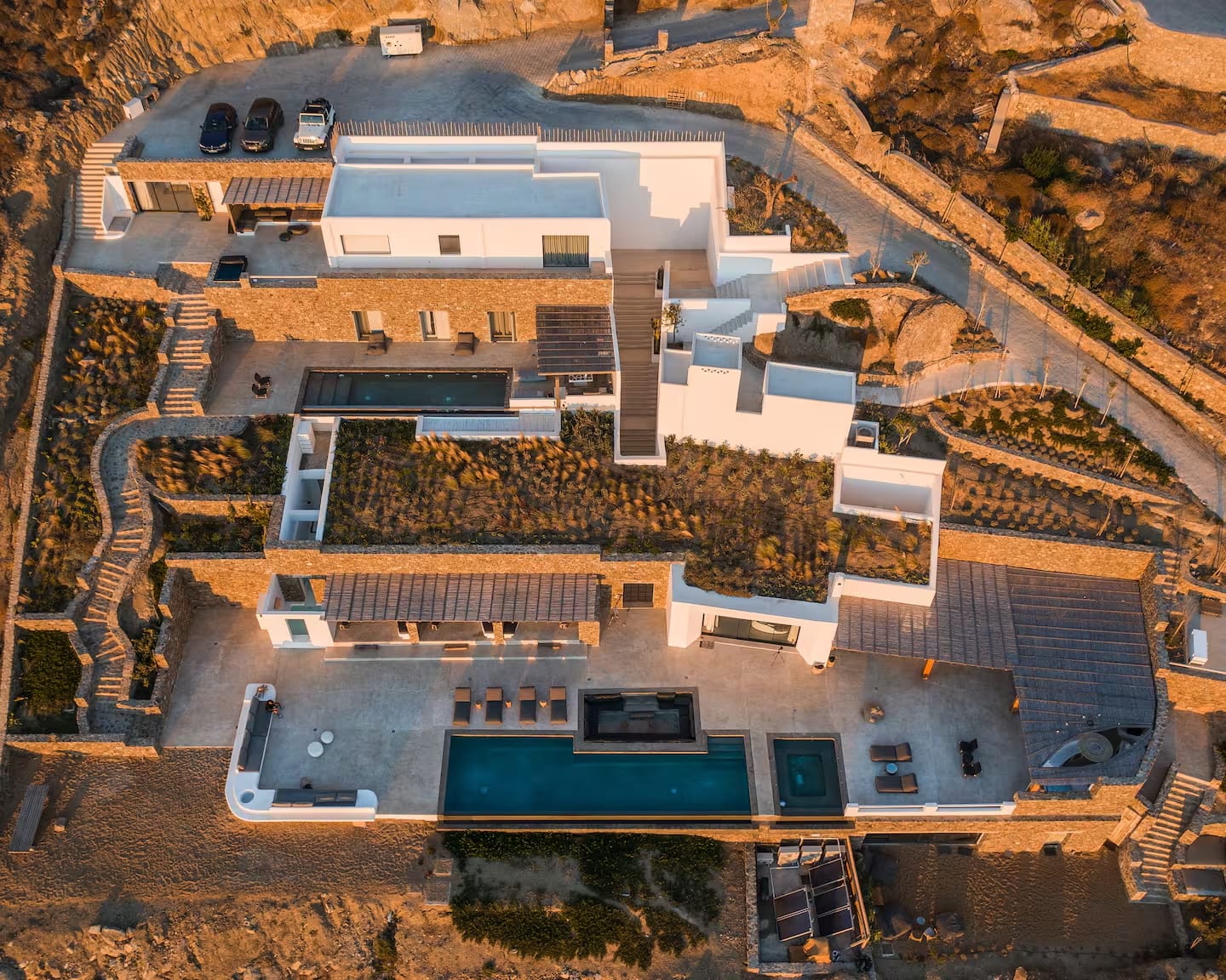 This multi-level structure, located a quick 15-minute car ride from Mykonos town, was carefully designed with one key driving force in mind, elevating the human experience through two major pylons, activation & rejuvenation. Activations are simply-it, high-energy situations like dancing, congregating, sharing & exploring. The rejuvenation side, for which our architecture plays a crucial role, focuses on relaxation, wellness, healing & catharsis.