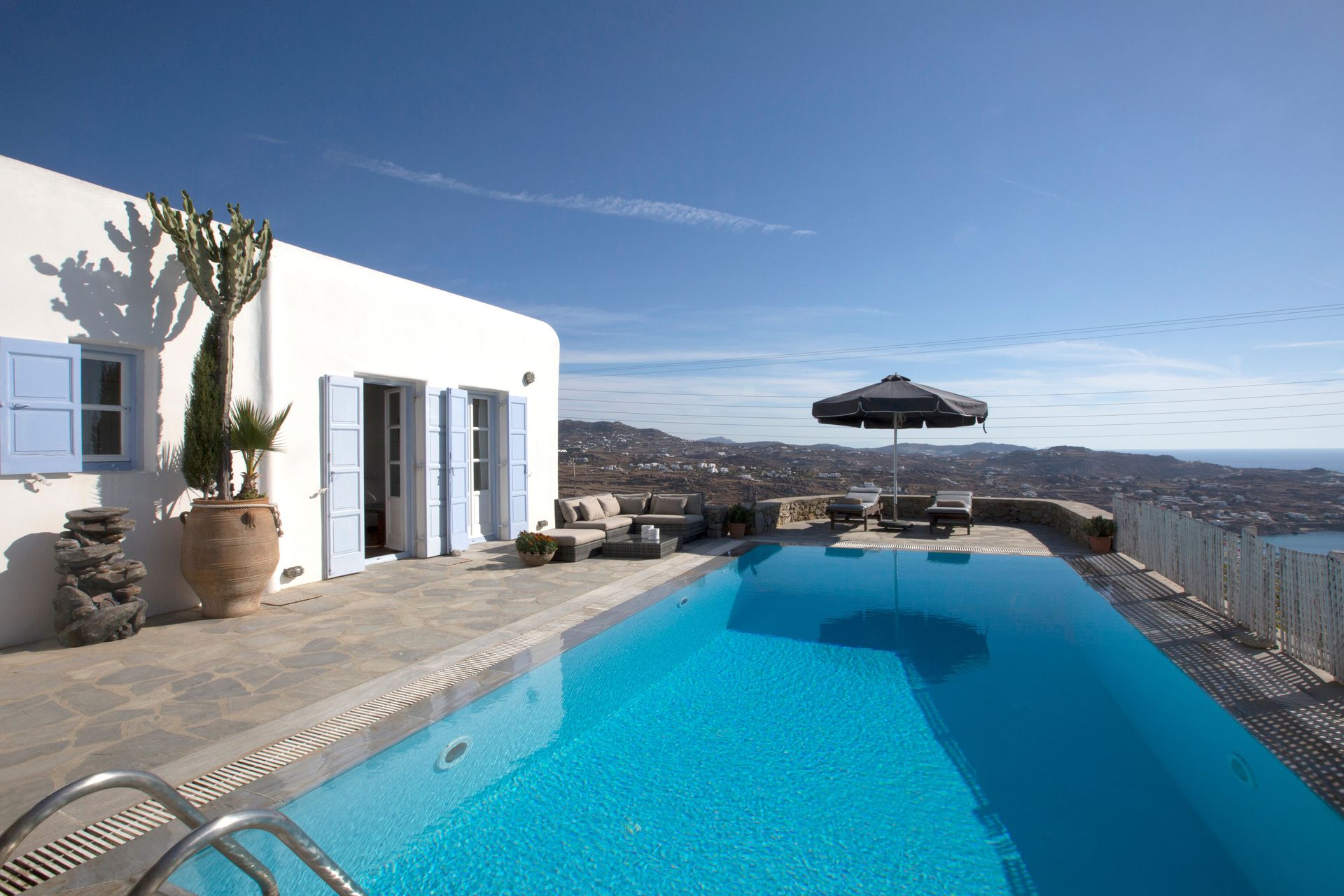 Villa Paseo is ideally located in the Agia Sofia area, offering breathtaking panoramic views of Mykonos island and the new port. The setting is private and serene, offering luxurious accommodations.