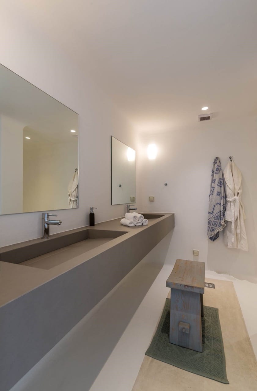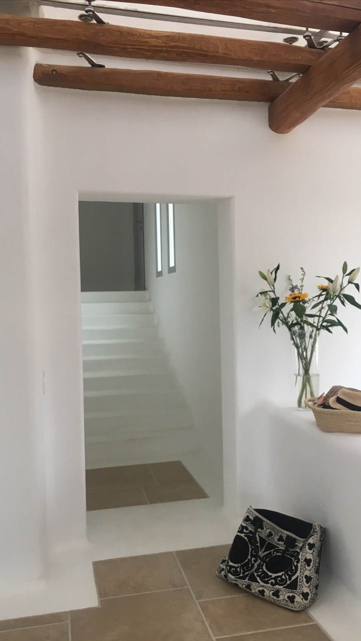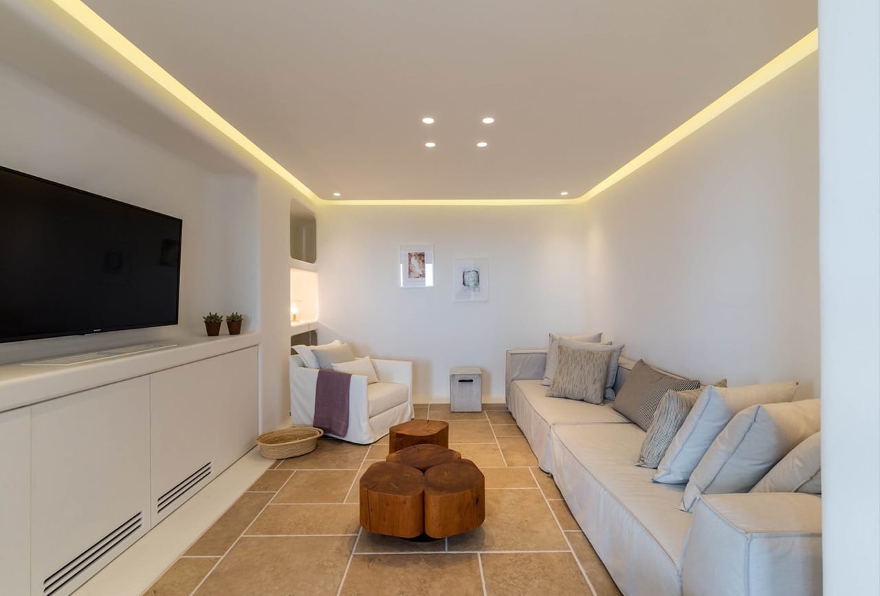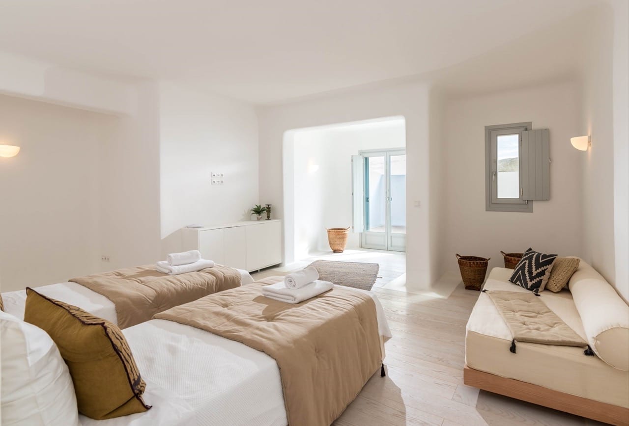 The estate can accommodate 14 guests and consists of multiple levels and 7 bedrooms total. On the upper level, the villa hosts a double bedroom with en – suite bathroom and direct access to private balcony with stunning Aegean views. On the entrance level, the guest can find an open place lounge and dinning area with direct access to outdoor area and pool, a fully Equipped Kitchen, three Double Bedrooms with en – suite bathrooms and direct access to the pool, and one Double Bedroom with en – suite bathroom and stunning views. On the lower level, there is a Double Bedroom with en – suite bathroom and access to the back yard and a Twin Bedroom with en – suite bathroom, living area and access to the back yard.