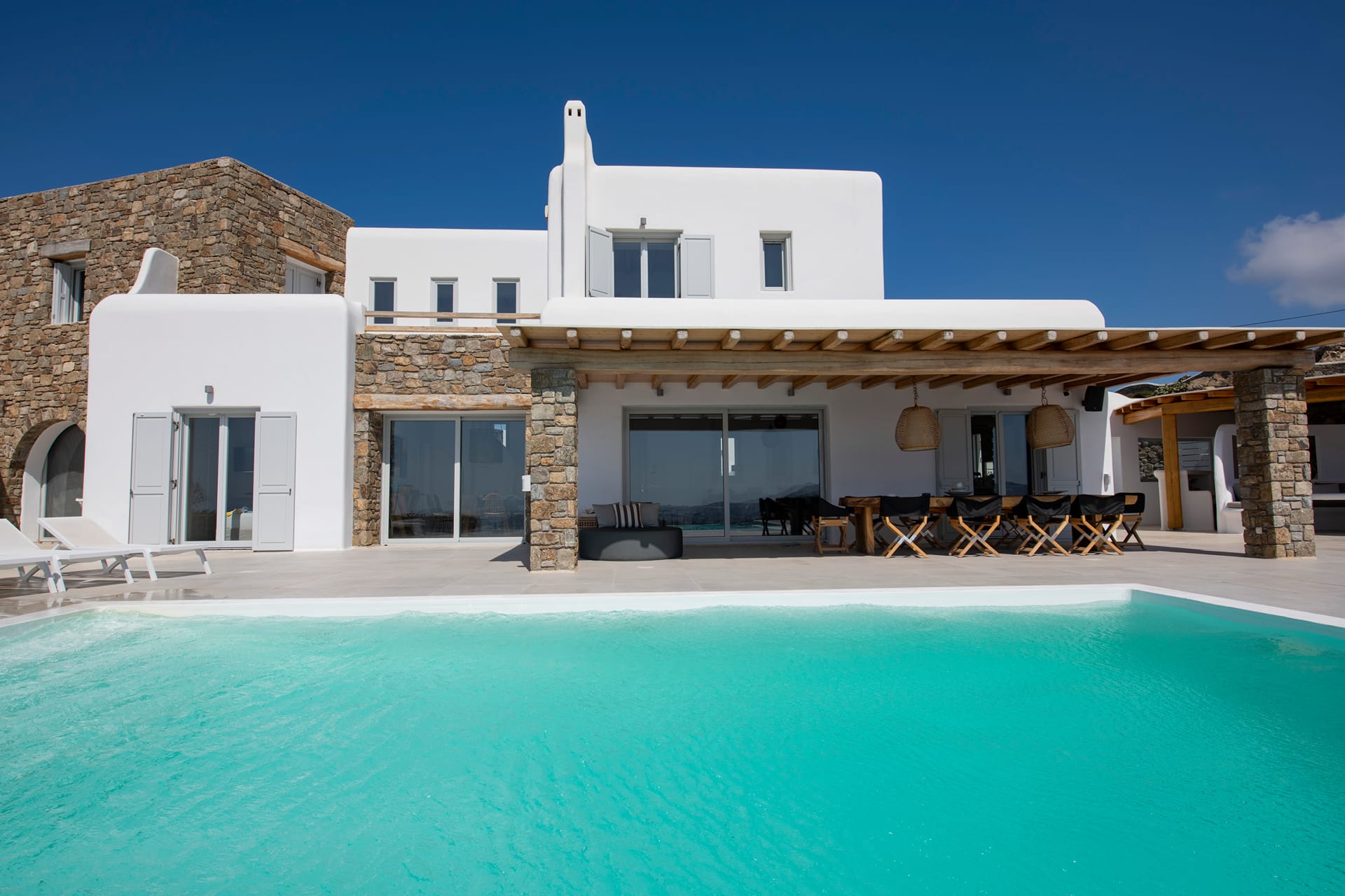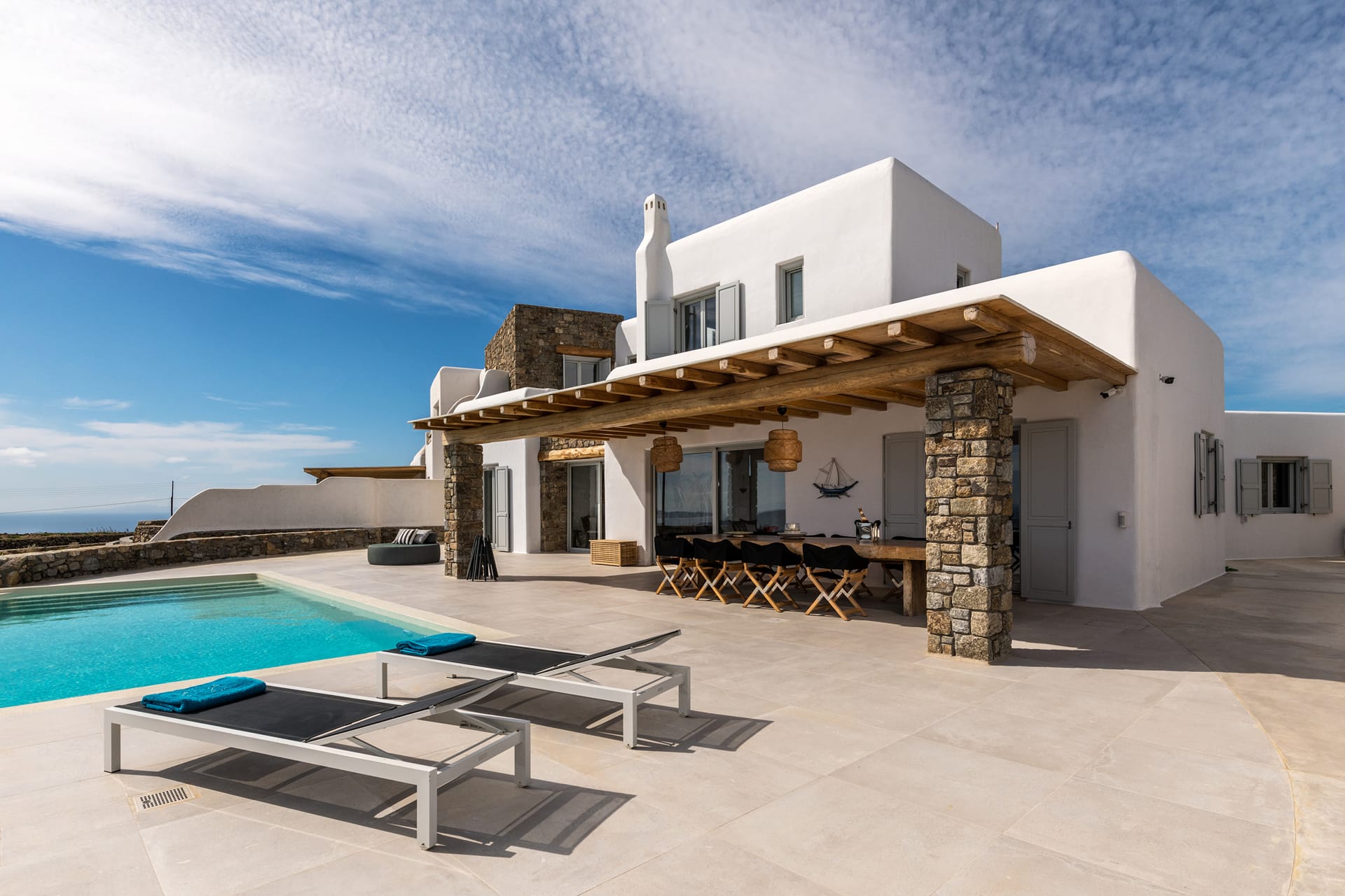 The villa’s separate units provide privacy for guests, yet the shared indoor and outdoor spaces are thoughtfully designed to enjoy this summer retreat together. Whether relaxing by the uniquely shaped private pool or taking in the panoramic vistas, Villa Paloma perfectly balances comfort, style, and the charm of Mykonos.